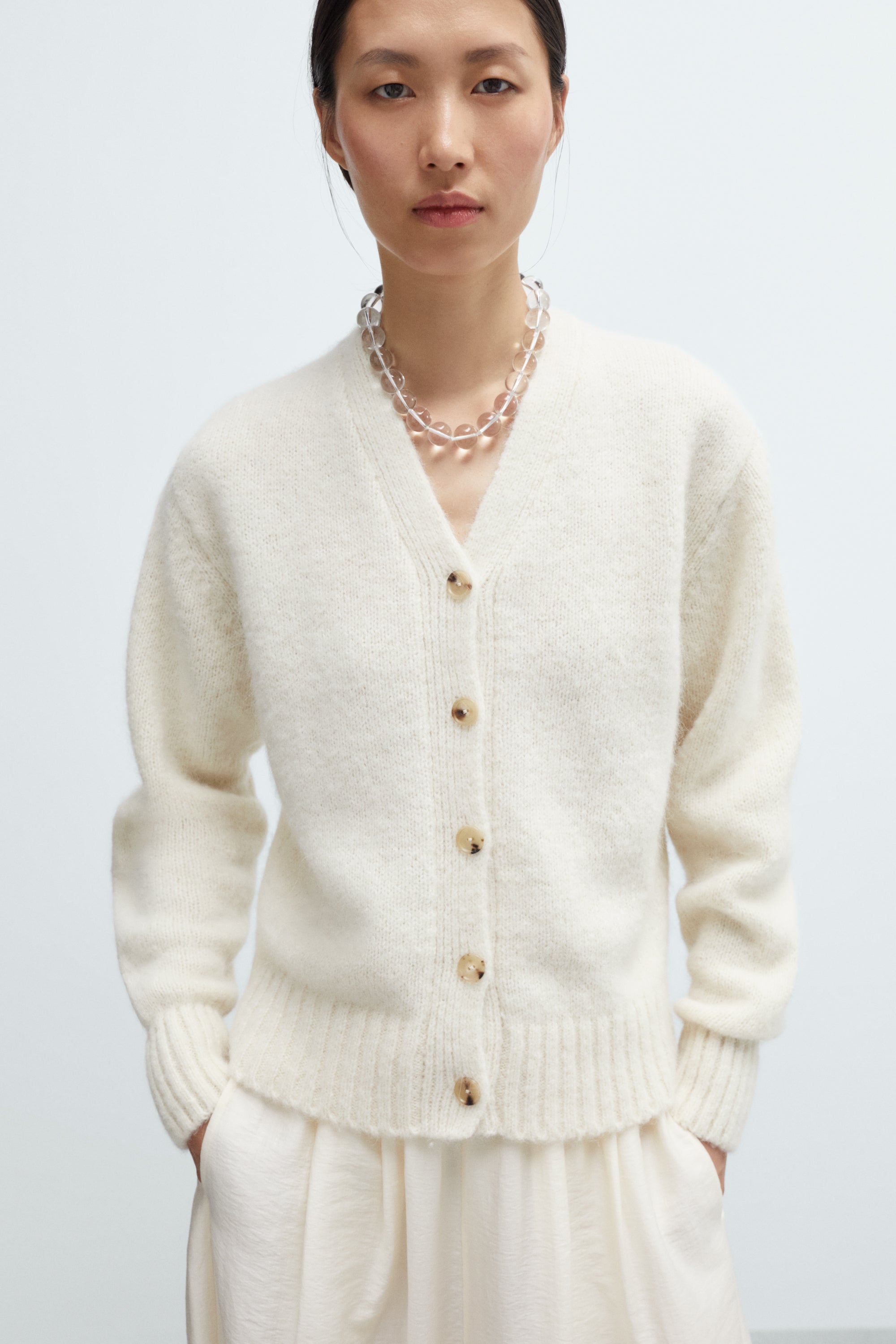 This classic cardigan is crafted from soft baby alpaca wool and designed in a regular fit for everyday comfort. It features a flattering V-neckline and medium-sized button closure down the front. Long sleeves are finished with chunky ribbed cuffs, mirrored at the hem for a touch of structure. A timeless essential in an staple hue, perfect for layering across seasons.