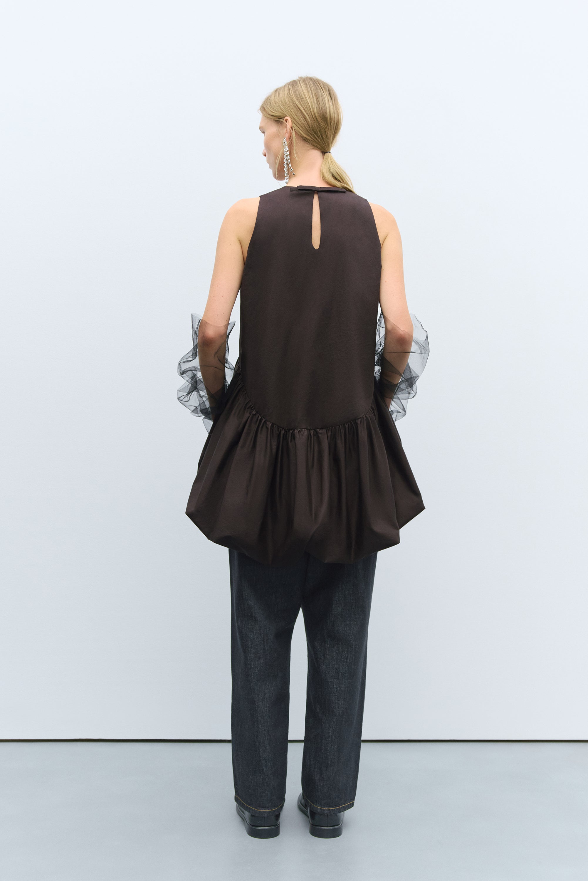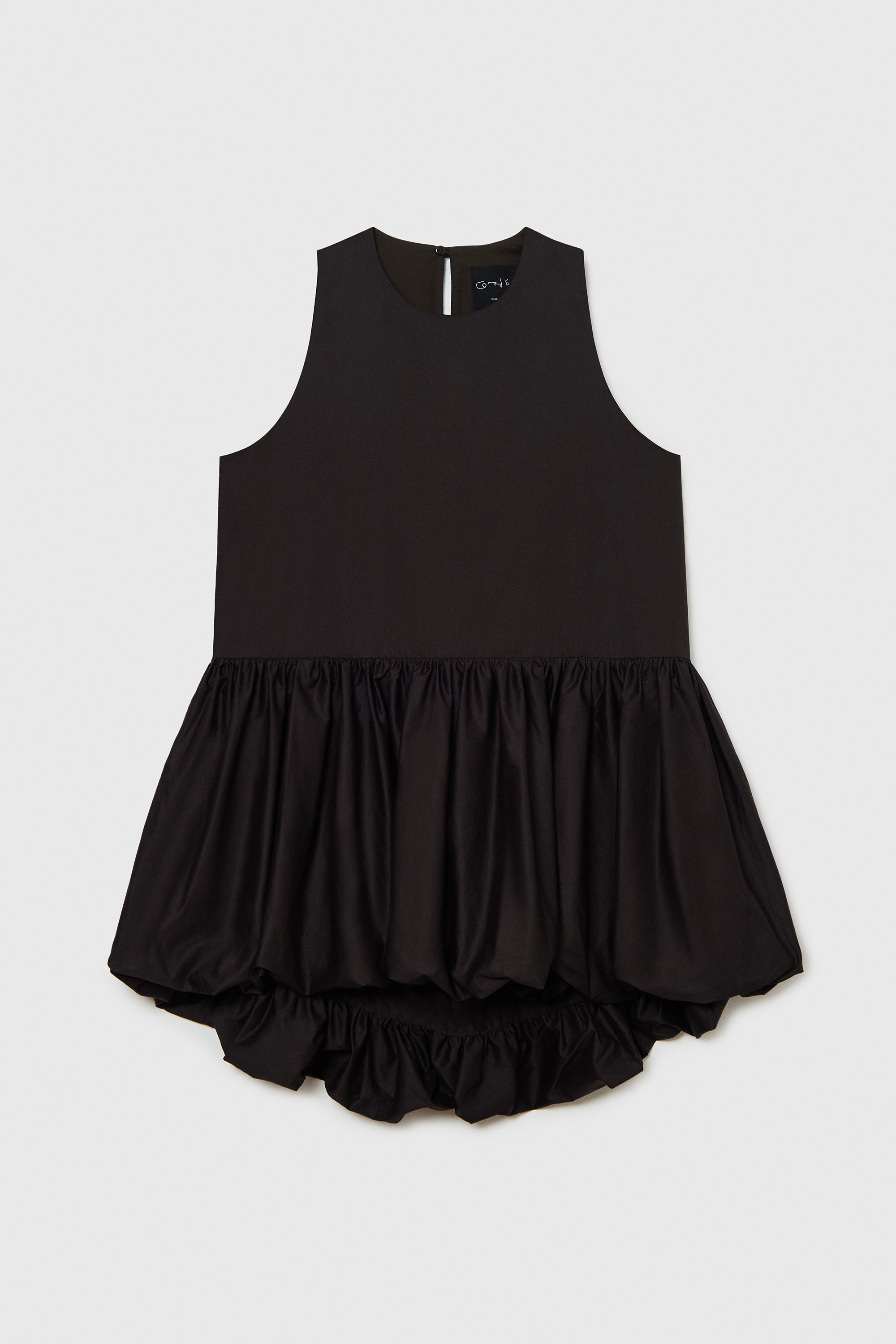 A minimalist dress with a balloon silhouette, featuring a light and comfortable fabric, round neckline, and a charming teardrop button closure at the back, finished with a dainty bow. Both elegant and casual, this versatile piece is perfect for layering or wearing on its own.