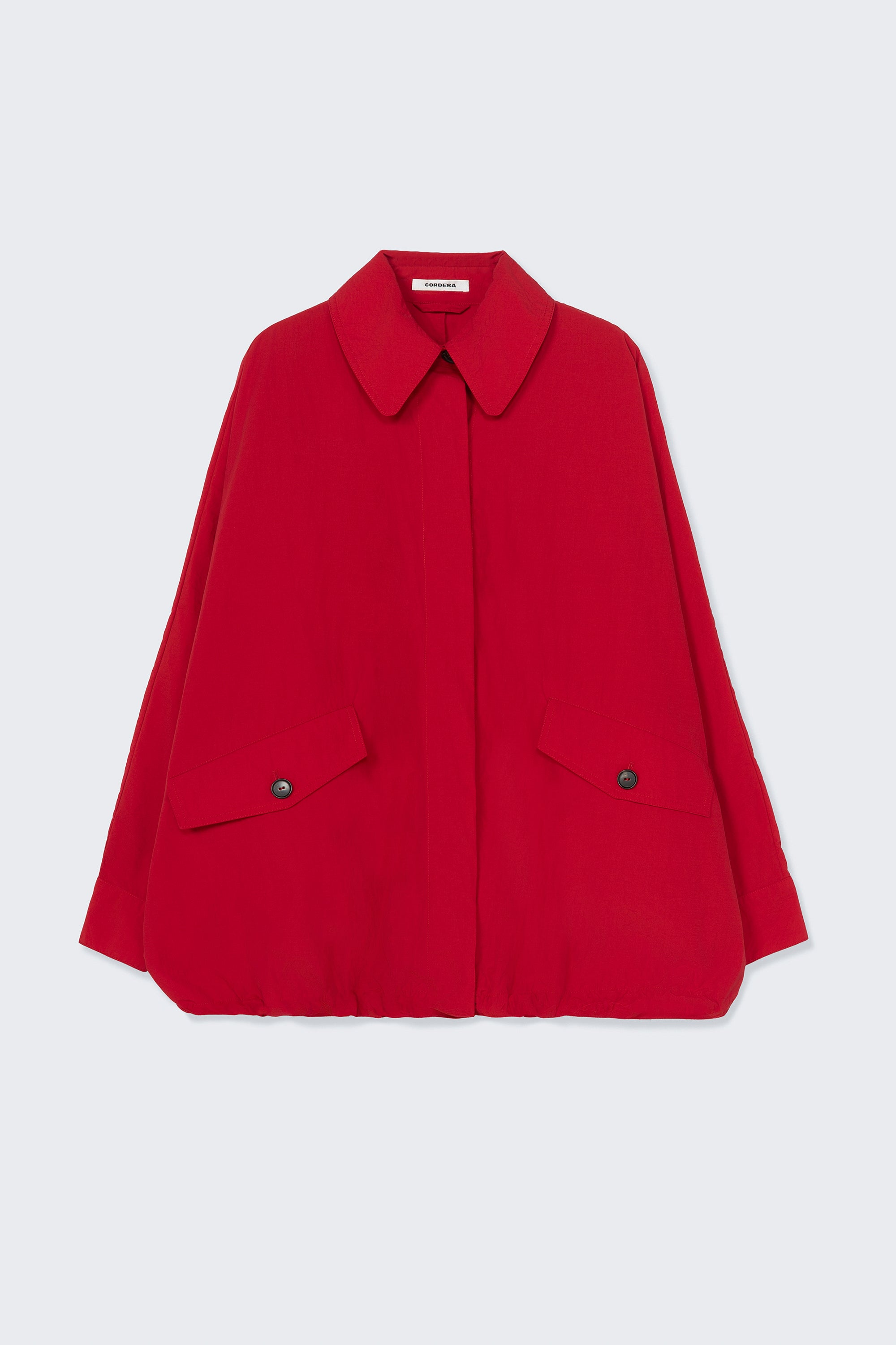 An oversized cocoon-shaped jacket with batwing shaped sleeves. The hem is softly cinched with elastic, creating a modern gathered effect. Large patch pockets with button closures add utility to the design, while the concealed button placket fastens neatly up to the collar. Finished with a rounded peak collar, this super-light piece blends comfort and style effortlessly.