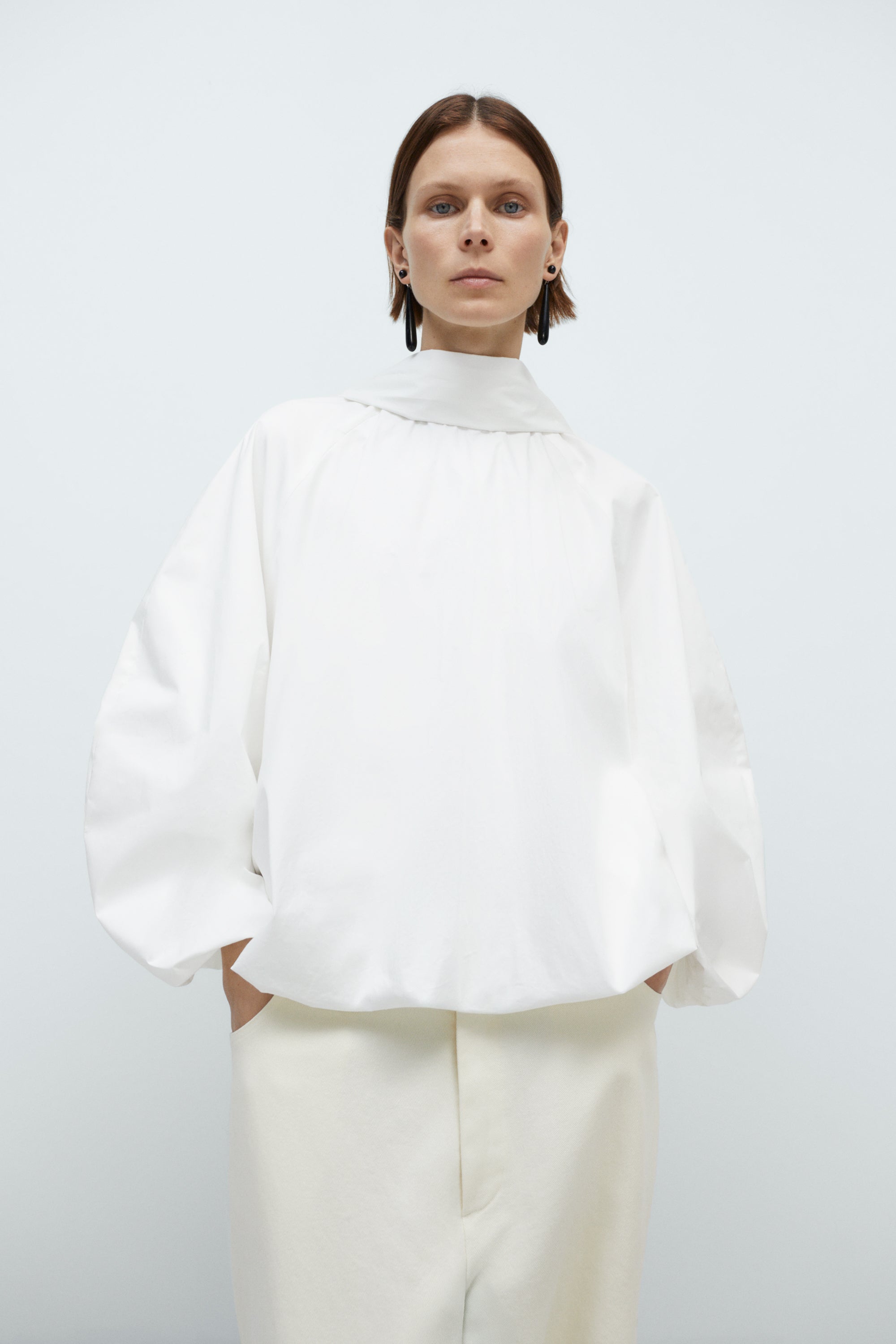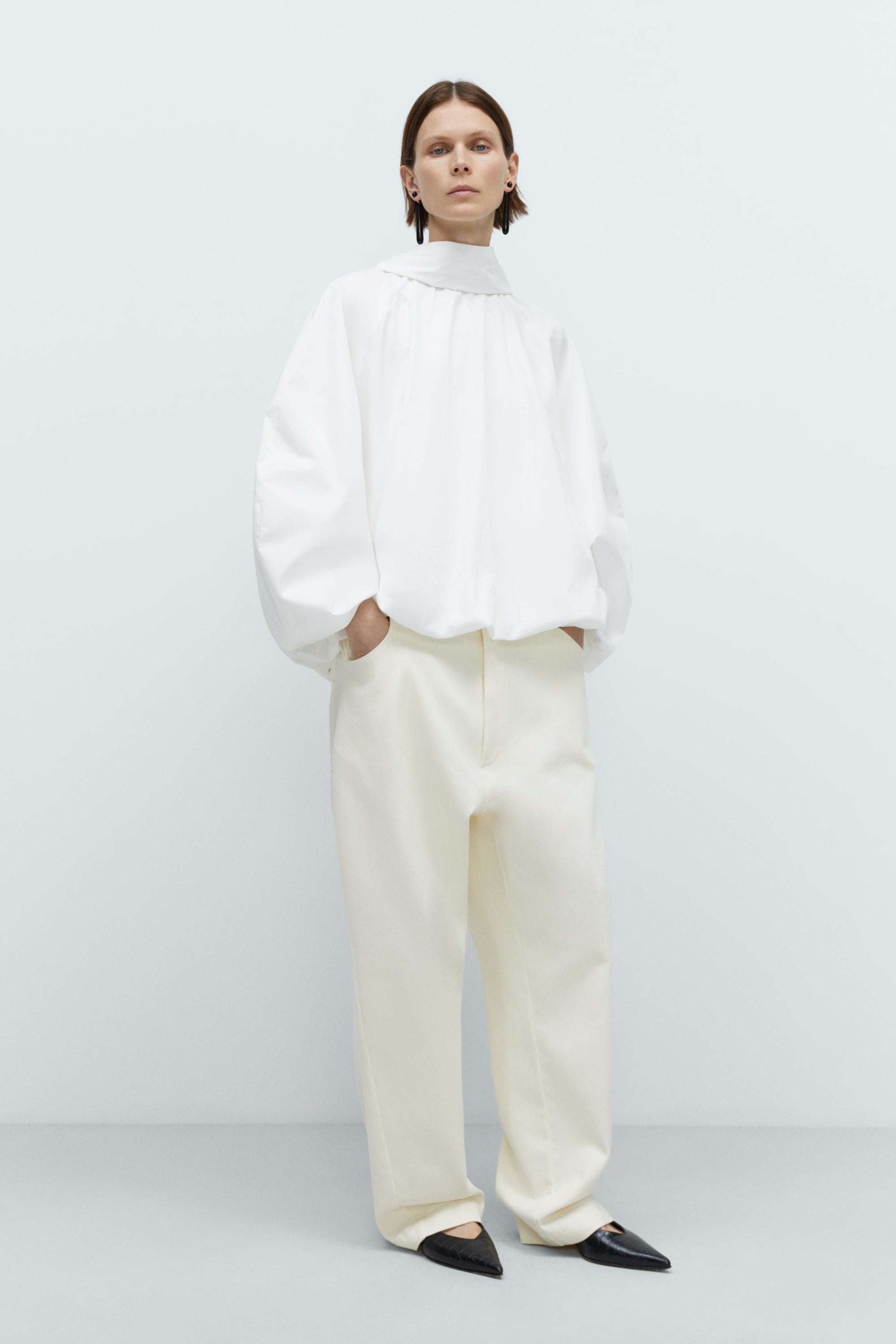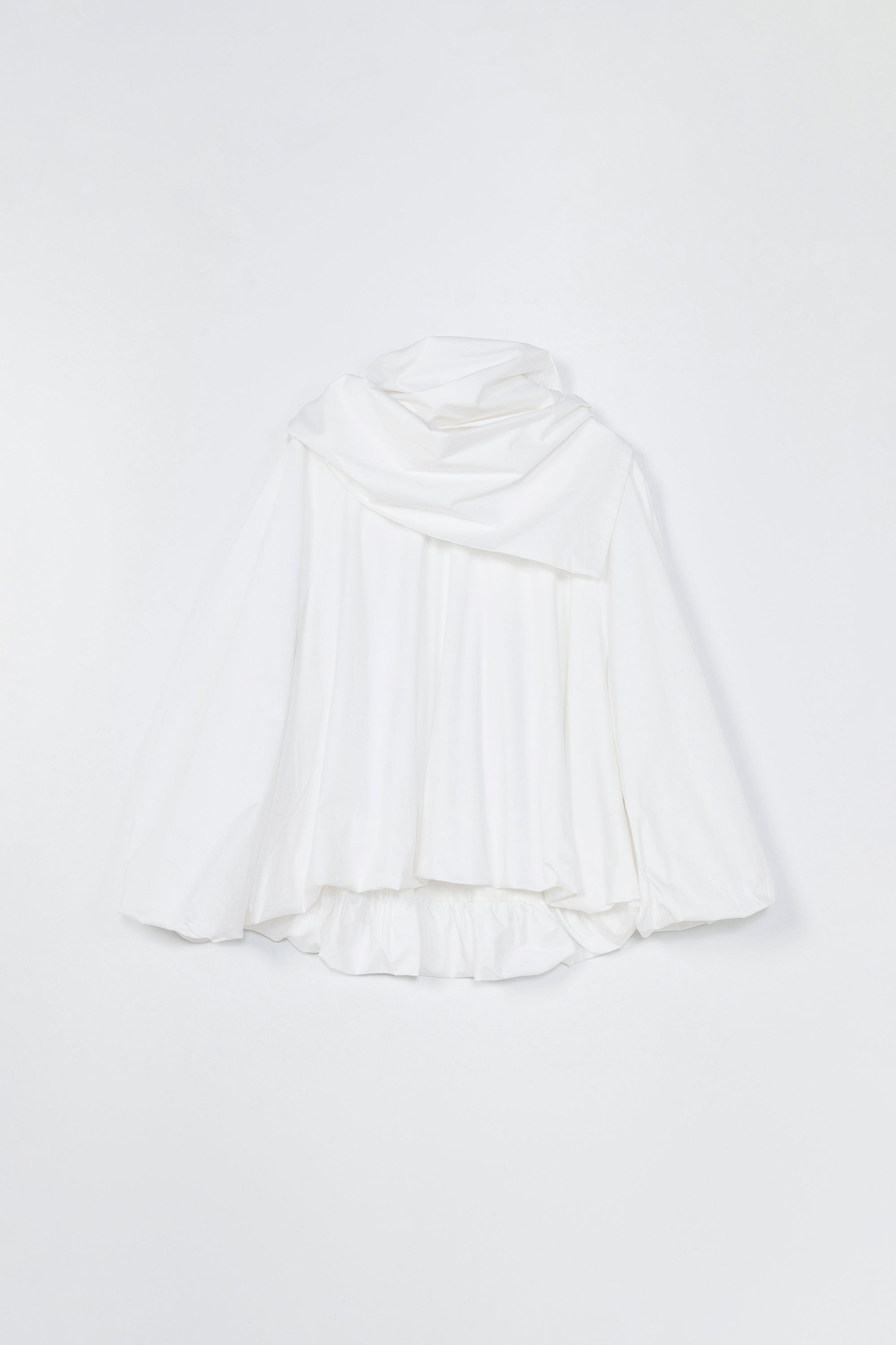 A balloon silhouette defines this beautiful shirt, detailed with voluminous sleeves and a versatile neck tie. It fastens at the back with a small button that finishes the keyhole opening at the top. Side pockets add extra comfort, while the fabric’s texture is soft to the touch.