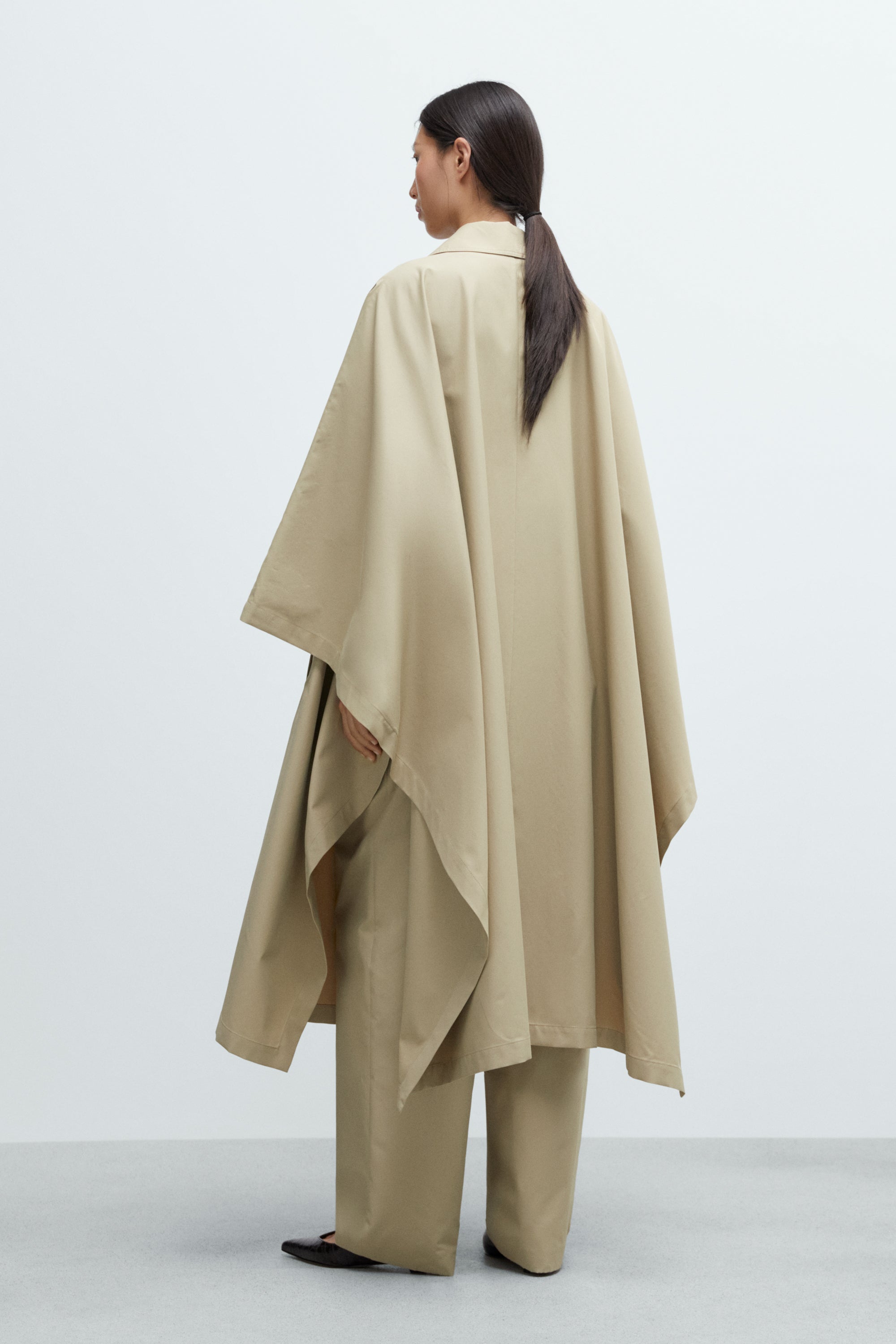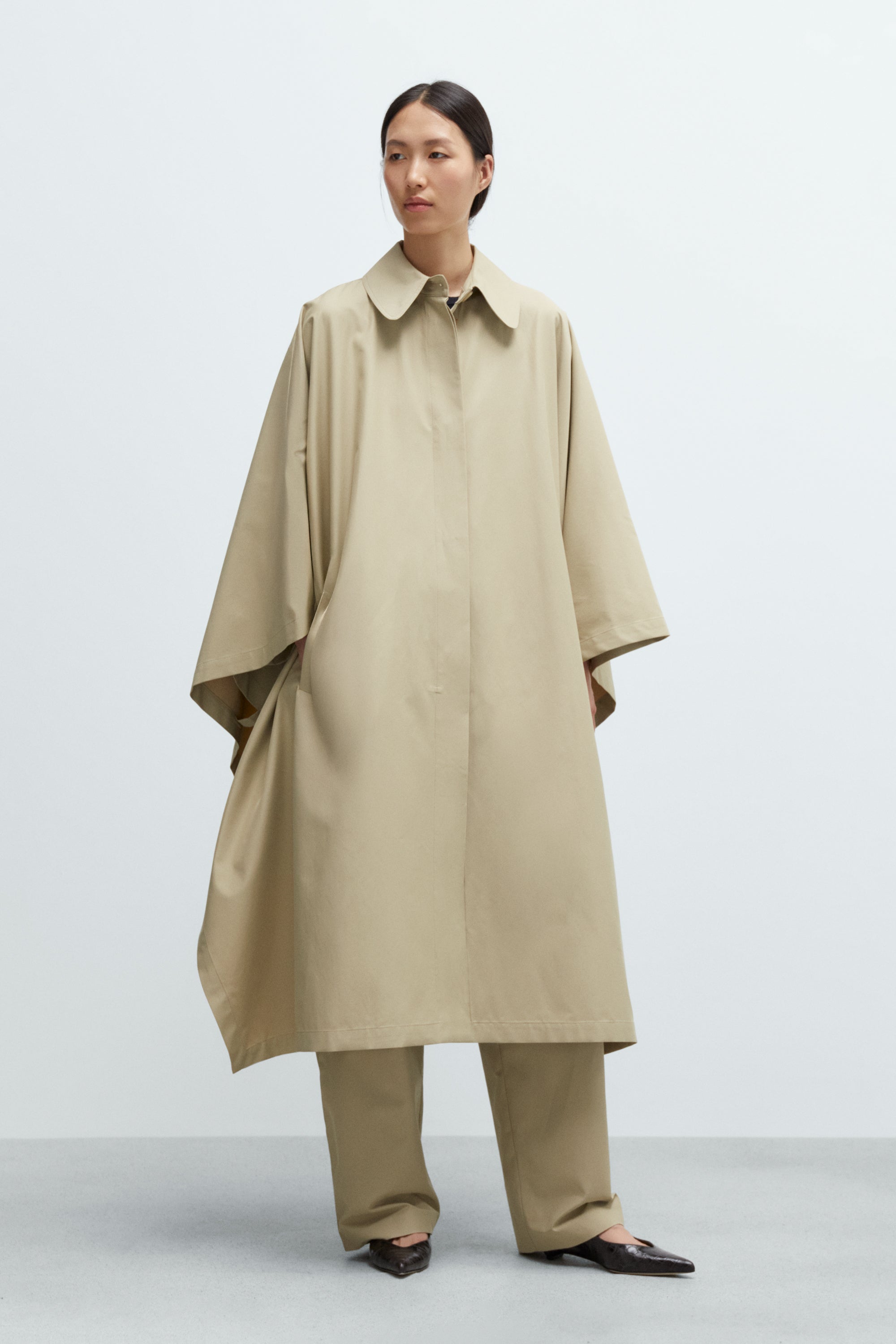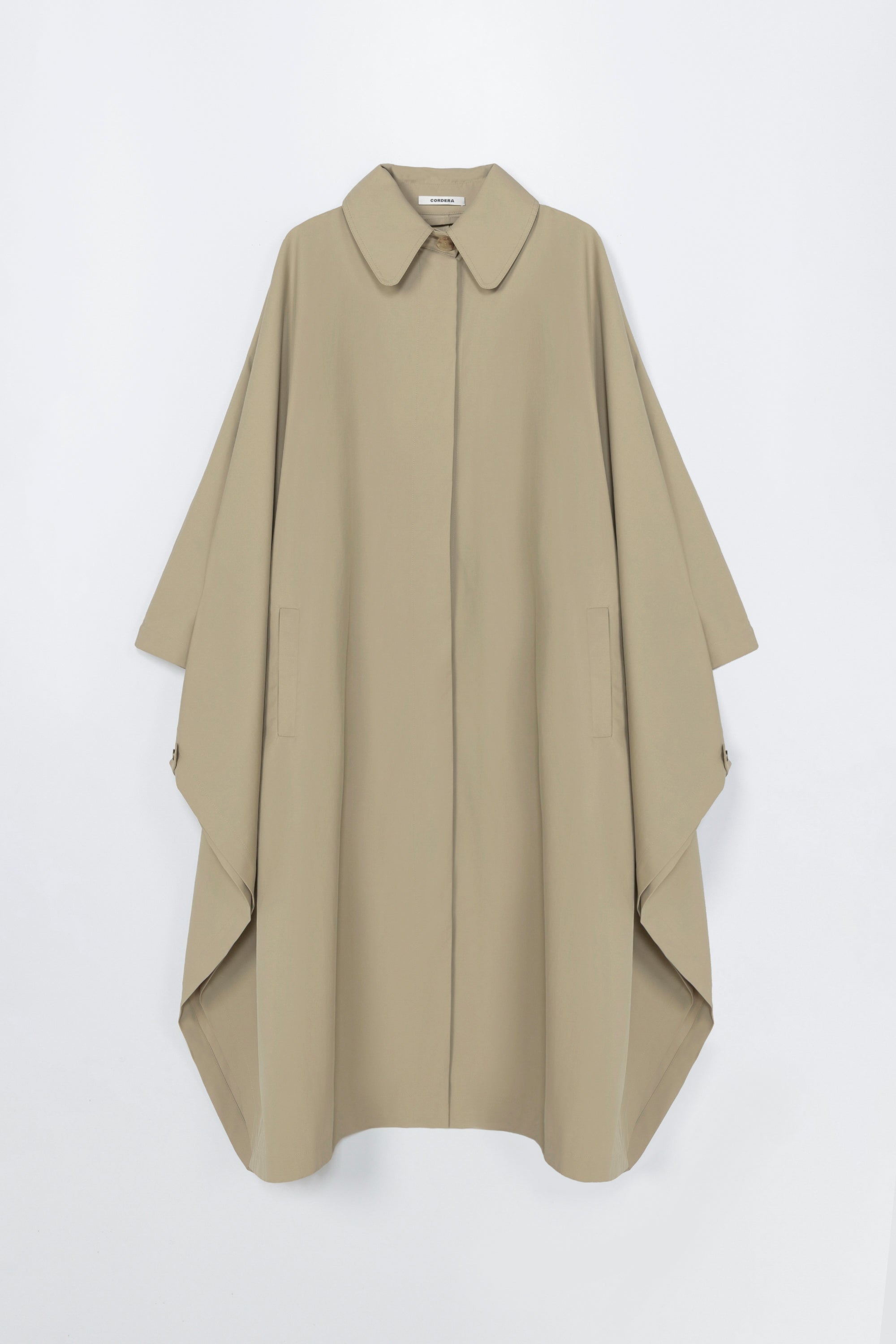 This piece combines the classic elements of the trench coat and cape. An oversized maxi-length cape with a spread collar and button closure running all the way down, with only the top button visible. It features front pockets and a flowing cape shape, secured with side buttons for a clean silhouette. Perfect for layering over any outfit.