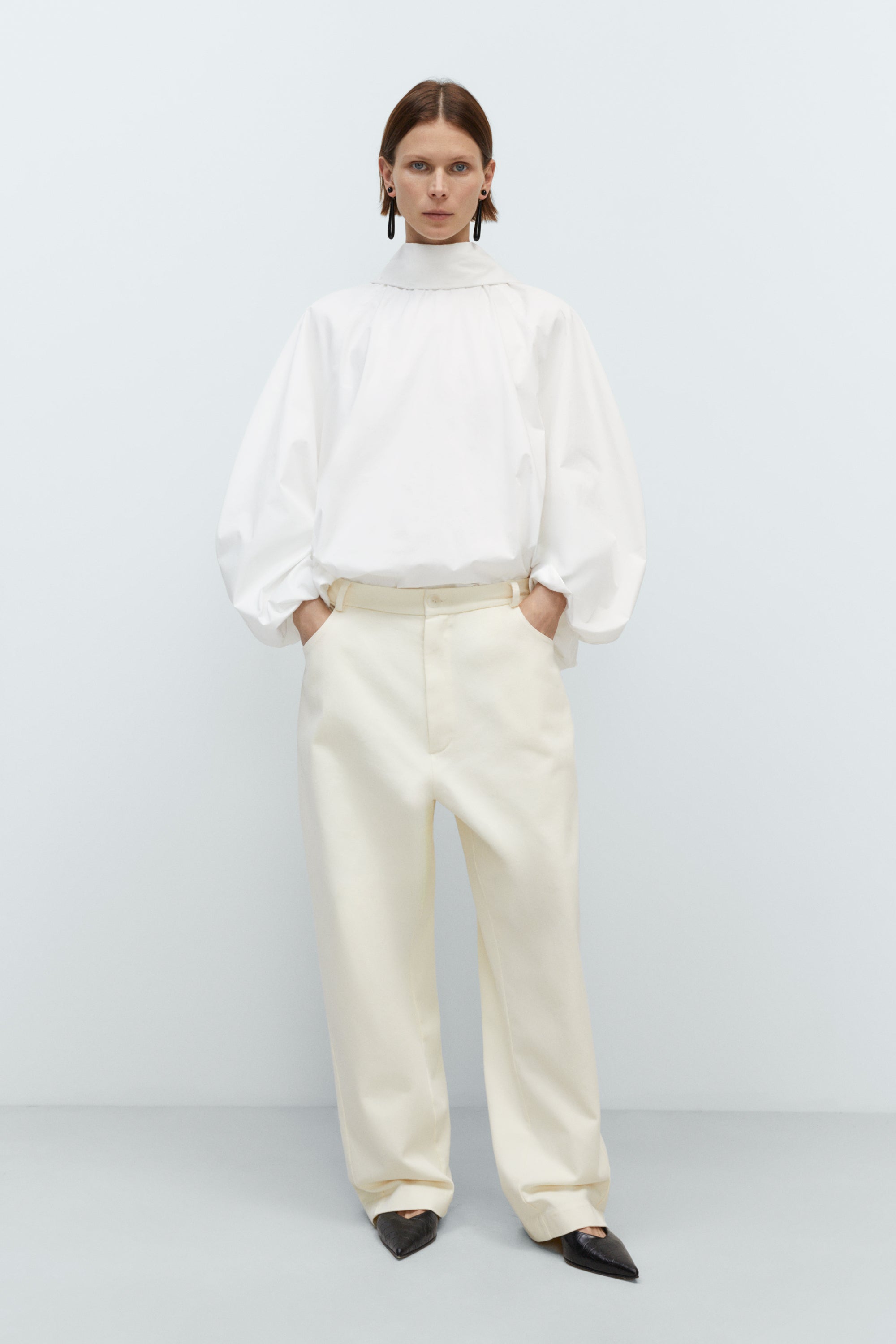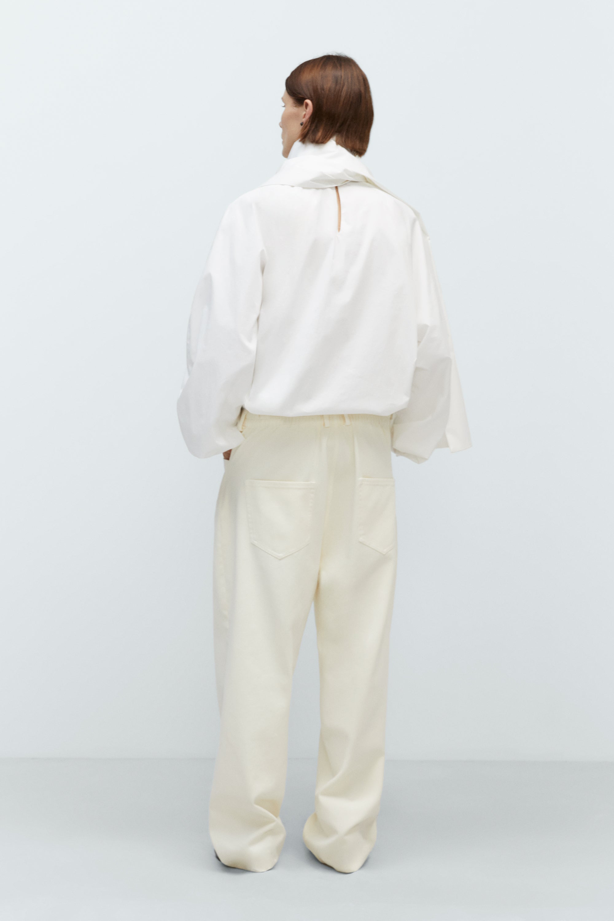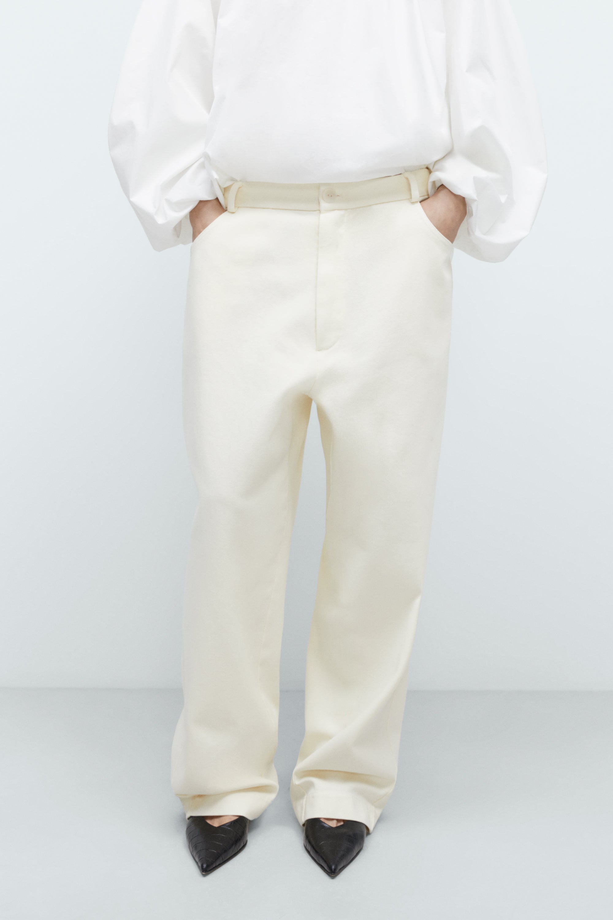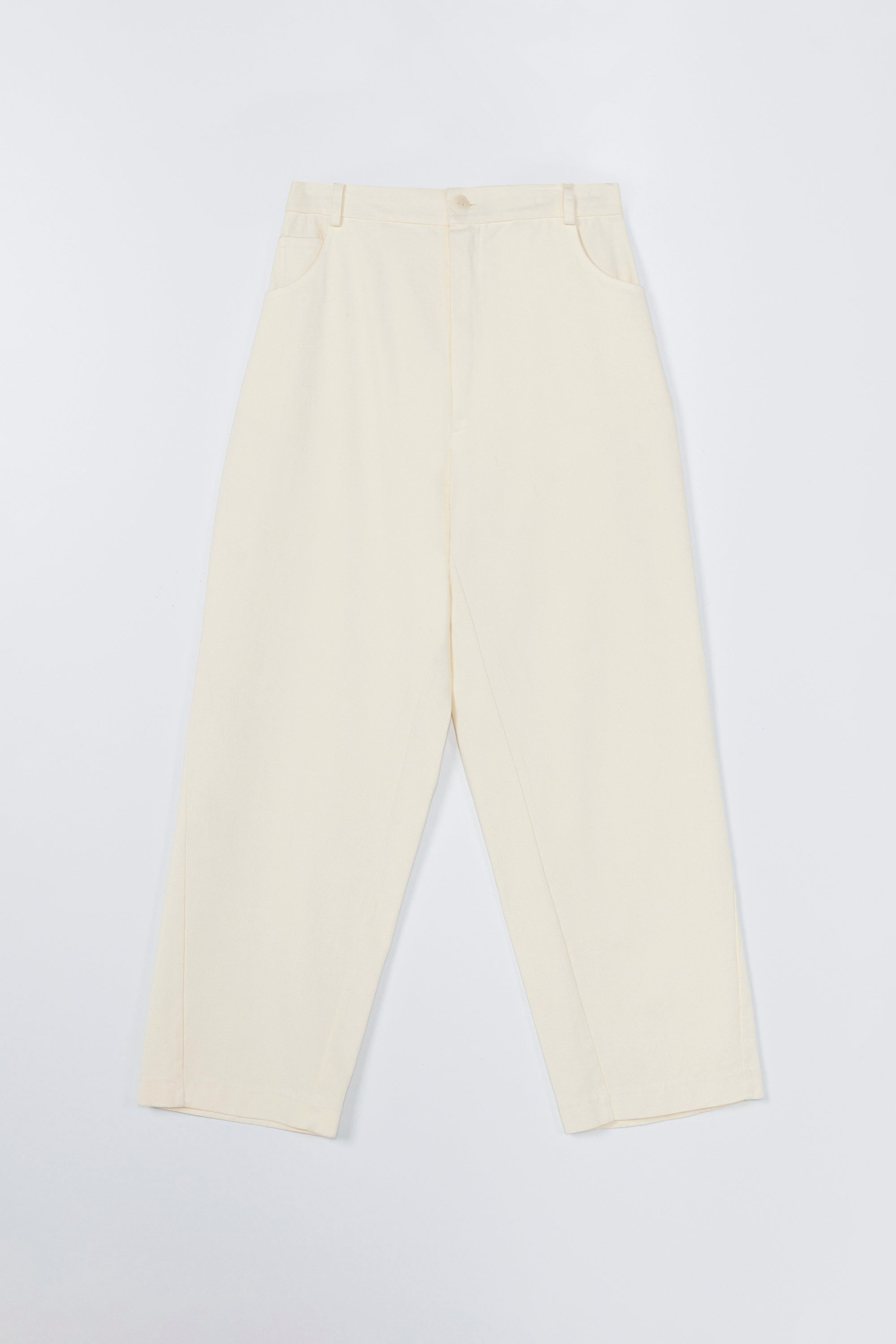 Designed for everyday use, these pants feature an elastic waistband at the back, a high rise, and a straight leg. They are finished with side and back pockets, as well as a zip fastening with a button closure. Detailed with sweeping seams that curve around the leg and include belt loops.