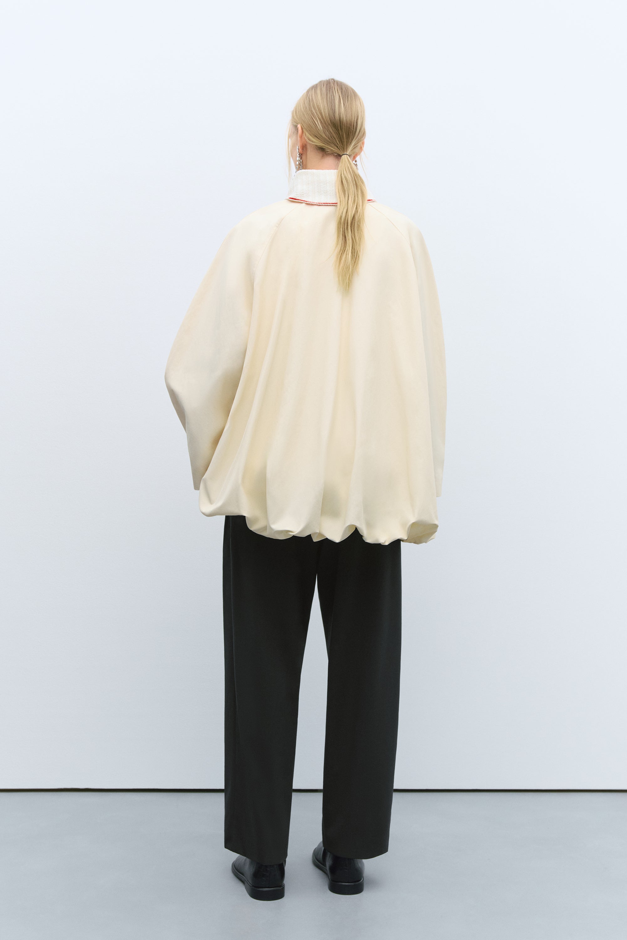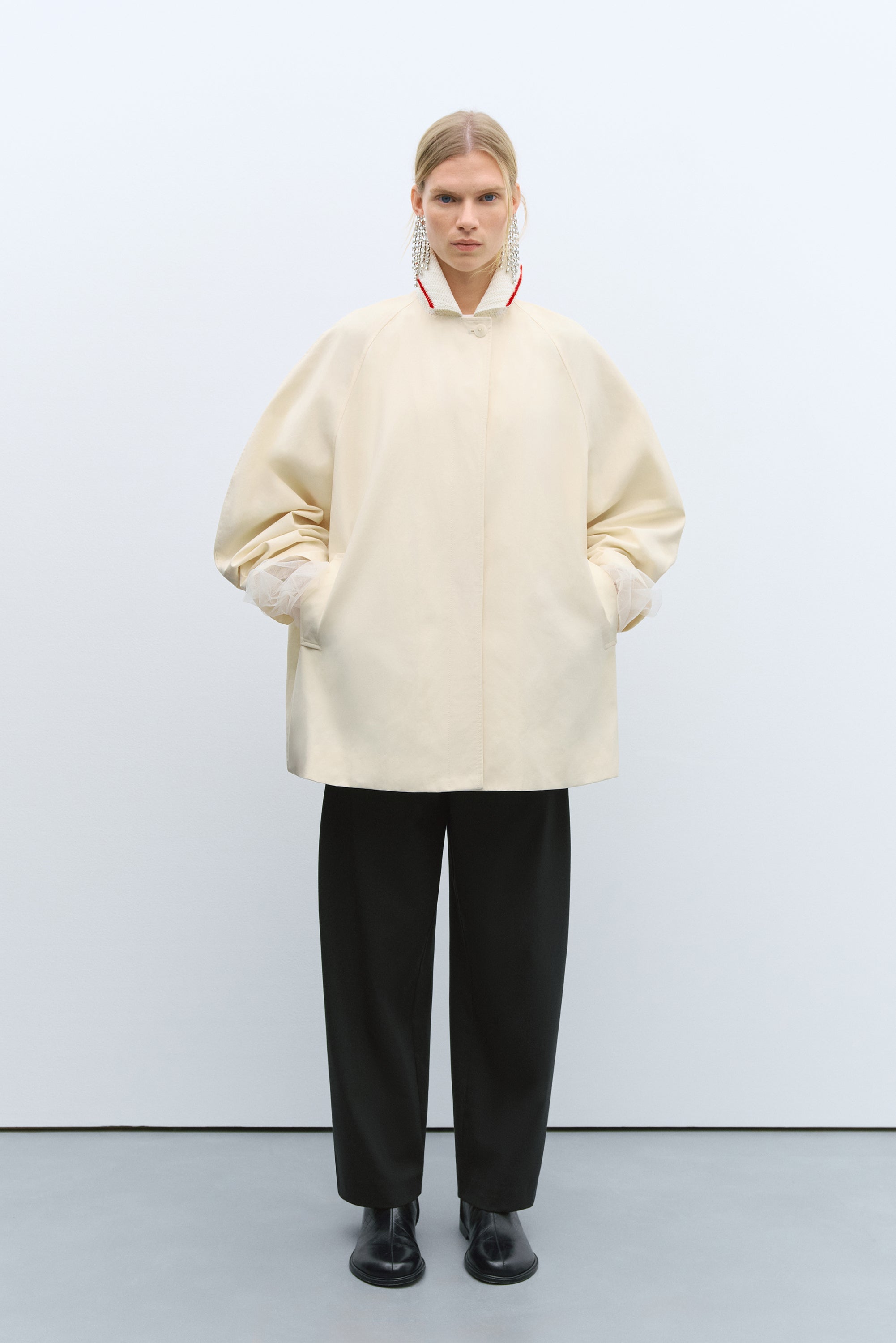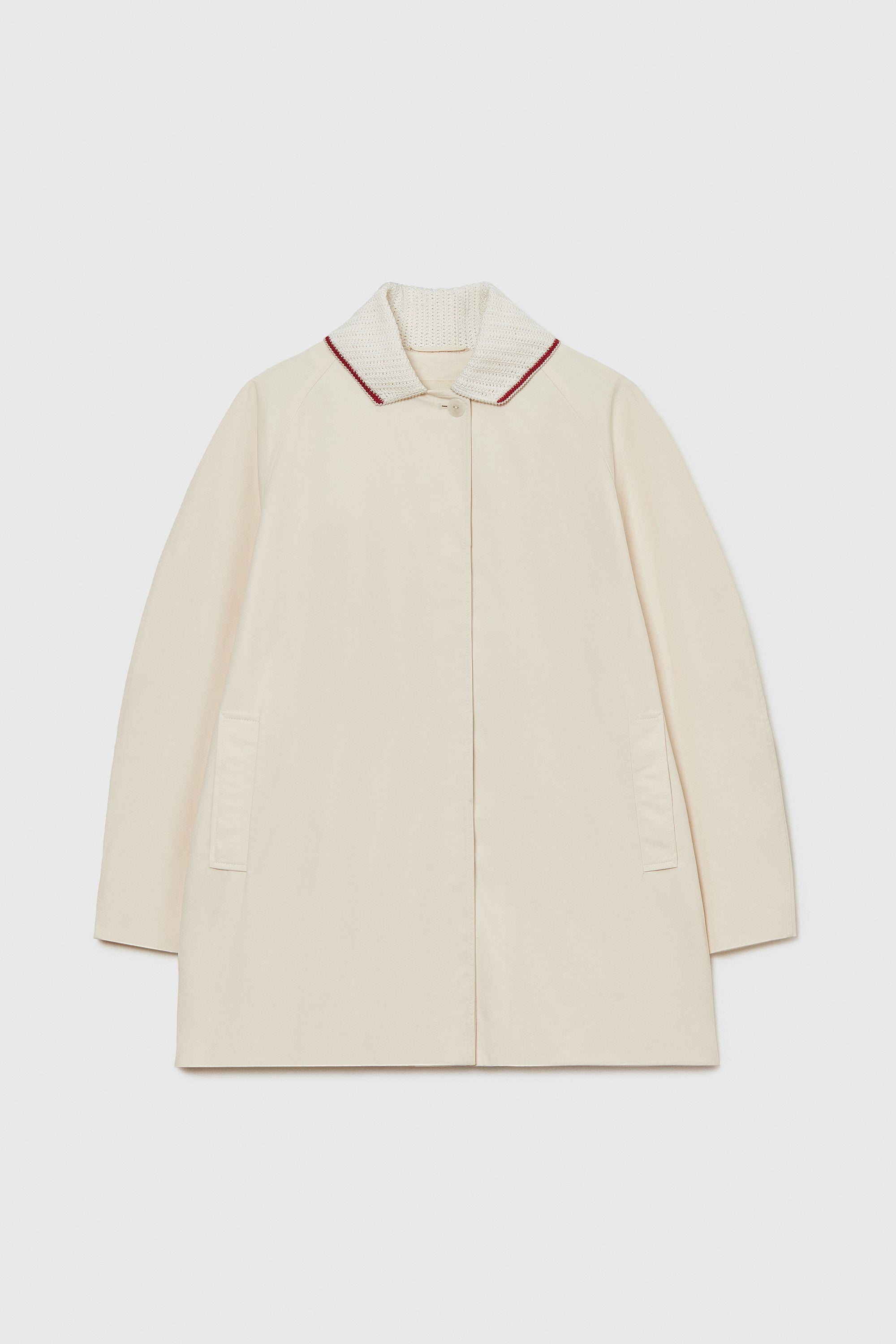 This mid-length jacket in ecru is elevated by a handmade crochet collar in contrasting white and red. It features side pockets, a button-front closure with a flap, and a visible button at the neckline. The back is designed with a balloon silhouette, offering a relaxed fit. A special addition to your timeless wardrobe.