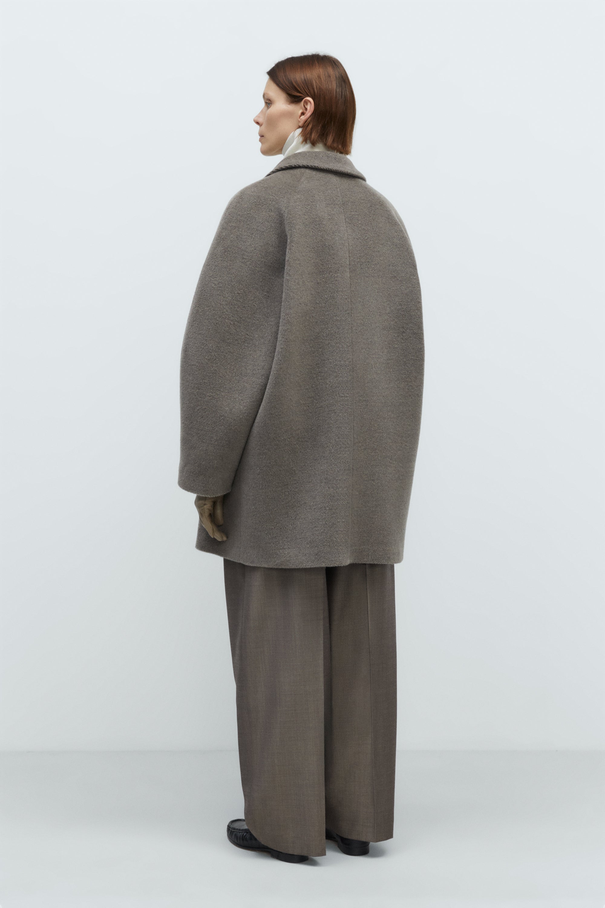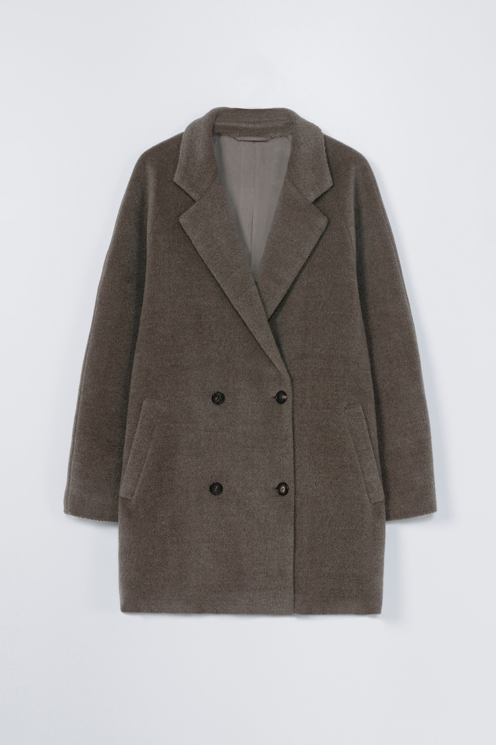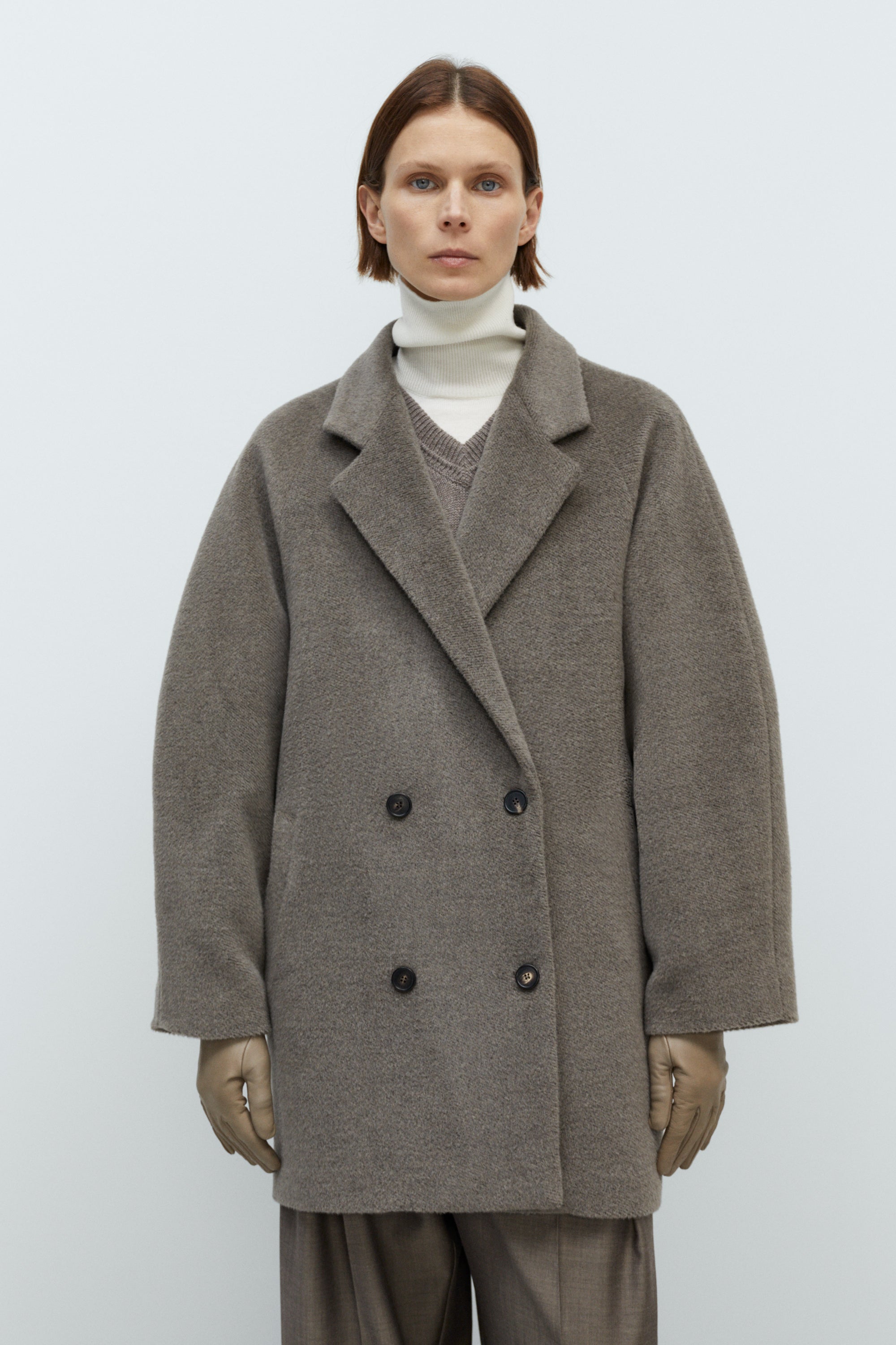 Short coat with a classic cut, yet a contemporary design and an oversized fit. Made from soft and warm high-quality Virgin Wool. Detailed with a lapel collar, double-breasted front horn button closure, and side pockets. Finished with a fully lined interior in 100% Viscose.