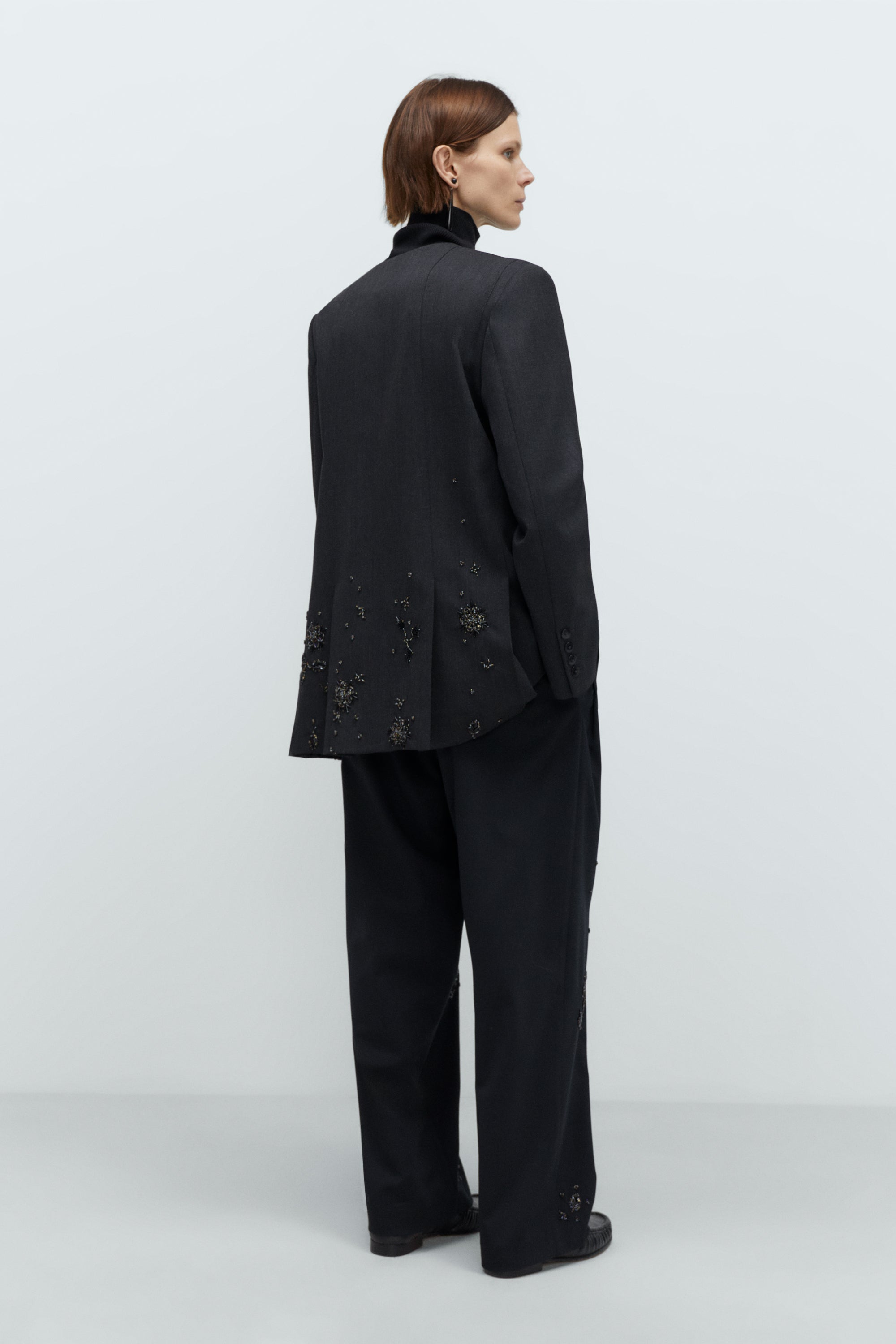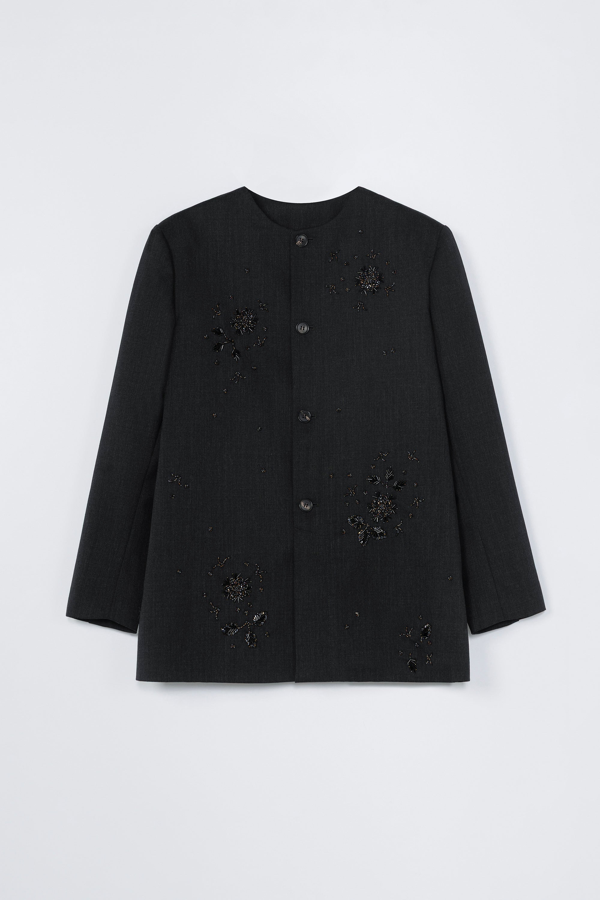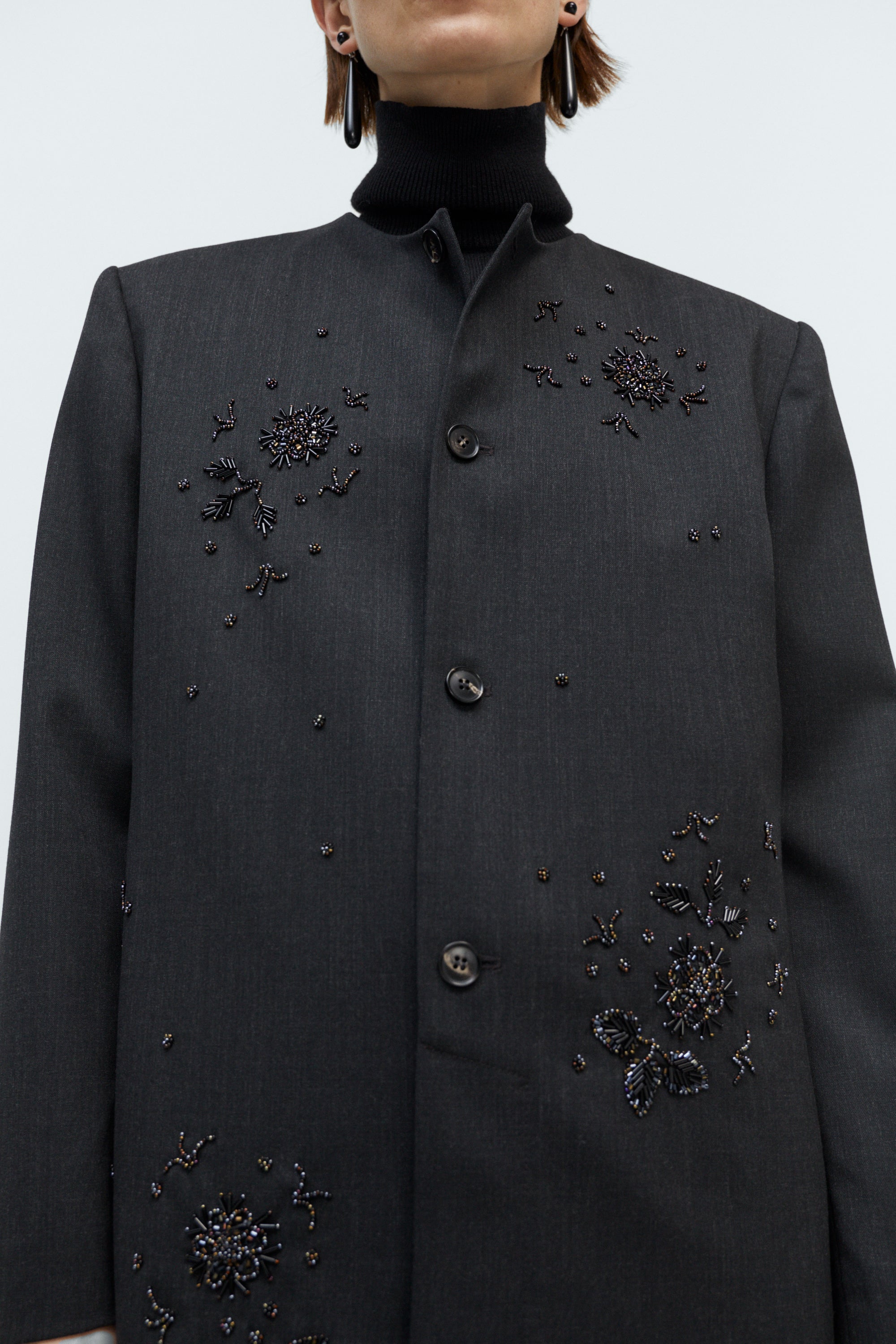 The perfect balance between elegance and versatility. Designed with a regular fit that flatters your silhouette, it features a hand embroidered embellishment, long sleeves and a round neckline for a minimal touch. The front horn button closure adds a refined detail, while the side pockets bring practicality. The pleated accents on the back offer movement and sophistication.