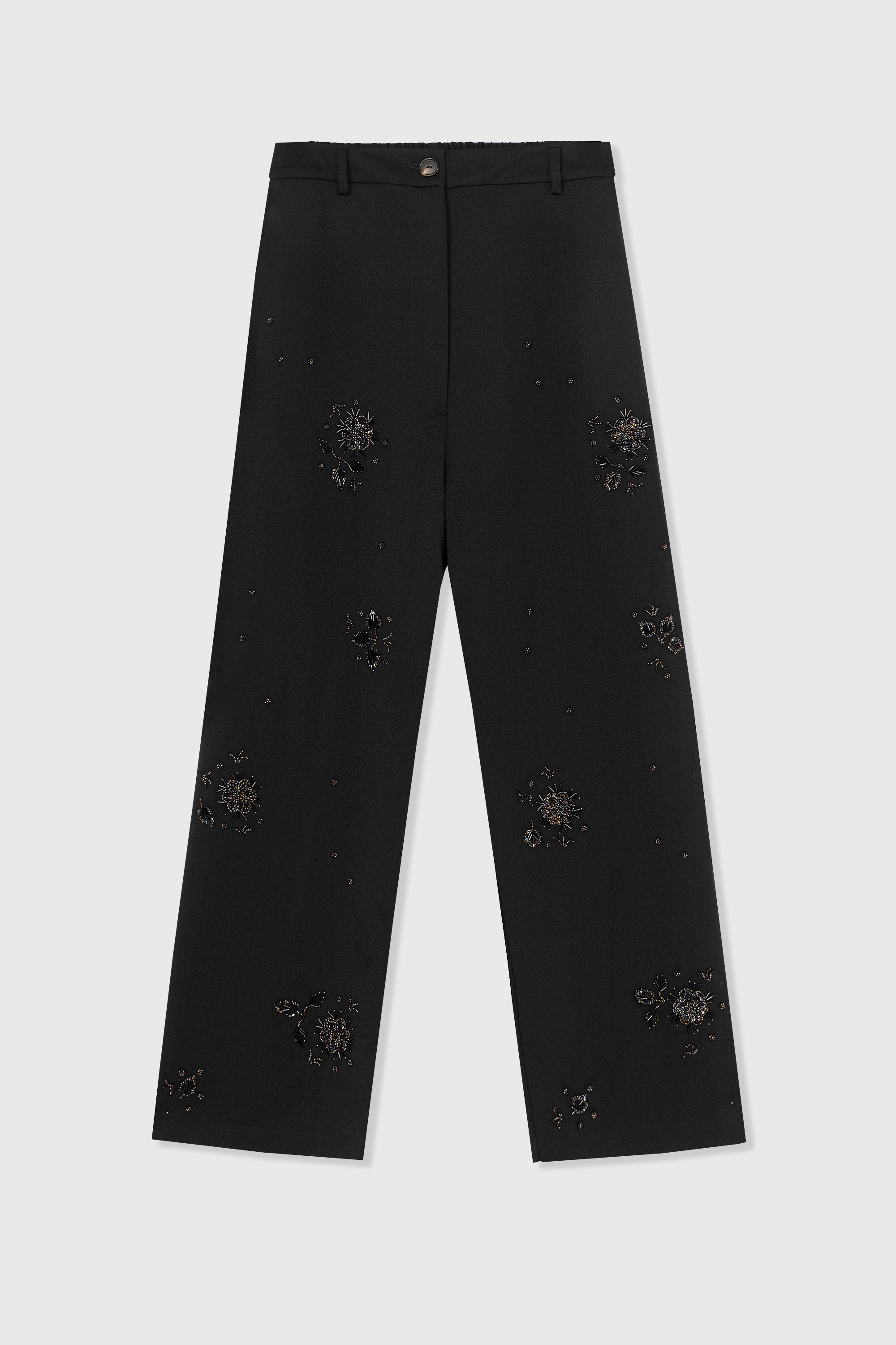Our iconic tailoring pants with different shape. This is a wide leg style designed with side pockets, belt loops and side pleats. Detailed with hand embellished beads adding a touch of shine and relaxed feminity to your wardrobe but still perfect for daily wear with a plain white t-shirt.