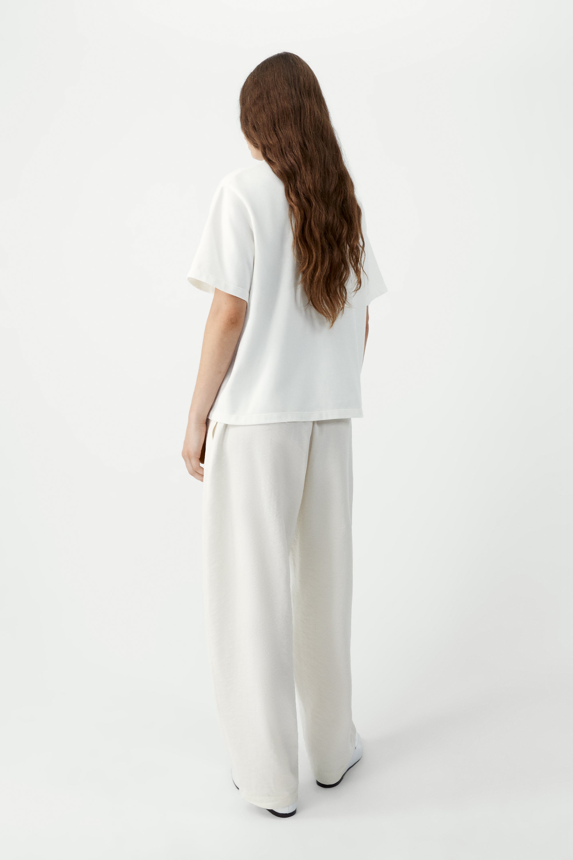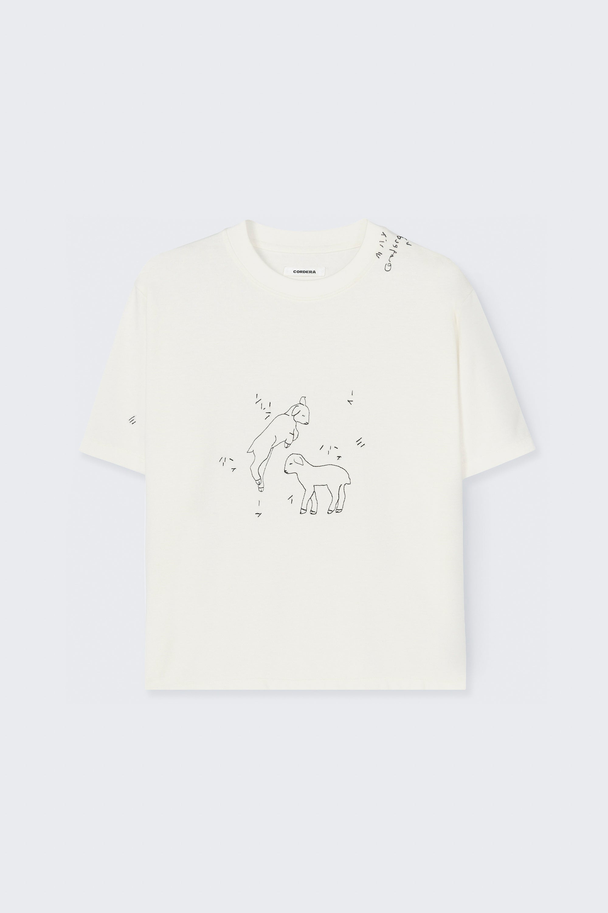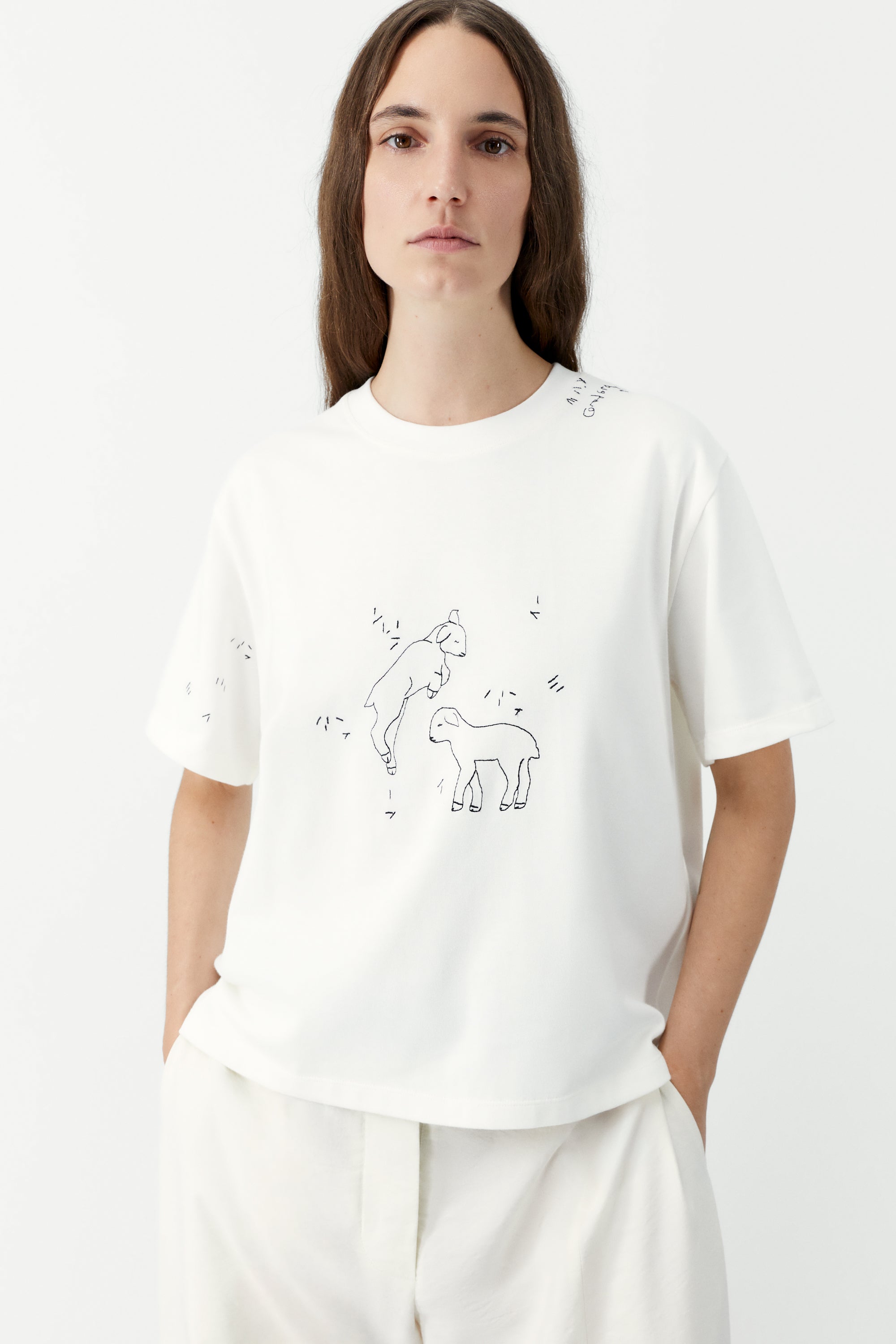 A classic t-shirt silhouette elevated with subtle embroidered details on the front, featuring two charming lamb motifs, and delicate accents on the sleeves. A signature design that reflects the brand’s identity and timeless aesthetic, crafted in crisp white for effortless styling.