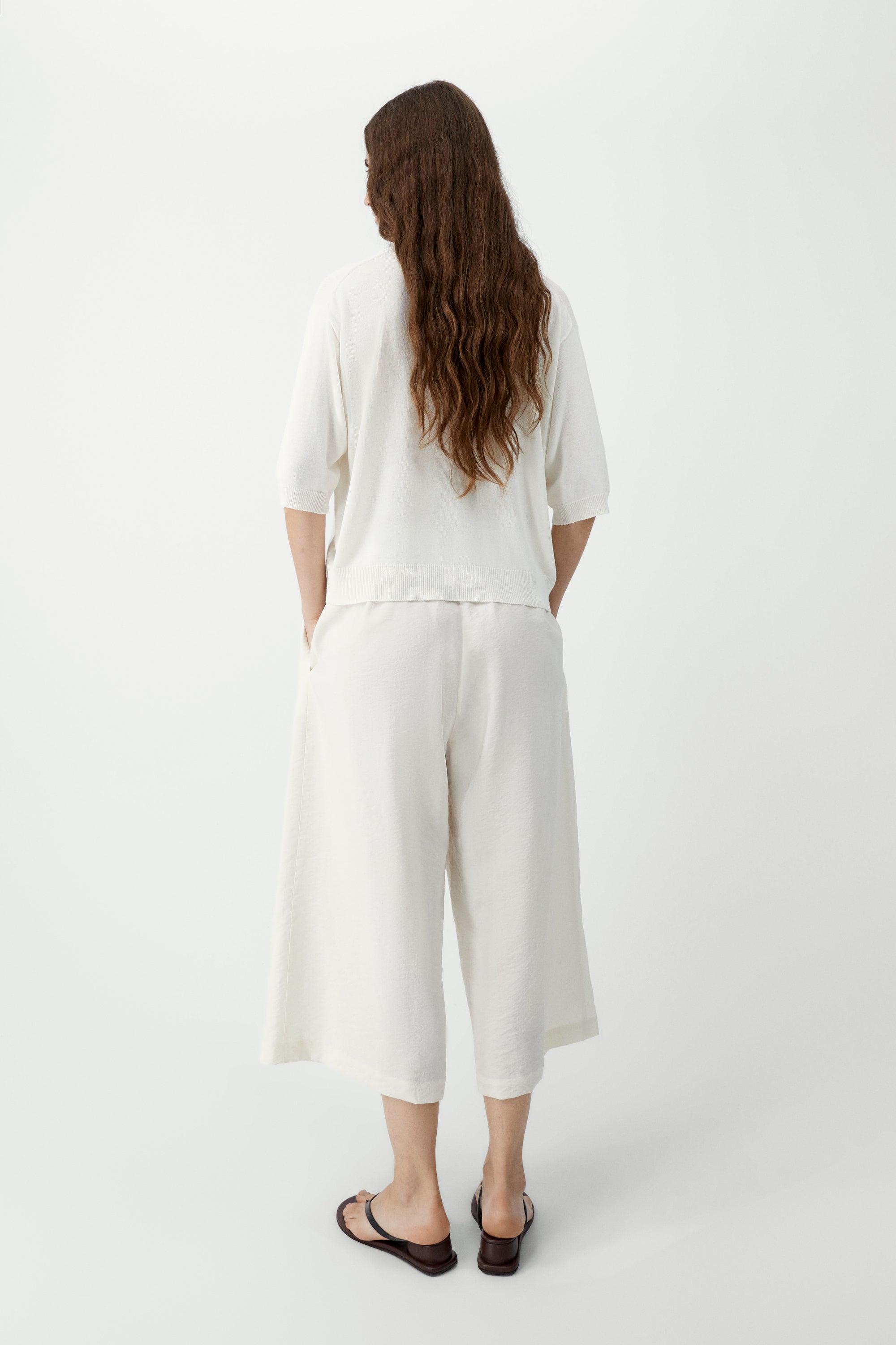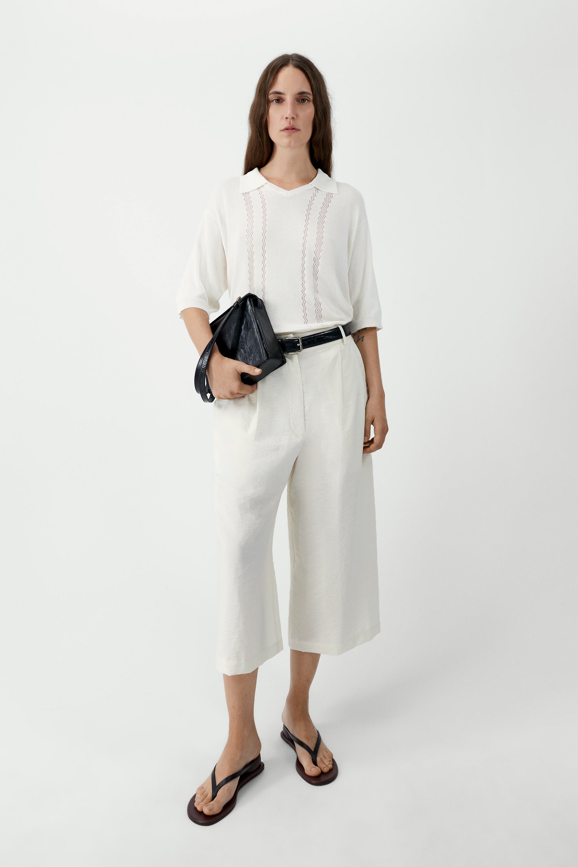 A super-light short-sleeve polo with a relaxed regular fit. Designed with a V-neckline and classic polo collar, it features delicate openwork detailing on the front in two vertical bands. Finished with a ribbed hem at the waist, this piece blends airy elegance with timeless ease.