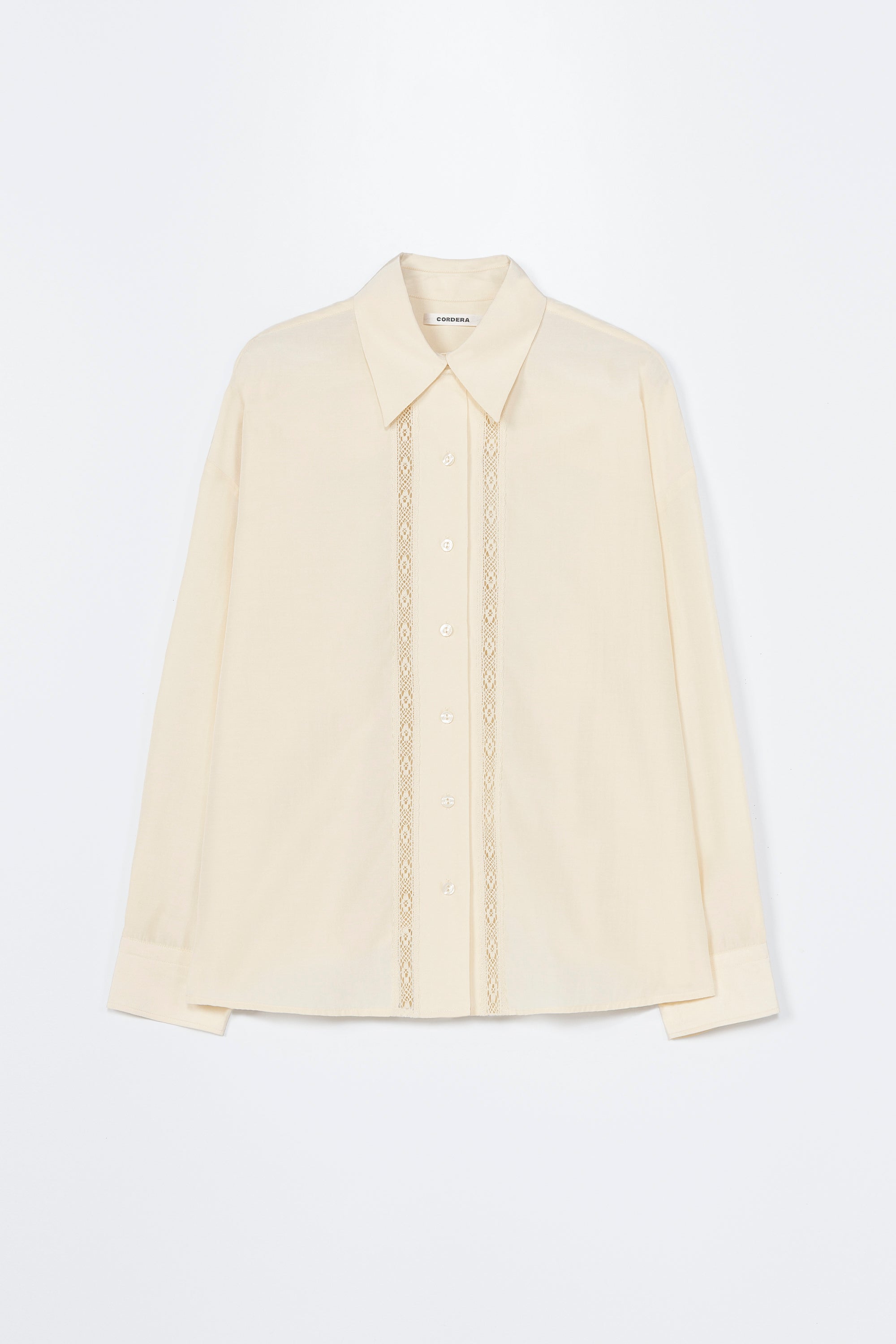 This oversized shirt is a modern take on a classic silhouette, featuring a sharp Italian collar and a relaxed, flowing fit. Two vertical lace panels frame the front button closure, adding a delicate, textural detail. The back is gently structured with a slight turtle shape for subtle volume. A timeless piece with a romantic twist.