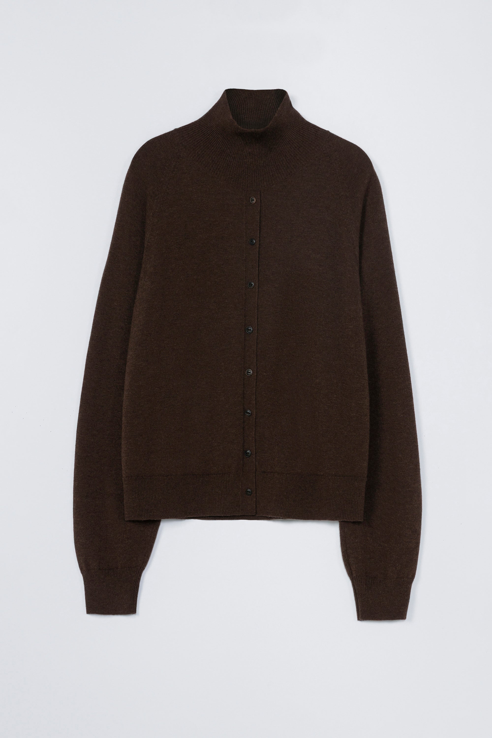 Oversized fit with a snug high neckline and decorative small buttons at the front. Ribbed cuffs and hem for a structured finish. Lightweight and soft Merino Wool with a warm feel, perfect for effortless layering.