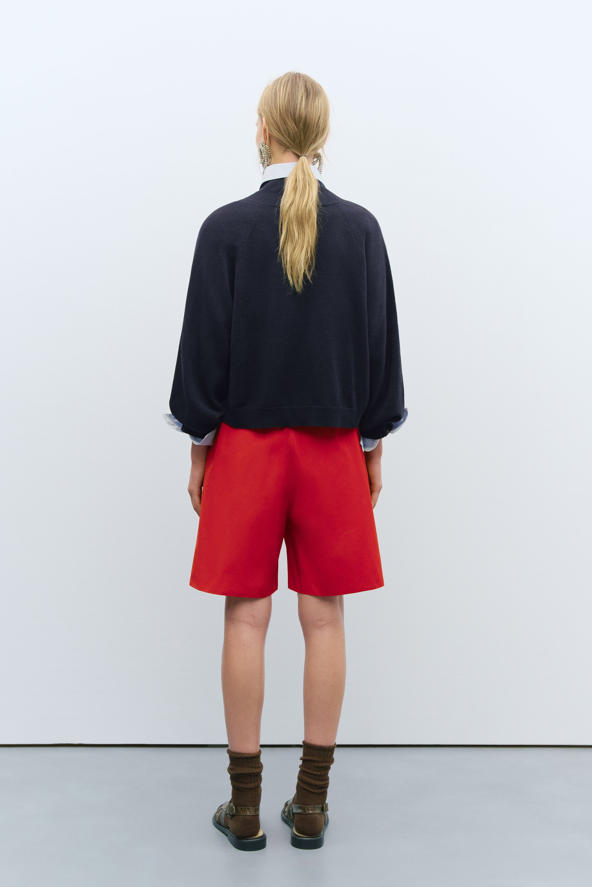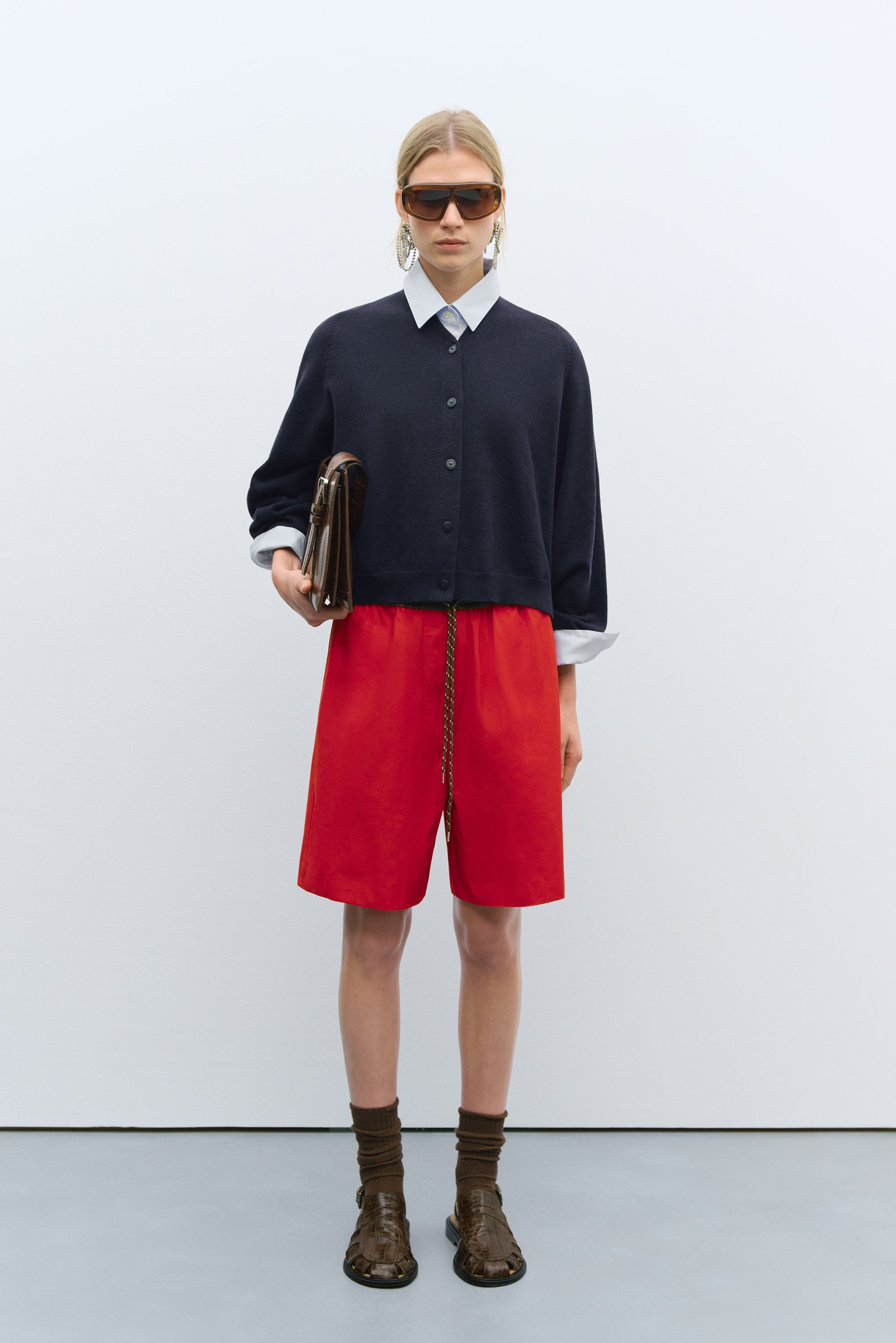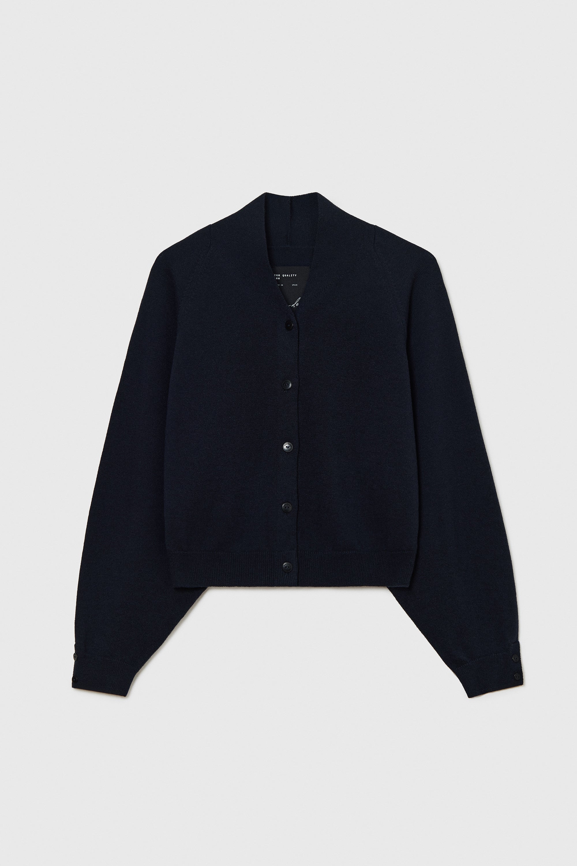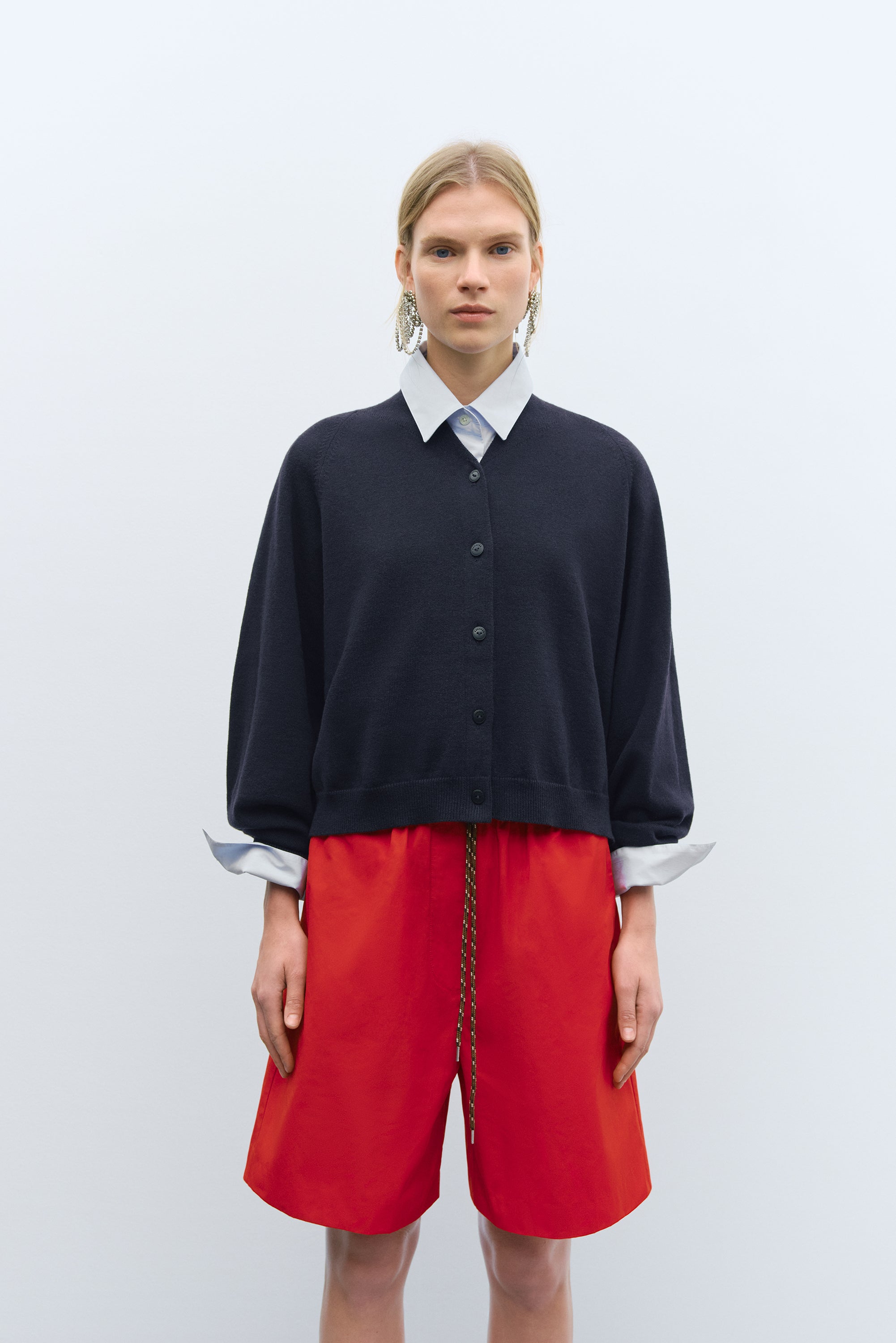 A timeless cardigan with a minimalist appeal. Features a boxy oversized fit with subtle side slits and contrasting black button closures at the front. Designed with long balloon sleeves, each cuff detailed with two small buttons, and a V-neckline that rises elegantly at the back. A staple piece with stylish touches for effortless layering.