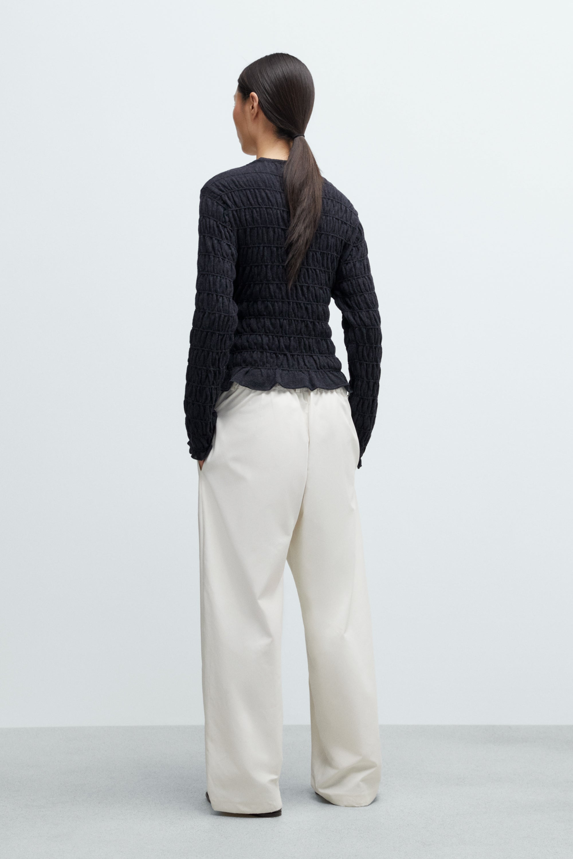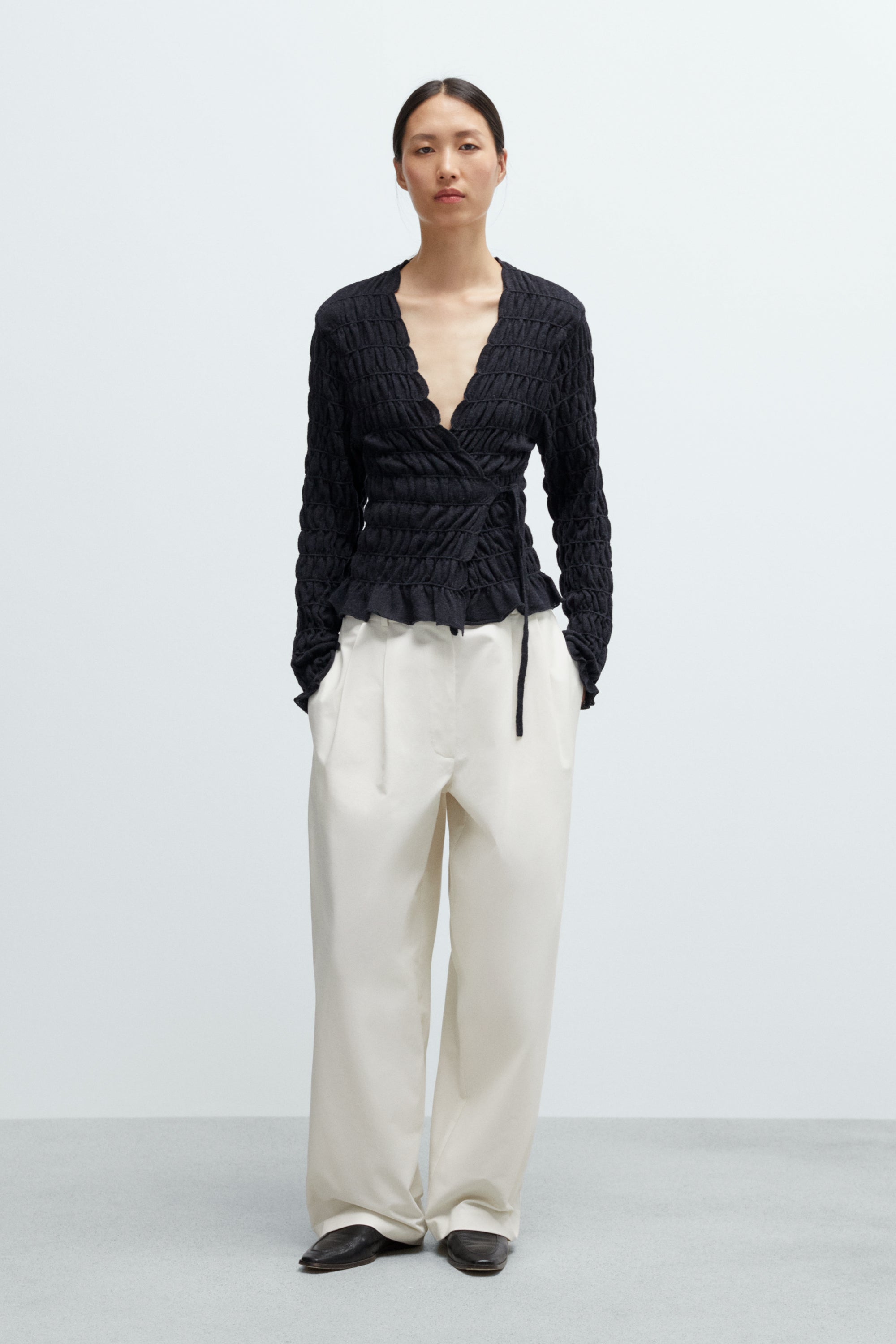 This cardigan is designed with a cropped and fitted shape, detailed with an interior tie closure and overlapping front. Features a flattering V-neck and long sleeves. The gathered detailing adds subtle texture and a delicate, feminine touch, enhancing the ballet-inspired shape. Soft, lightweight, and perfect for wear it as it is.