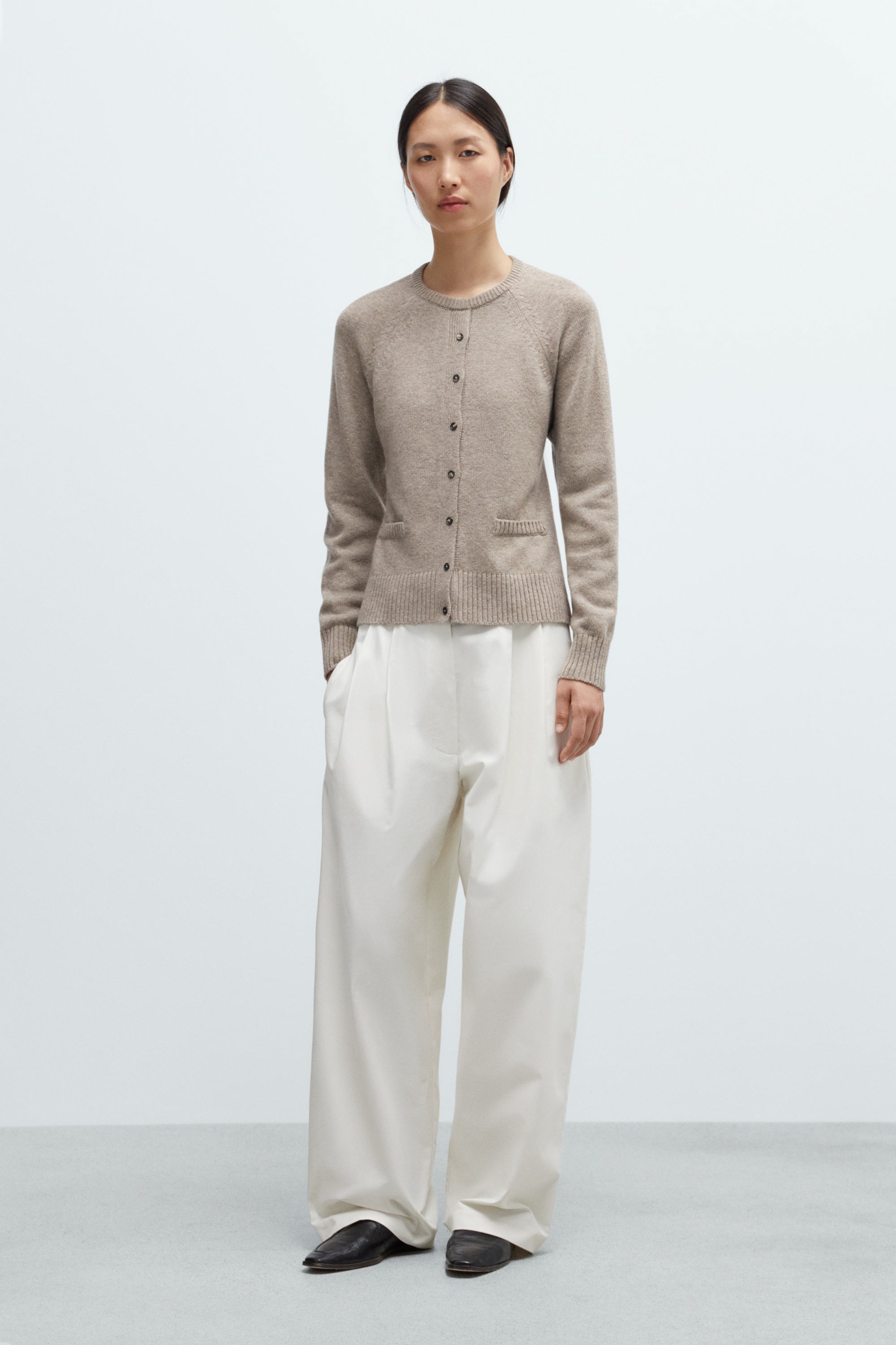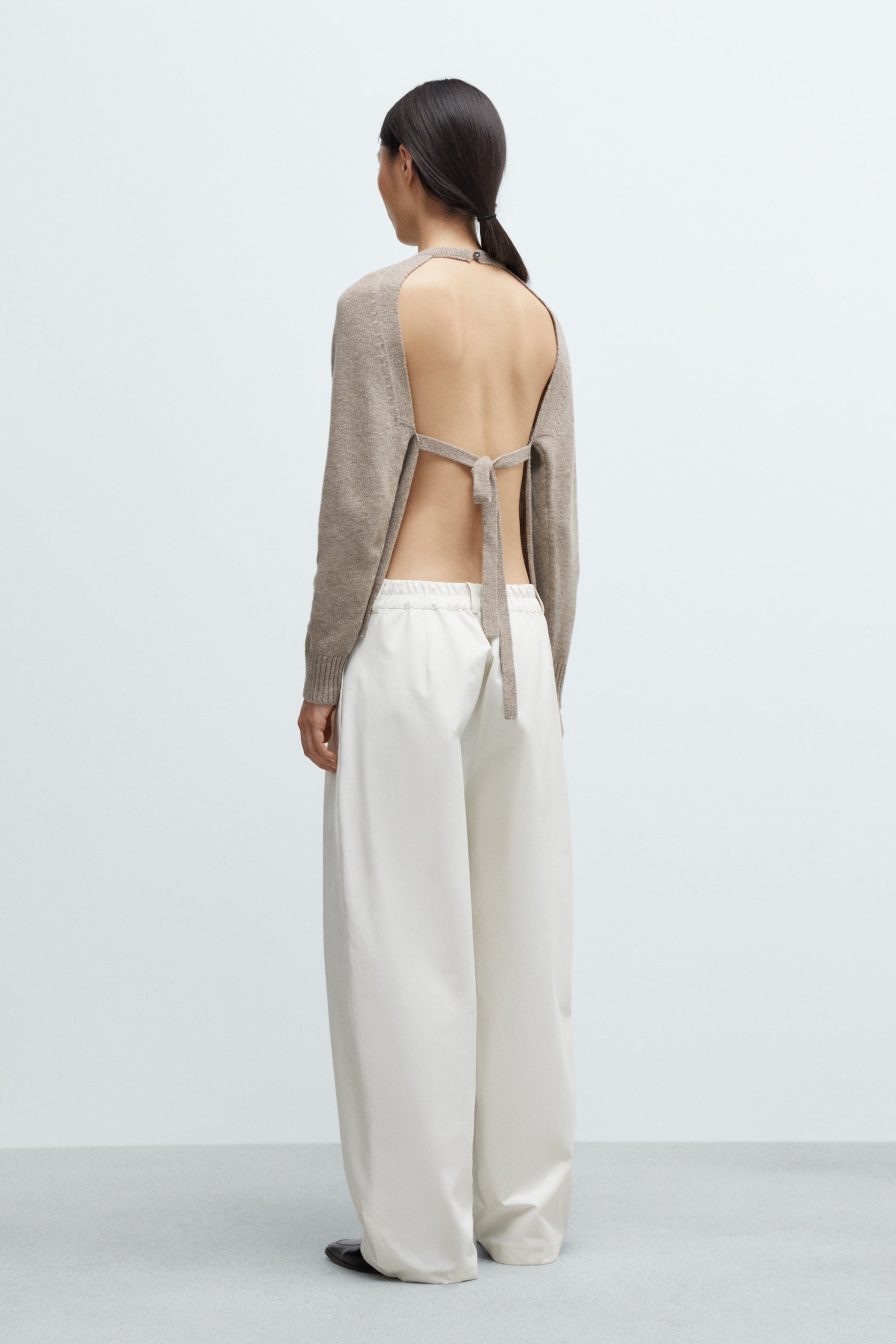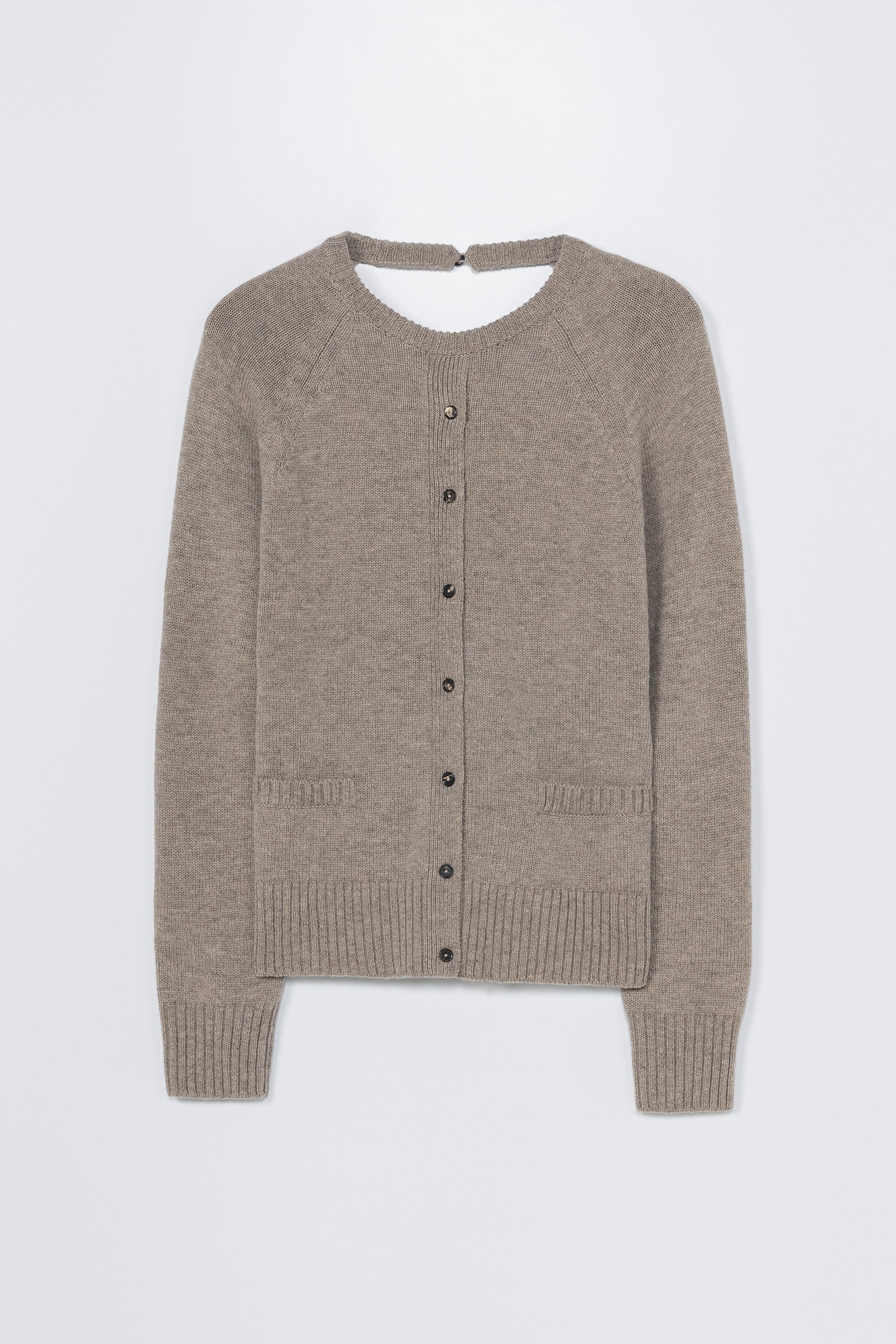 This Merino wool cardigan offers a regular fit with a refined front and a twist at the back. It features a crew neckline fastened with a small back button, long sleeves, and a full button-down front with two welt pockets. The standout detail is the fully open back, finished with delicate lacing for an adjustable fit. A unique and adorable piece that blends softness, structure, and personality.