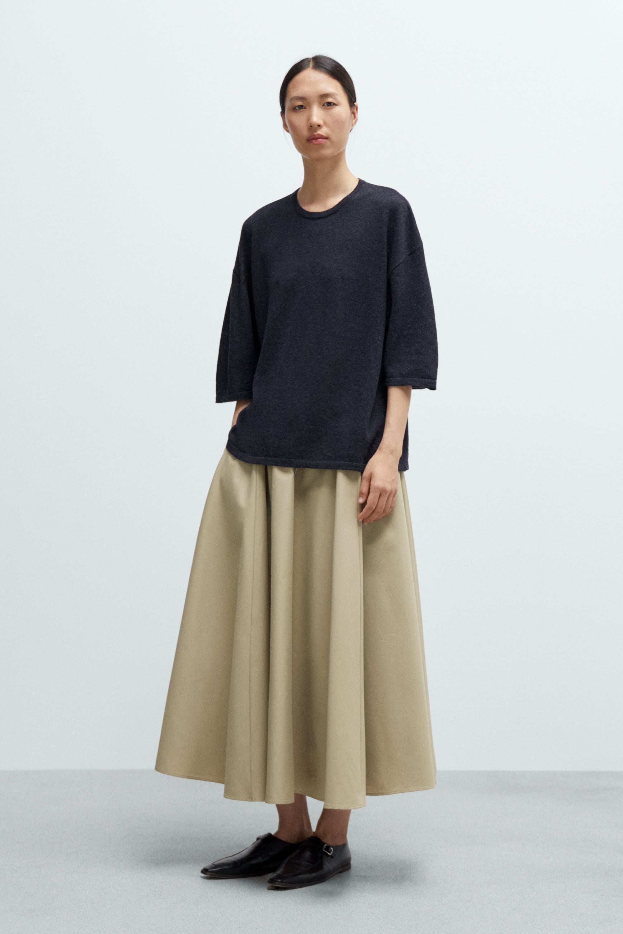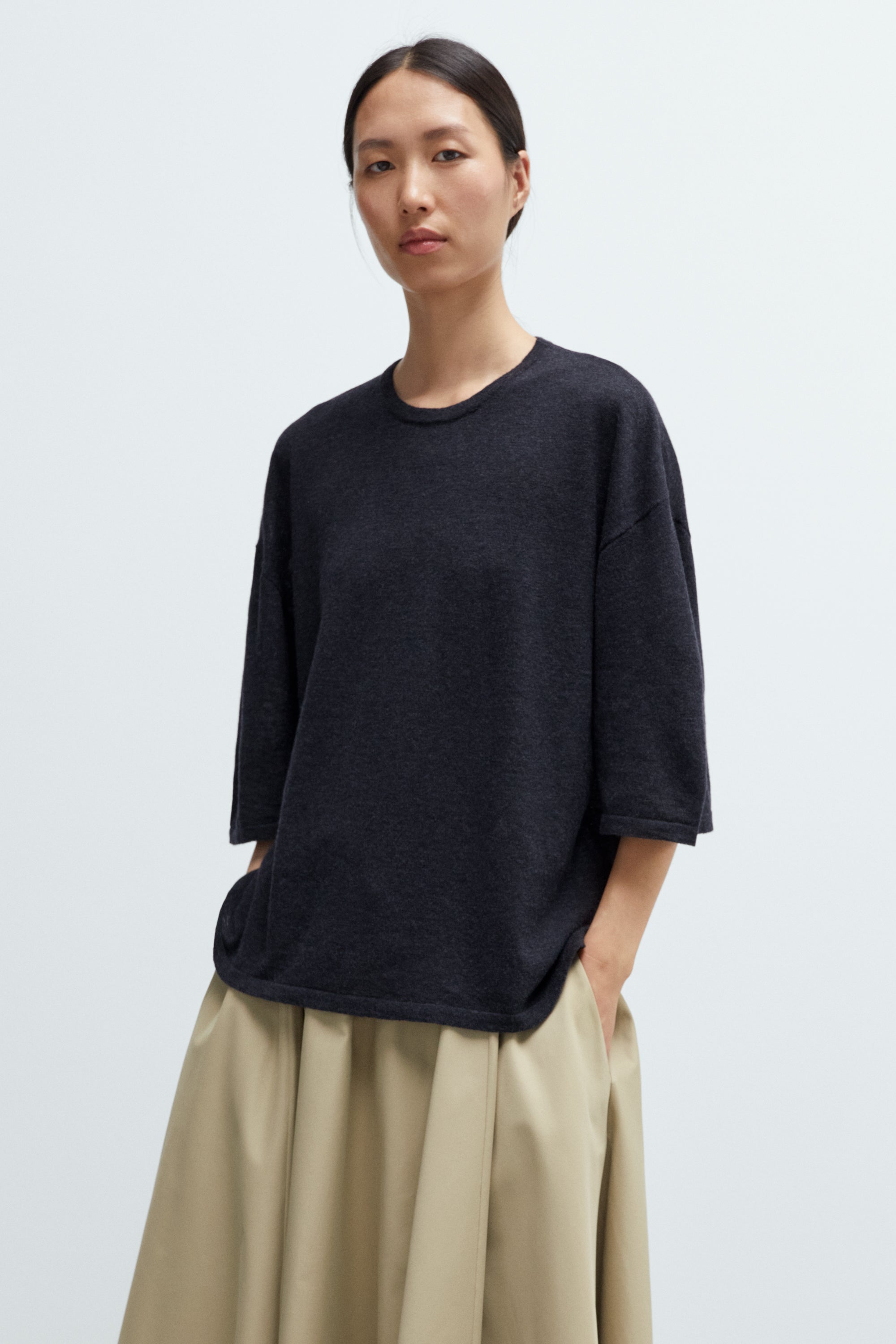 This oversized t-shirt is crafted from a extrafine merino wool. Features a relaxed silhouette with dropped shoulders and 3/4 sleeves. Finished with a classic crewneck. Light and effortlessly comfortable, it's perfect for everyday wear.