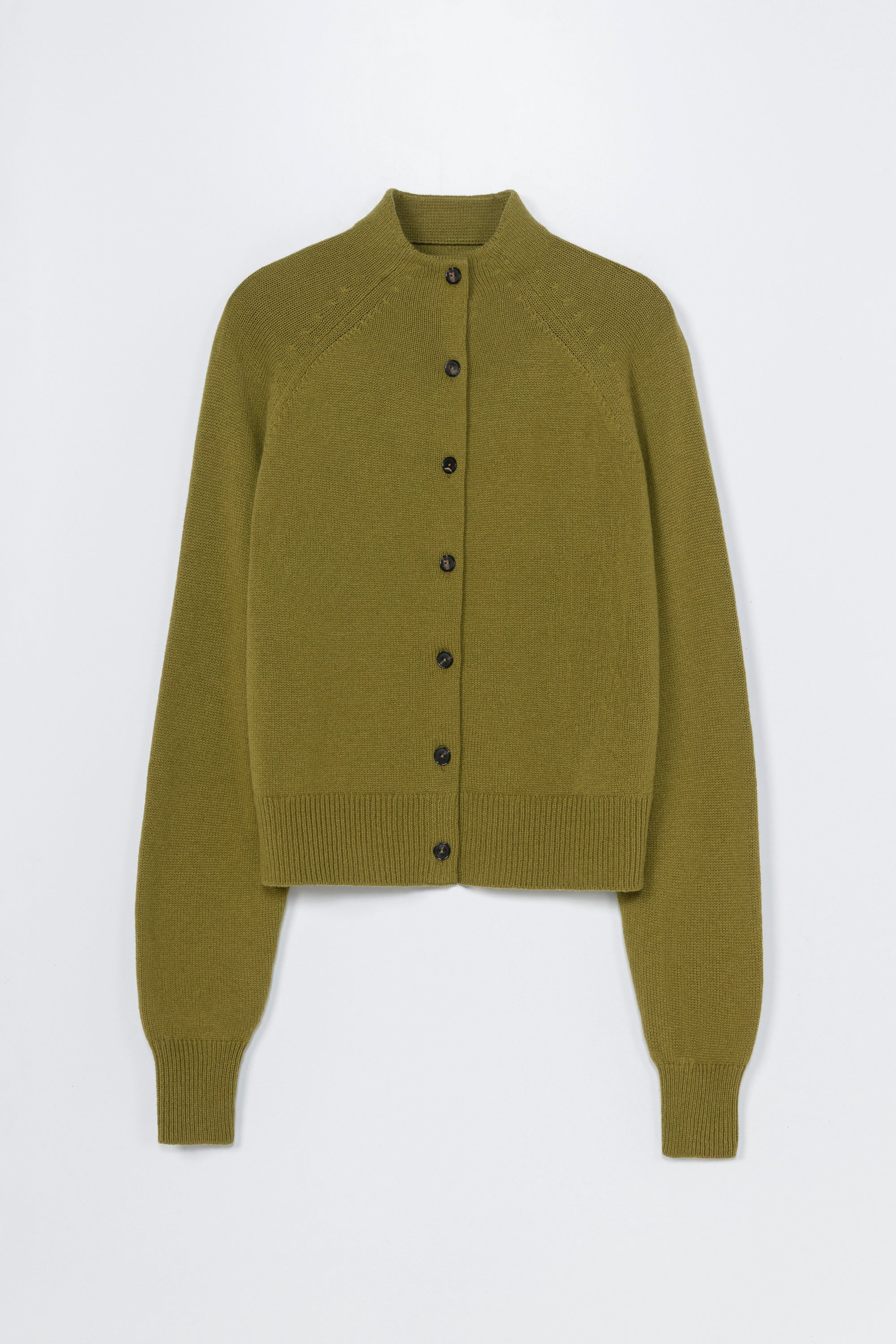 This Merino wool cardigan features a slightly oversized fit with a clean front button closure that extends to a high Perkins collar. Crafted in a soft, lightweight knit, it offers long raglan sleeves for a relaxed and easy silhouette. The woodbine green tone adds a flattering touch of color, making it a fresh and elevated everyday layer.