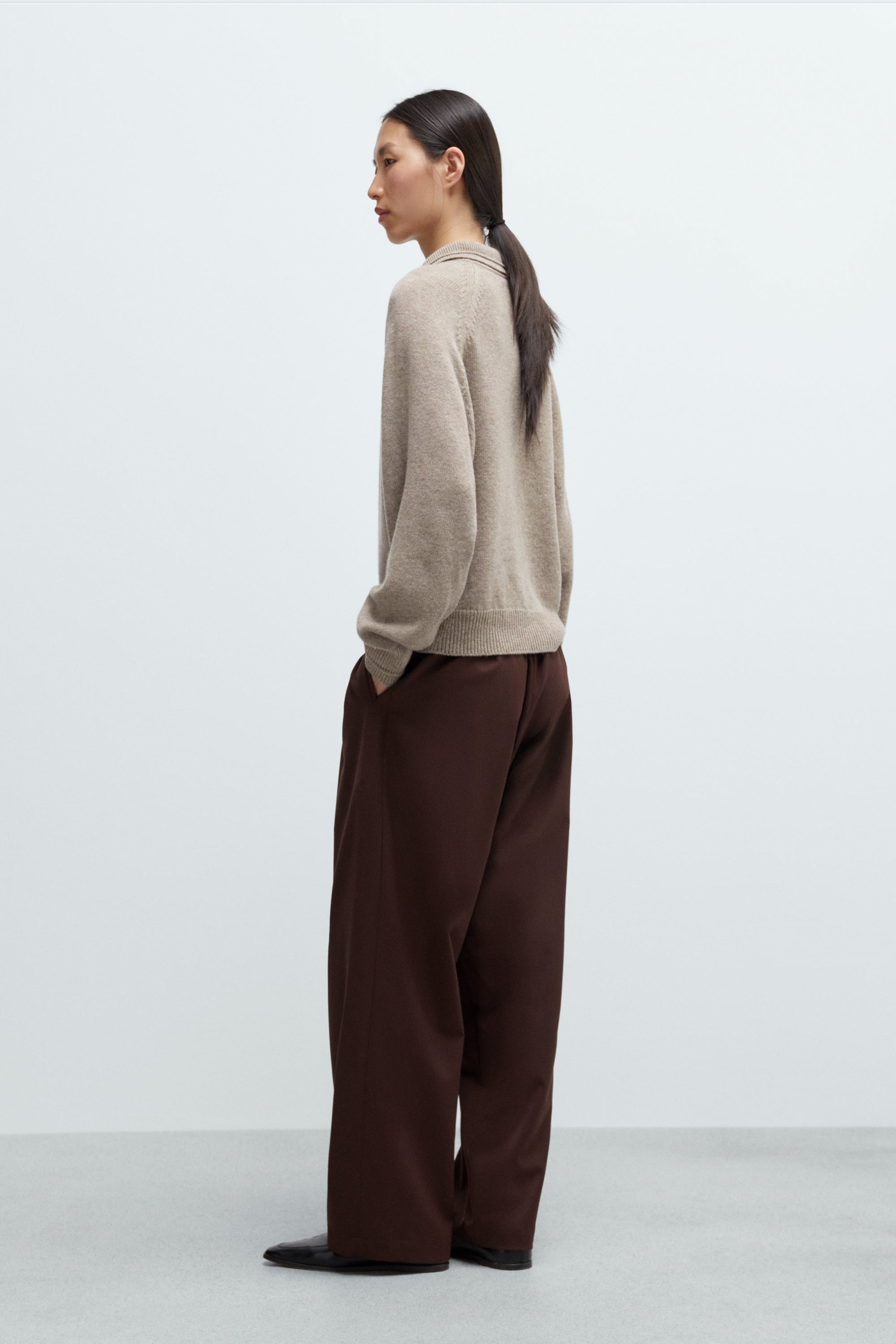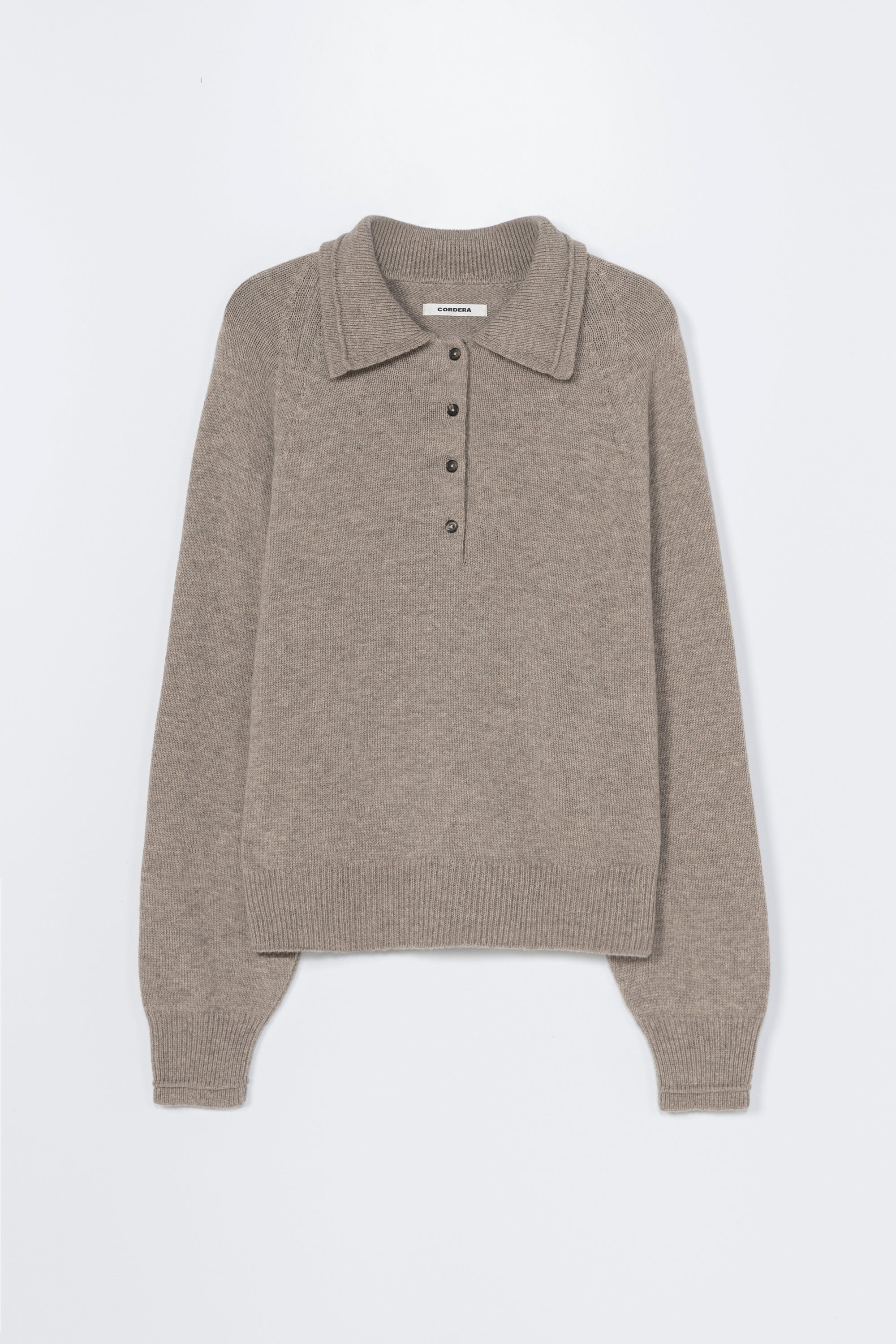 This staple oversized polo sweater is crafted from the softest Merino wool. It features a long-sleeve silhouette with a relaxed fit, a polo collar, and a four-button placket. Ribbed finishes at the cuffs, hem, and collar add subtle texture. A timeless essential designed for effortless layering.