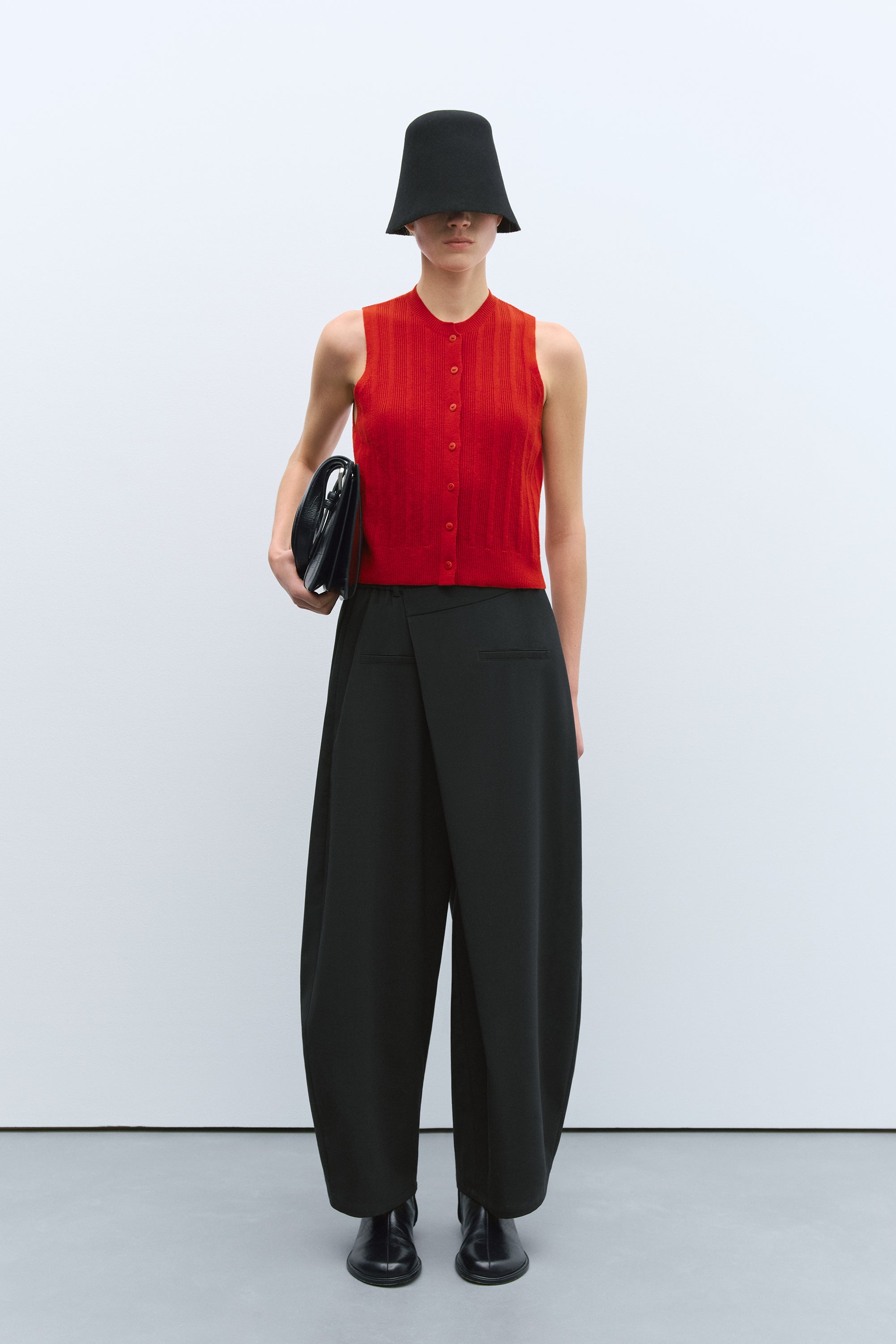 A modern cropped waistcoat crafted in a ribbed texture. Designed with wide armholes and a boxy fit, it features a high round neckline and delicate button closures at the front. A sleek and versatile piece for layering or standout minimalist looks.