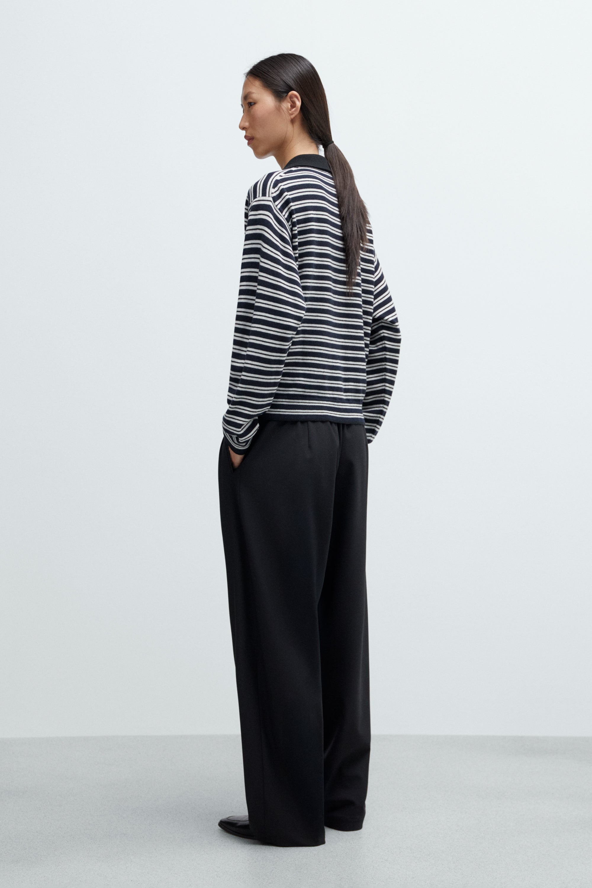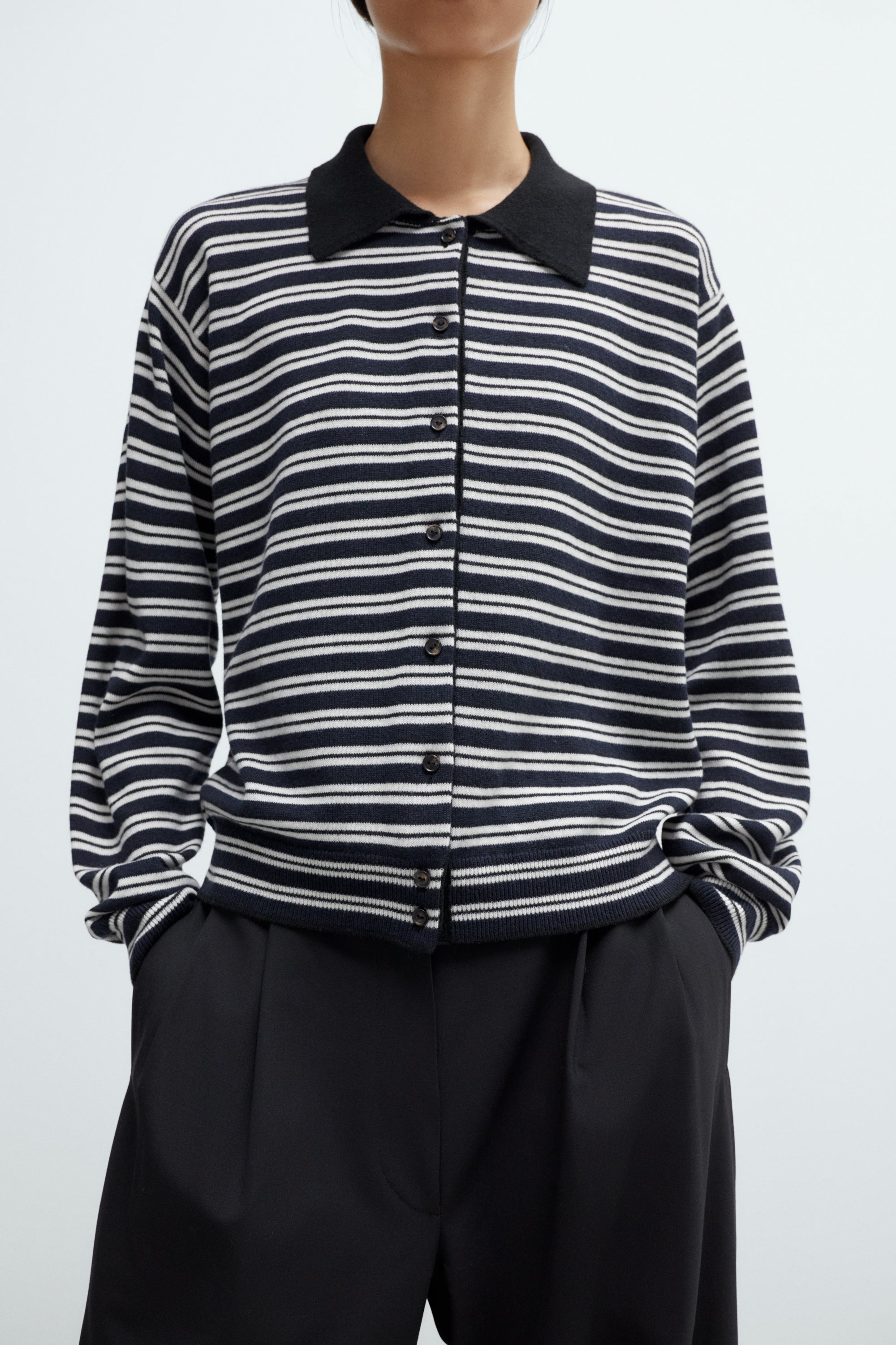 This long-sleeve polo cardigan showcases a regular fit and a classic striped pattern in navy, white, and black. It features a contrasting black polo collar and a full row of small buttons down the front. Ribbed cuffs and hem add structure and comfort to the silhouette. A refined take on everyday dressing with a bold yet timeless color palette.