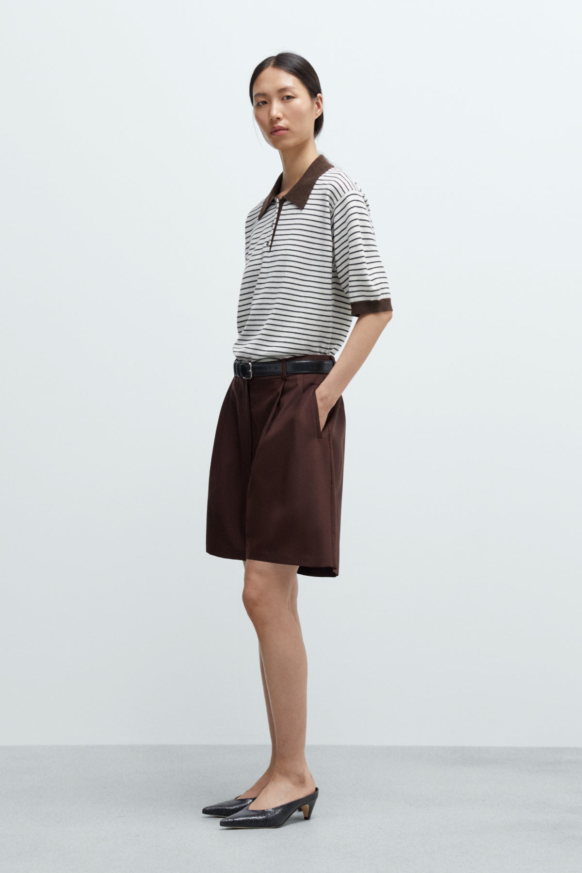 This striped polo features a classic regular fit and elbow-length sleeves, making it a versatile piece for transitional weather. Designed in black and white stripes, it stands out with contrasting brown accents on the polo collar and cuffs. It includes a three-button placket and ribbed finishes at the hem and cuffs for a clean silhouette. An easy-to-style essential that brings a refined twist to a timeless pattern.