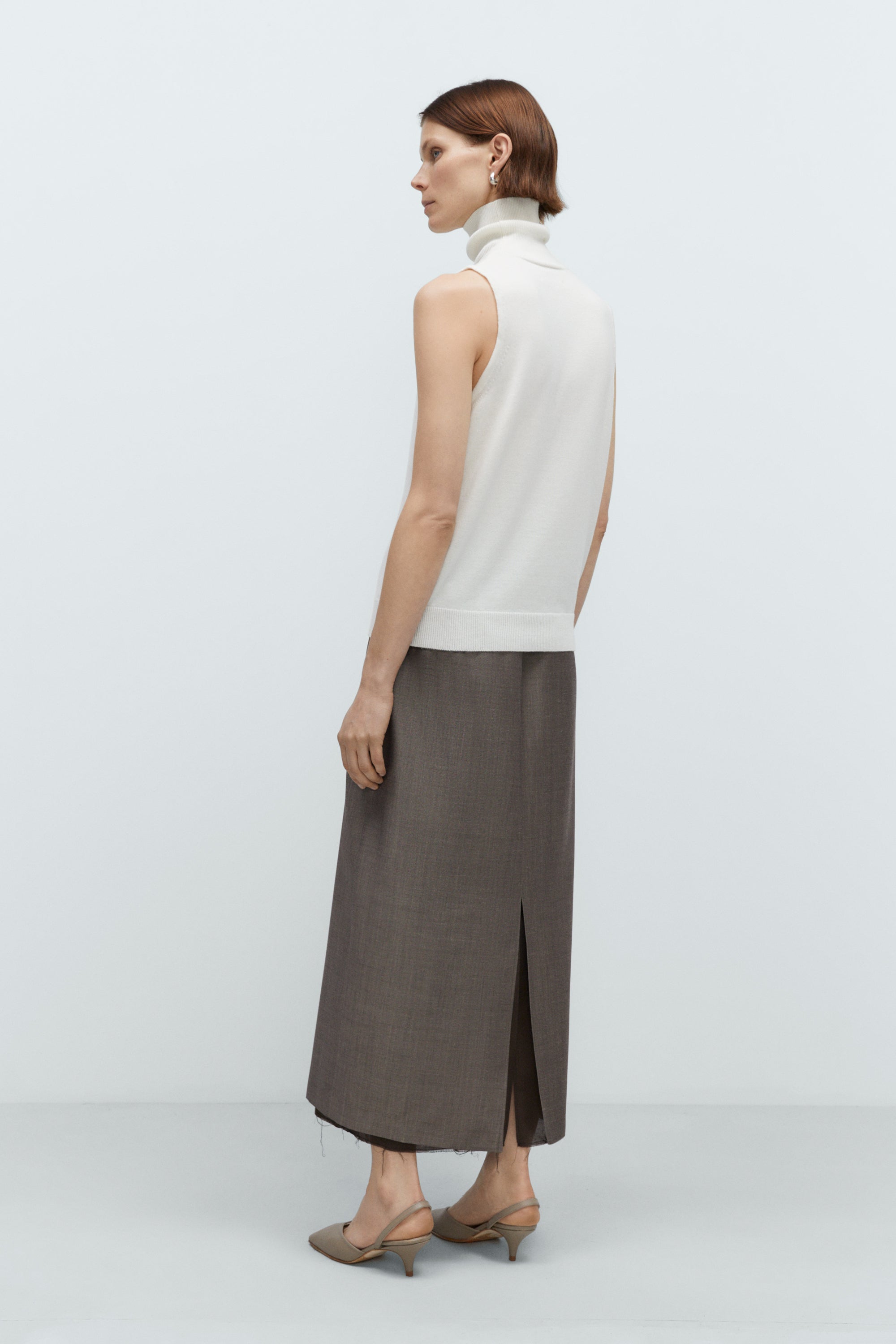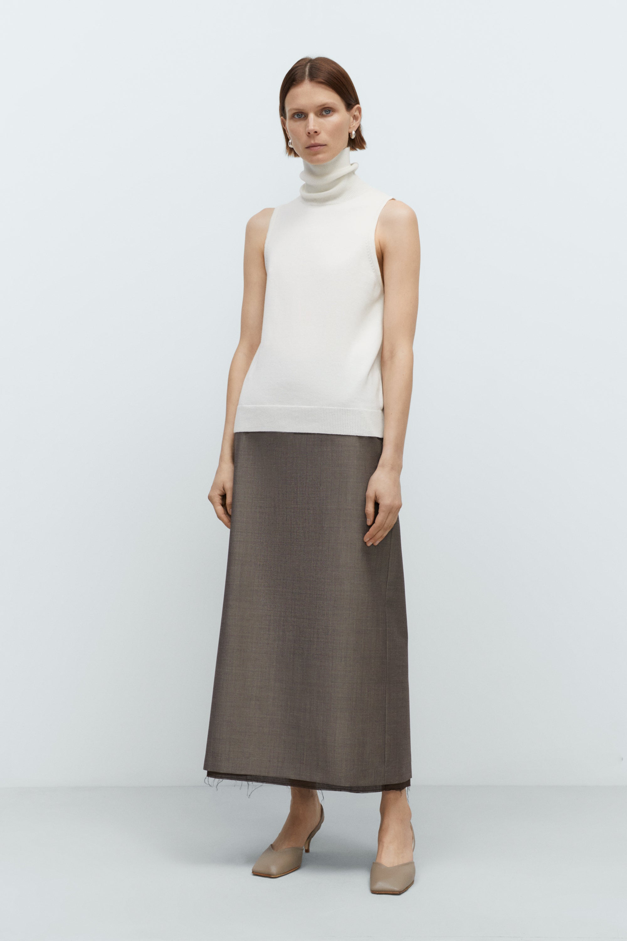 A lightweight, oversized fit with a fitted high collar and wide armholes. The design is minimal, featuring clean lines and a simple, modern aesthetic. The fabric is lightweight, giving the garment a relaxed and comfortable feel.