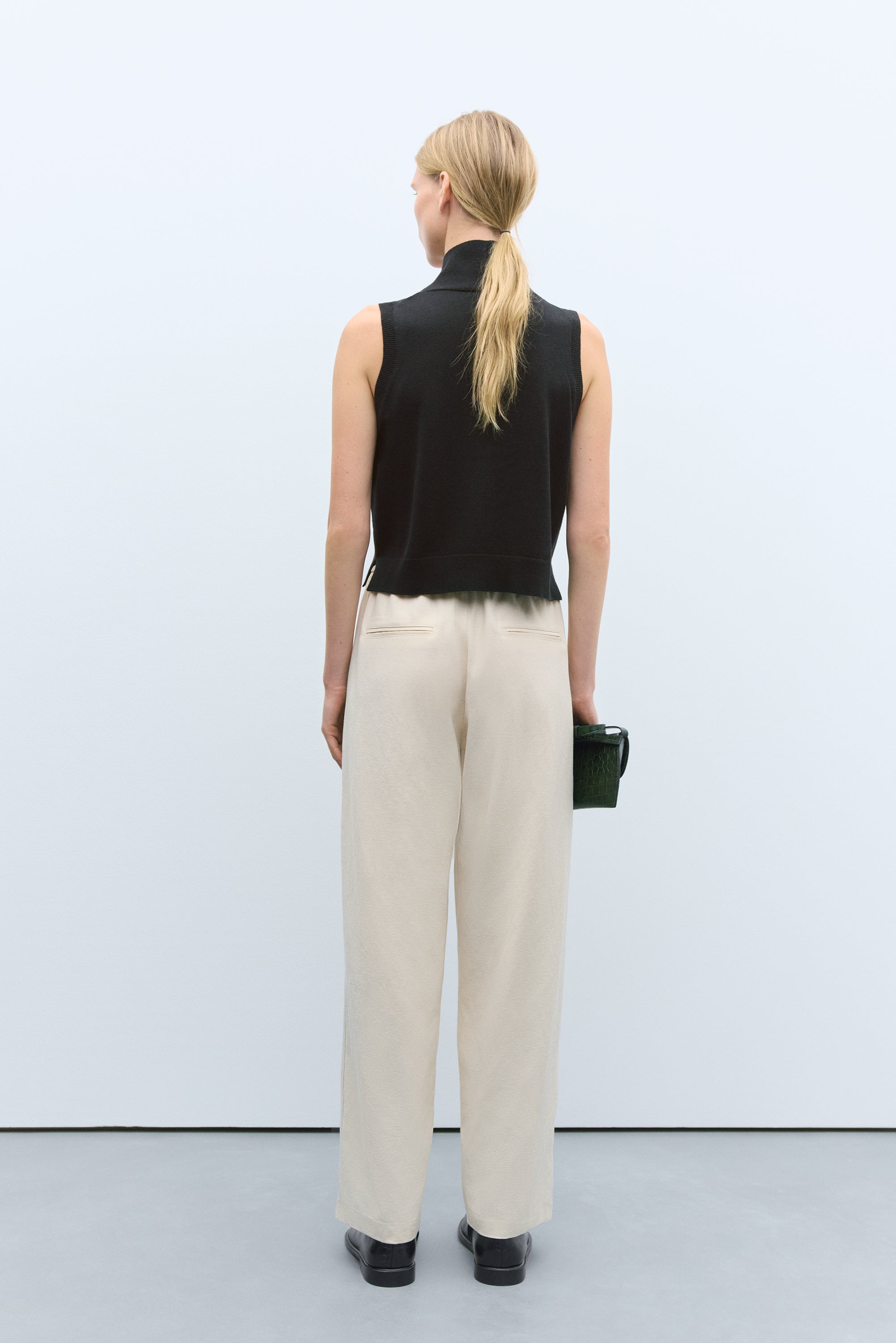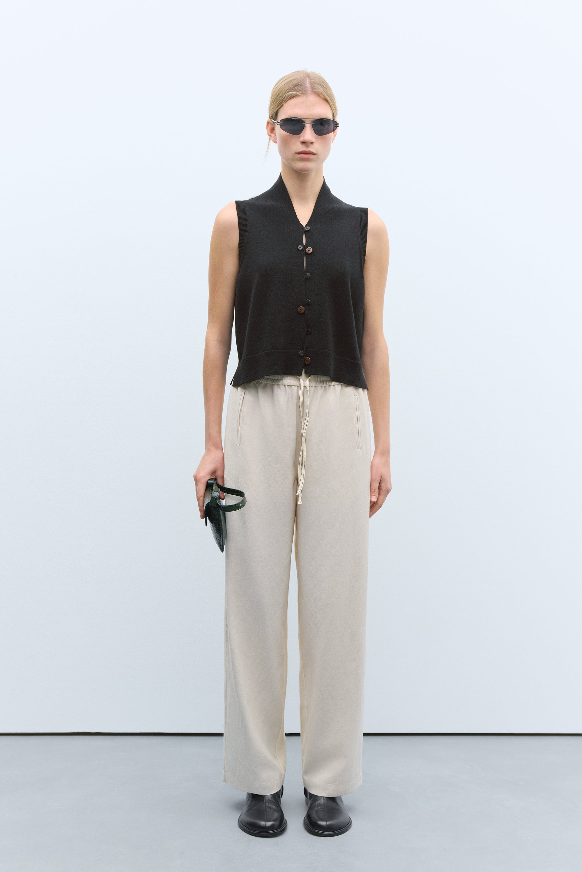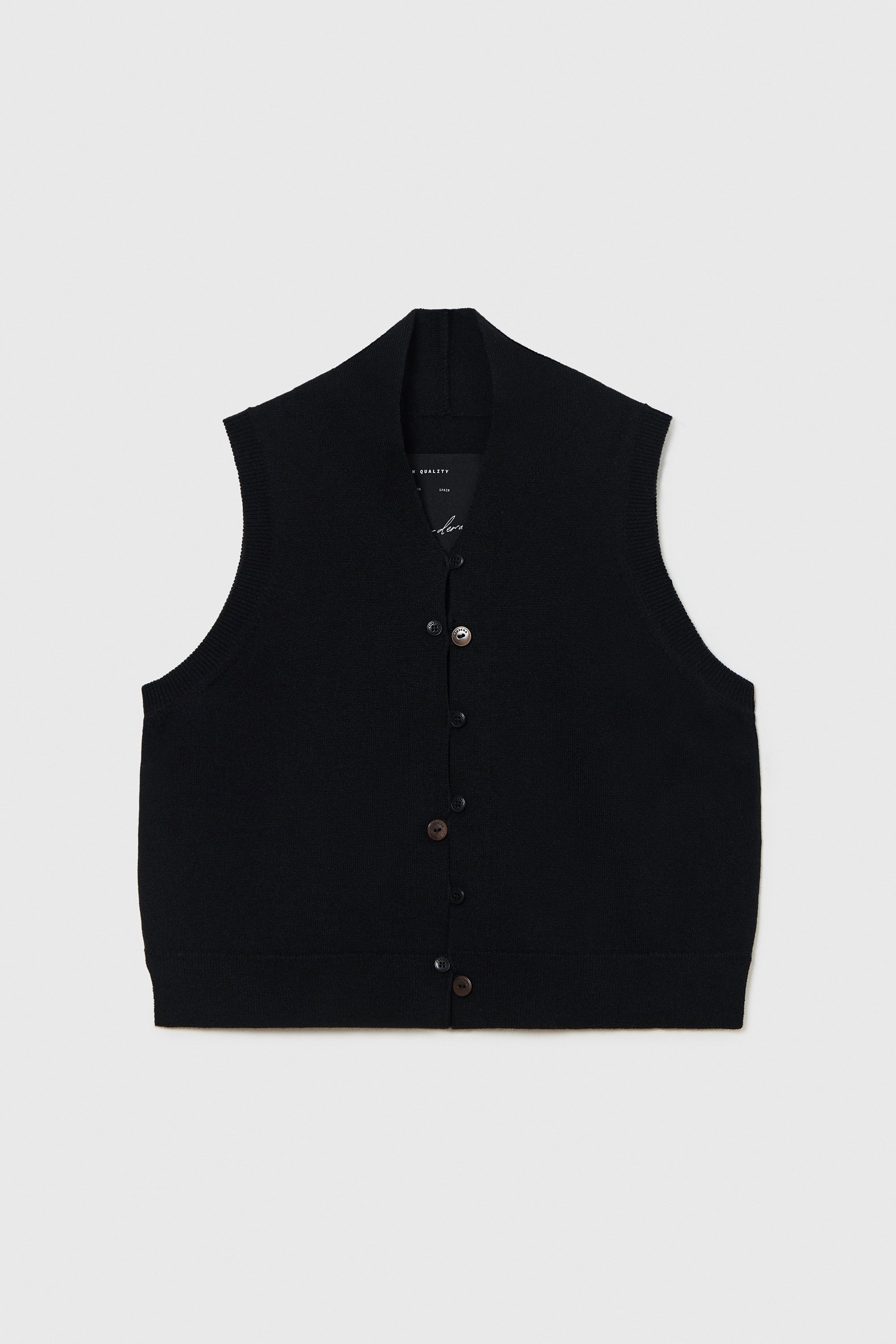 A sleek and modern waistcoat crafted from soft merino wool. Features a cropped, boxy fit with wide armholes and subtle side openings. Designed with an irregular arrangement of unique buttons for a playful touch, and a V-neckline that rises gracefully at the back. A refined yet contemporary piece for elevated layering.