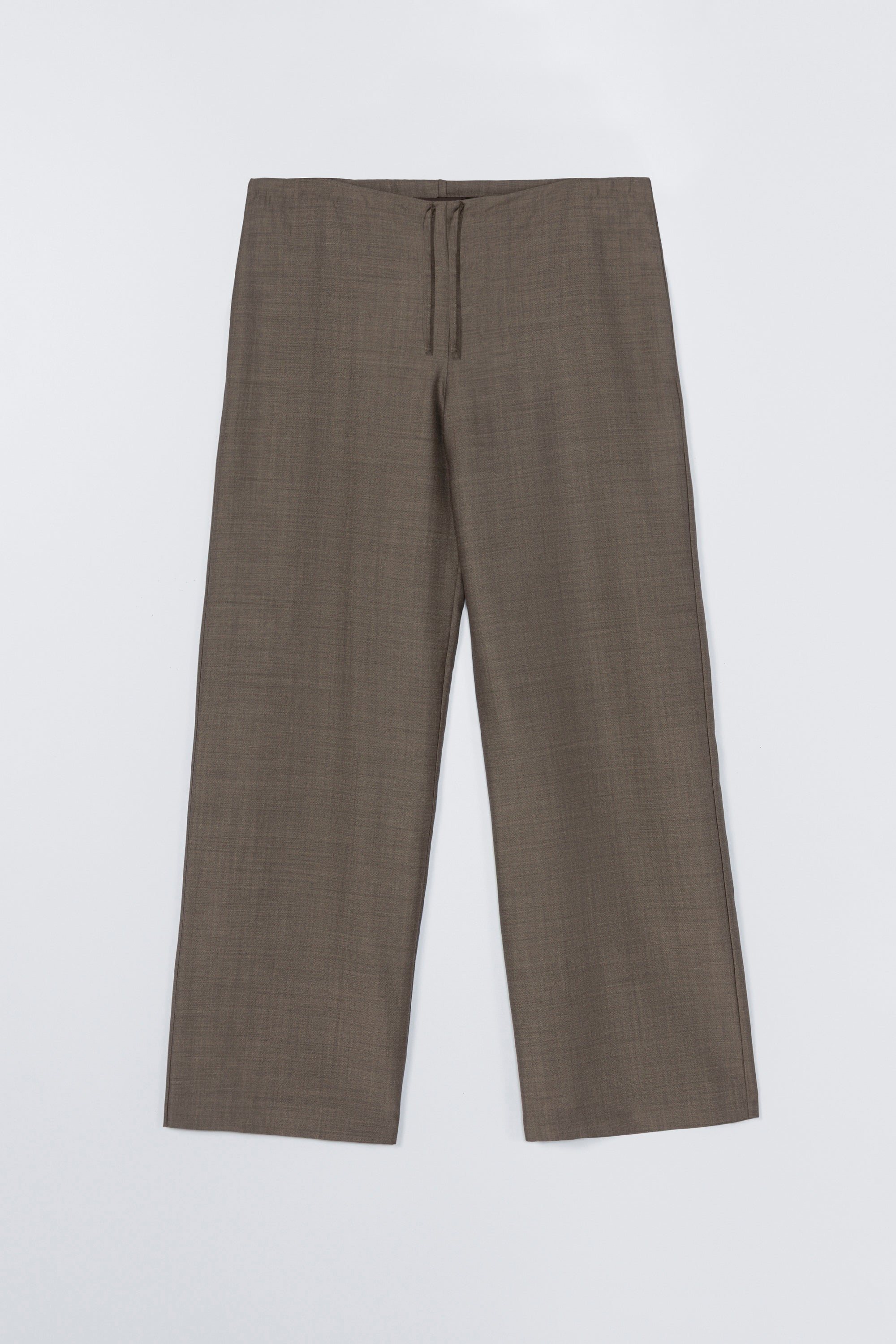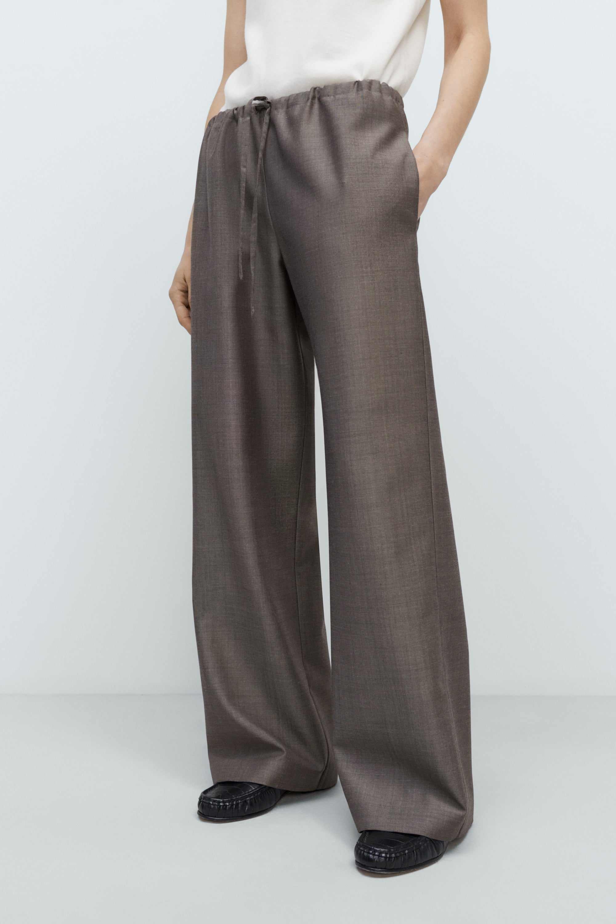 Relaxed, oversized fit pants with an adjustable drawstring waistband for a custom fit. Featuring side pockets and a slightly flared, long silhouette. Lined with acetate for added comfort and smoothness. A chic, comfortable option for laid-back days.