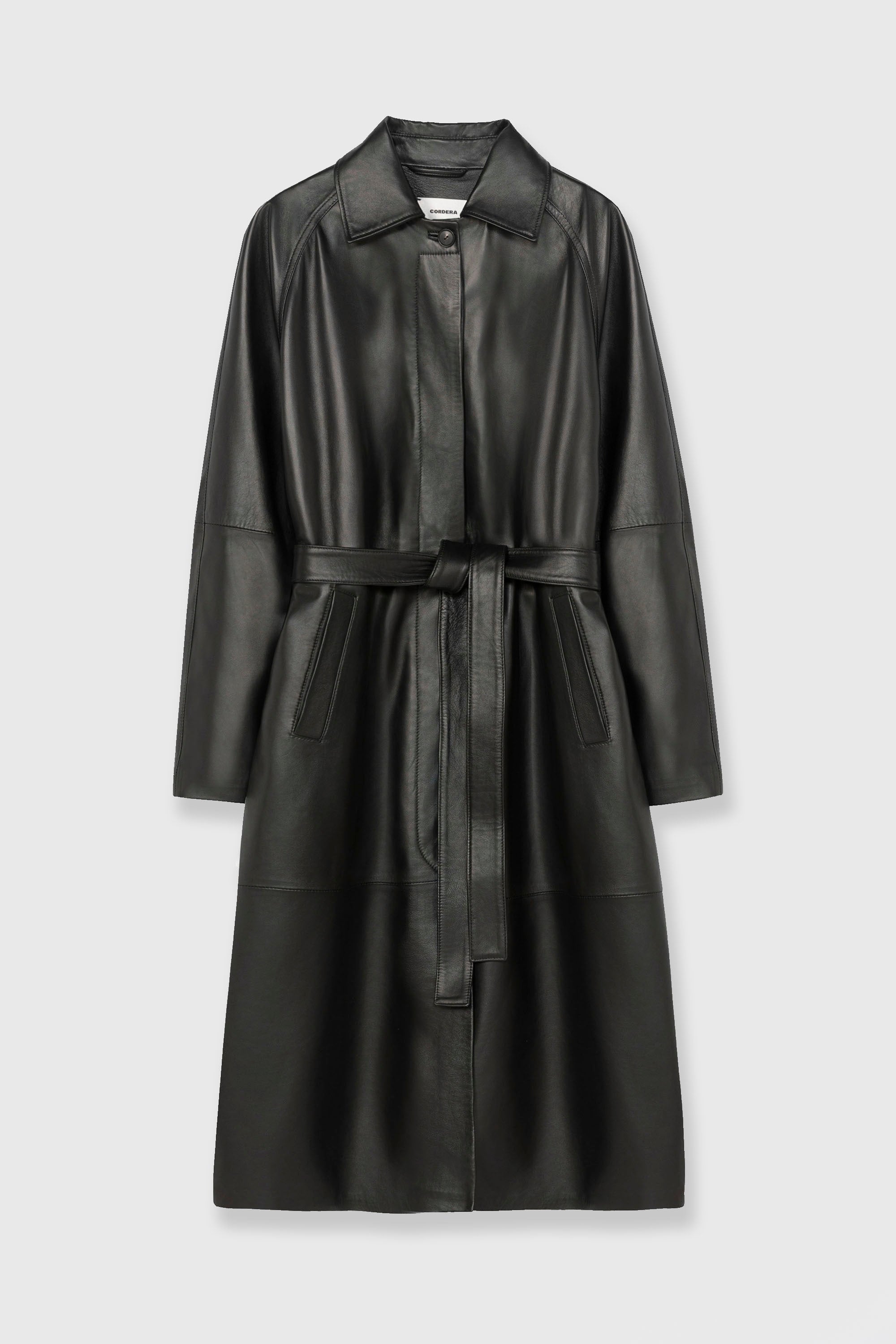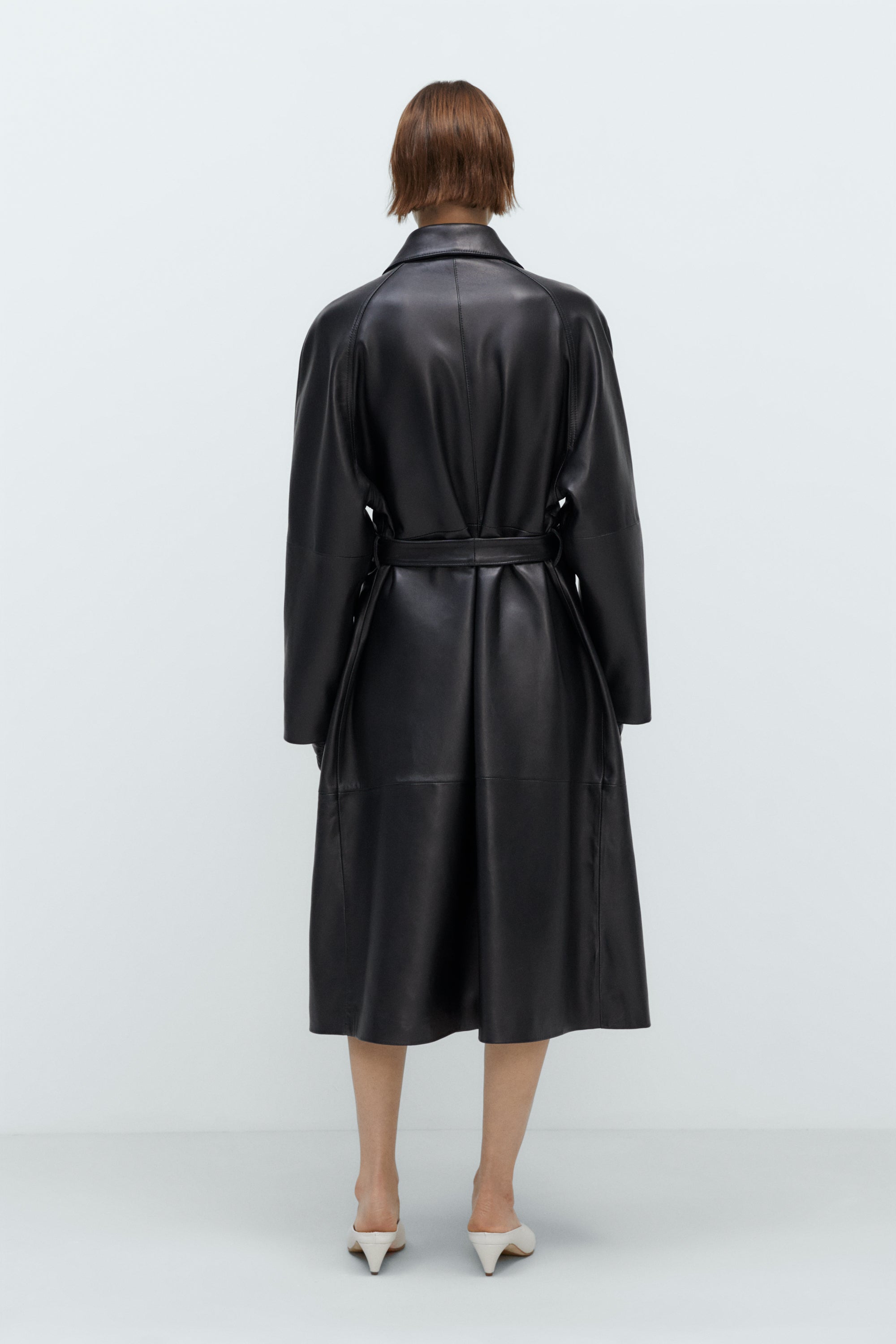 Premium lamb leather shapes this classic long trench coat. It features side pockets, a back vent, and front horn buttons, with only the top button visible. Finished with a matching belt for a refined silhouette. A piece for a lifetime.