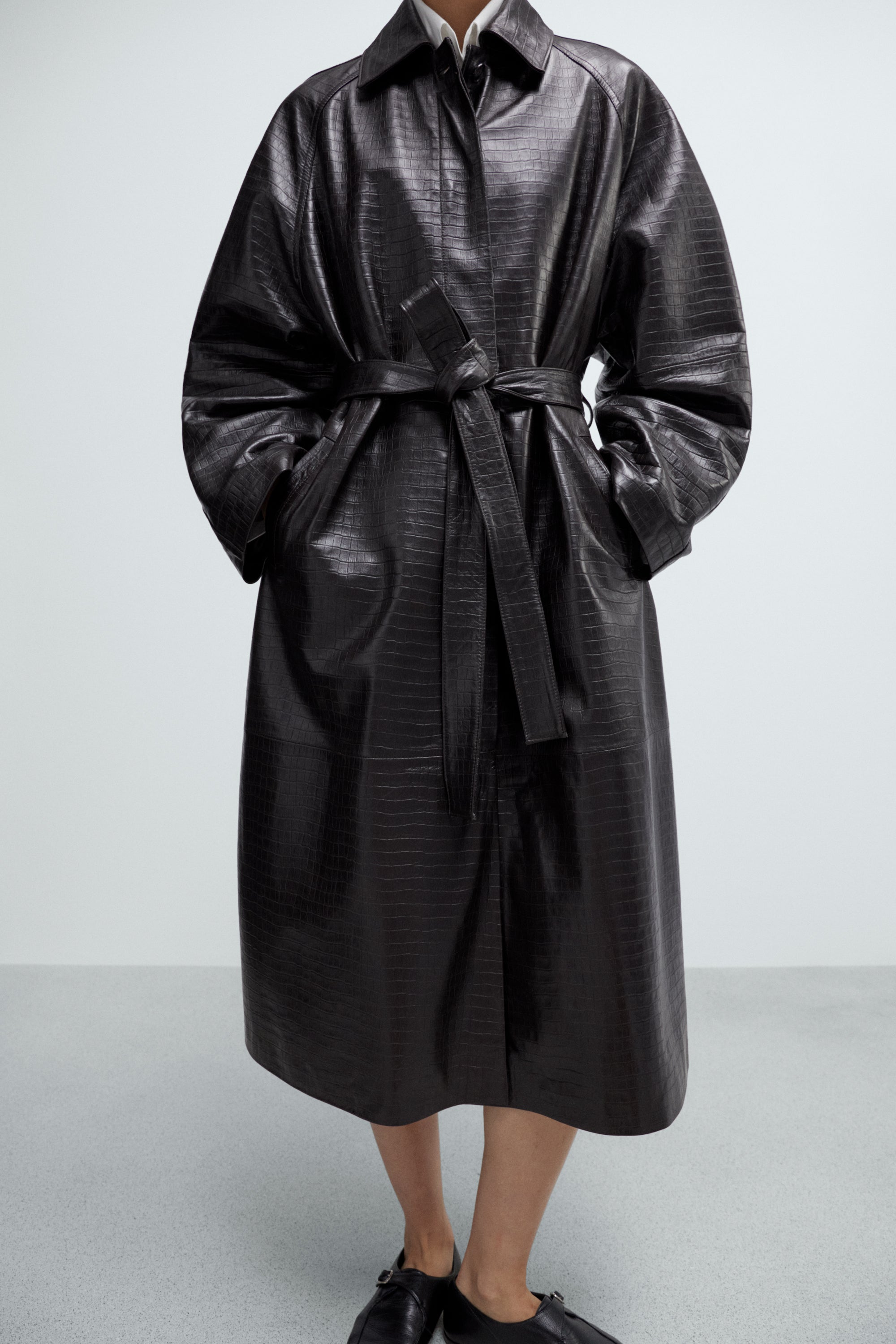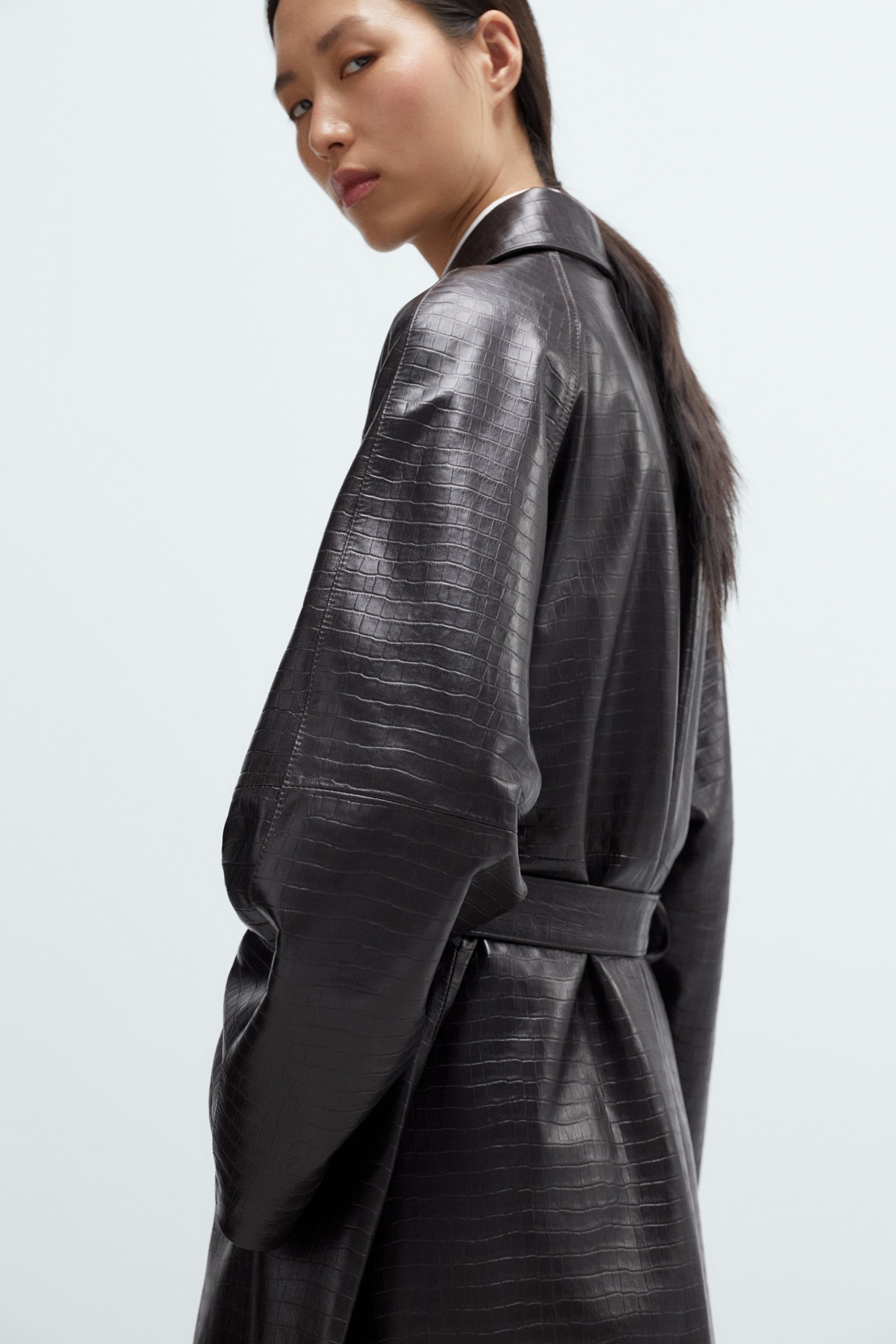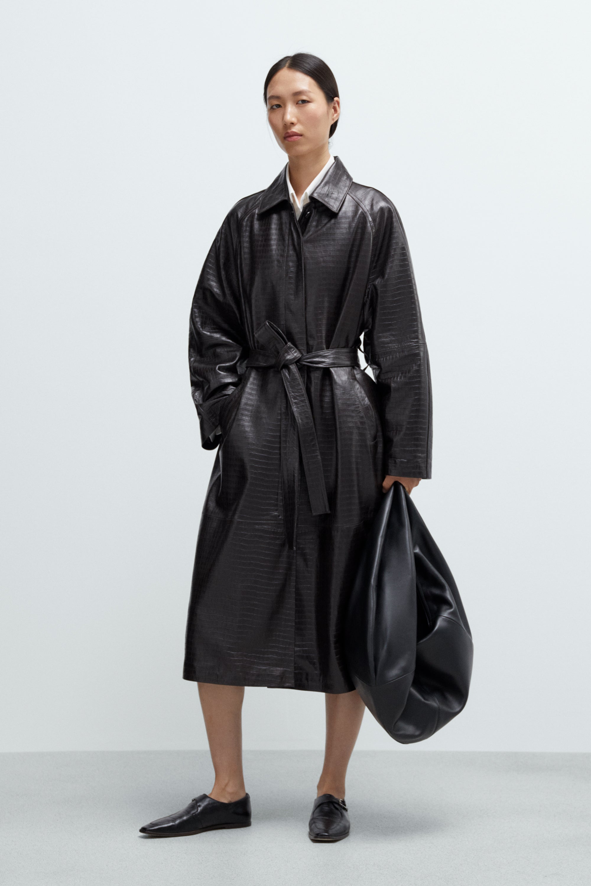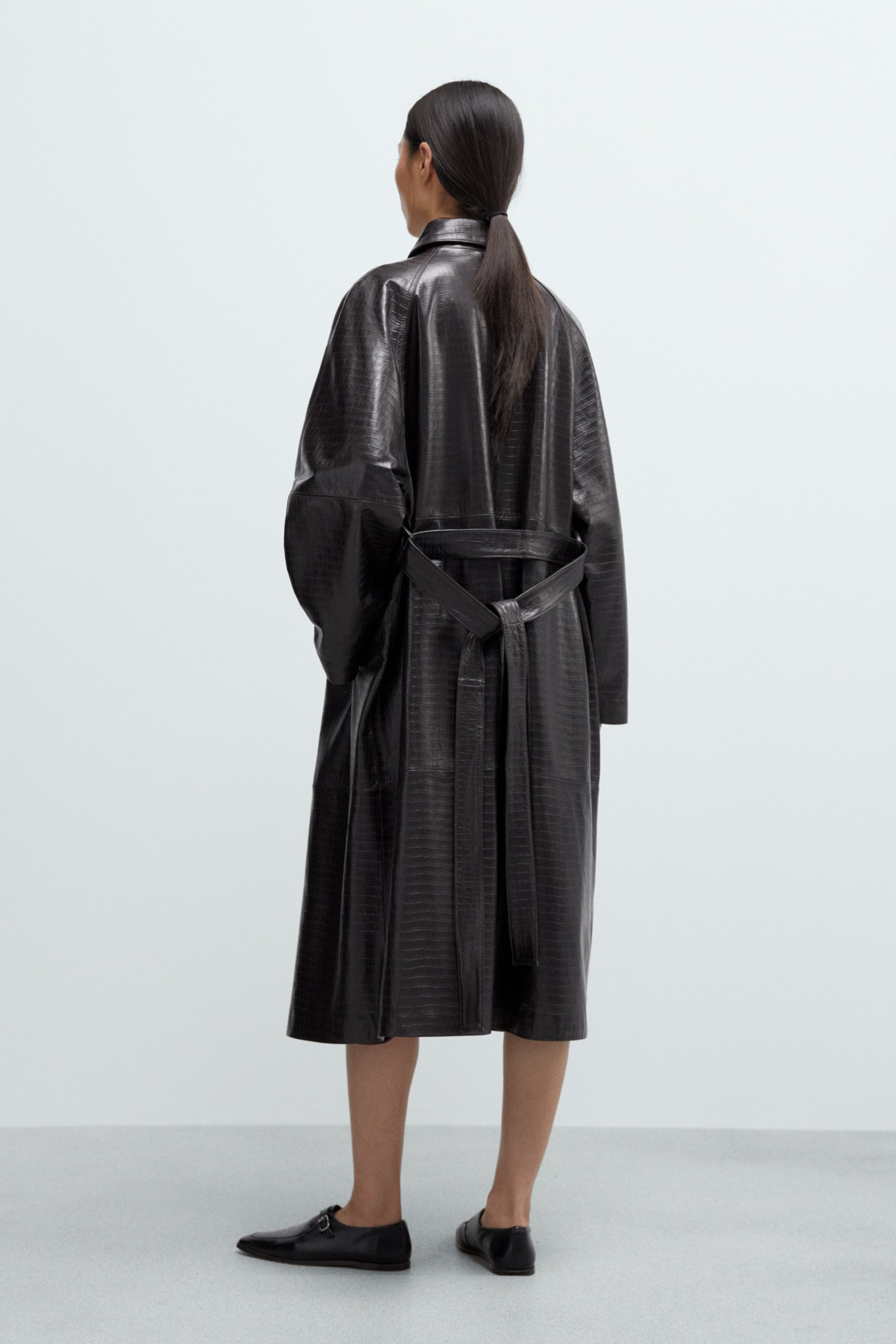 Premium lamb leather with crocodile embossing shapes this classic long trench coat. It features side pockets, a back vent, and front horn buttons, with only the top button visible. Finished with a matching belt for a refined silhouette. A piece for a lifetime.