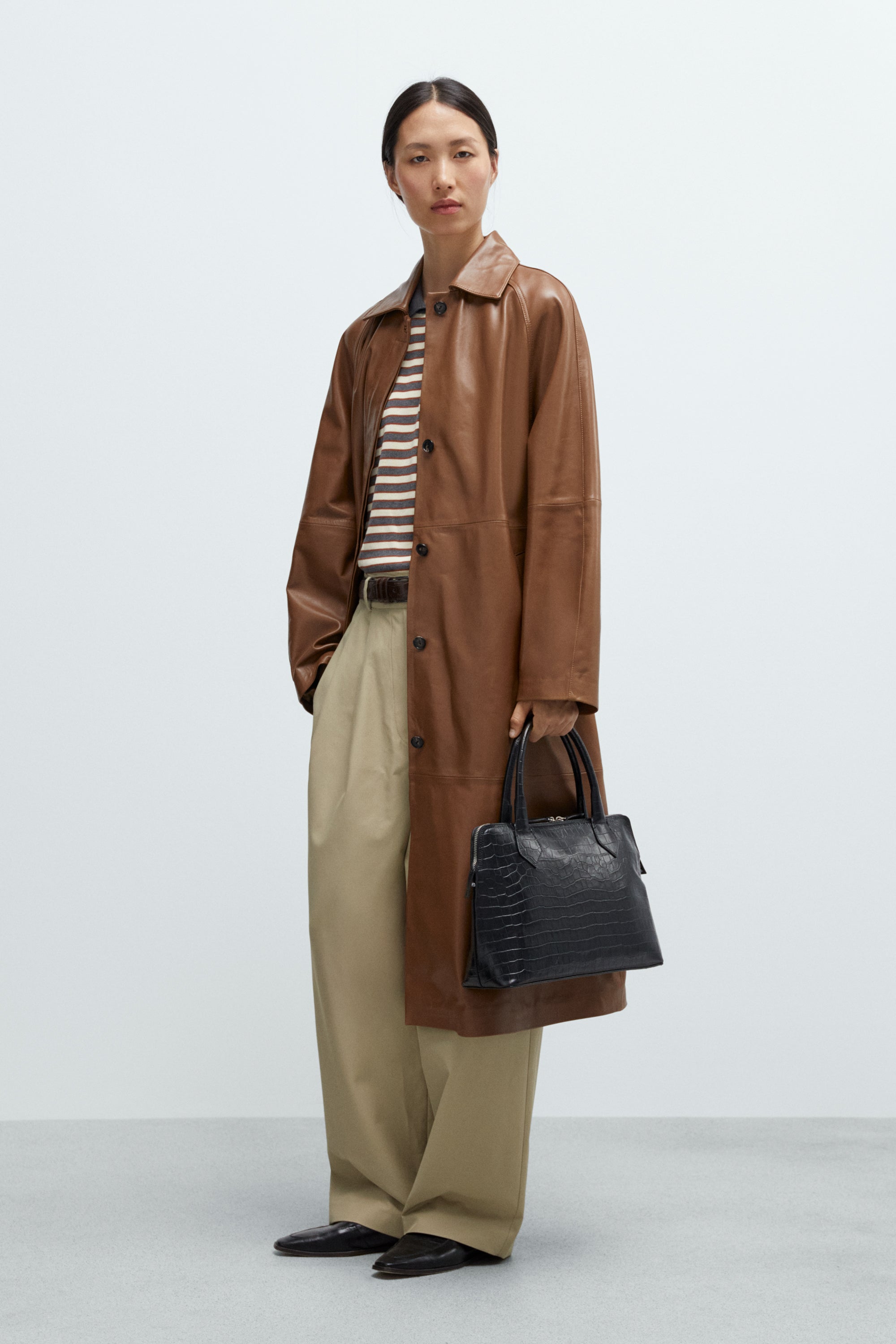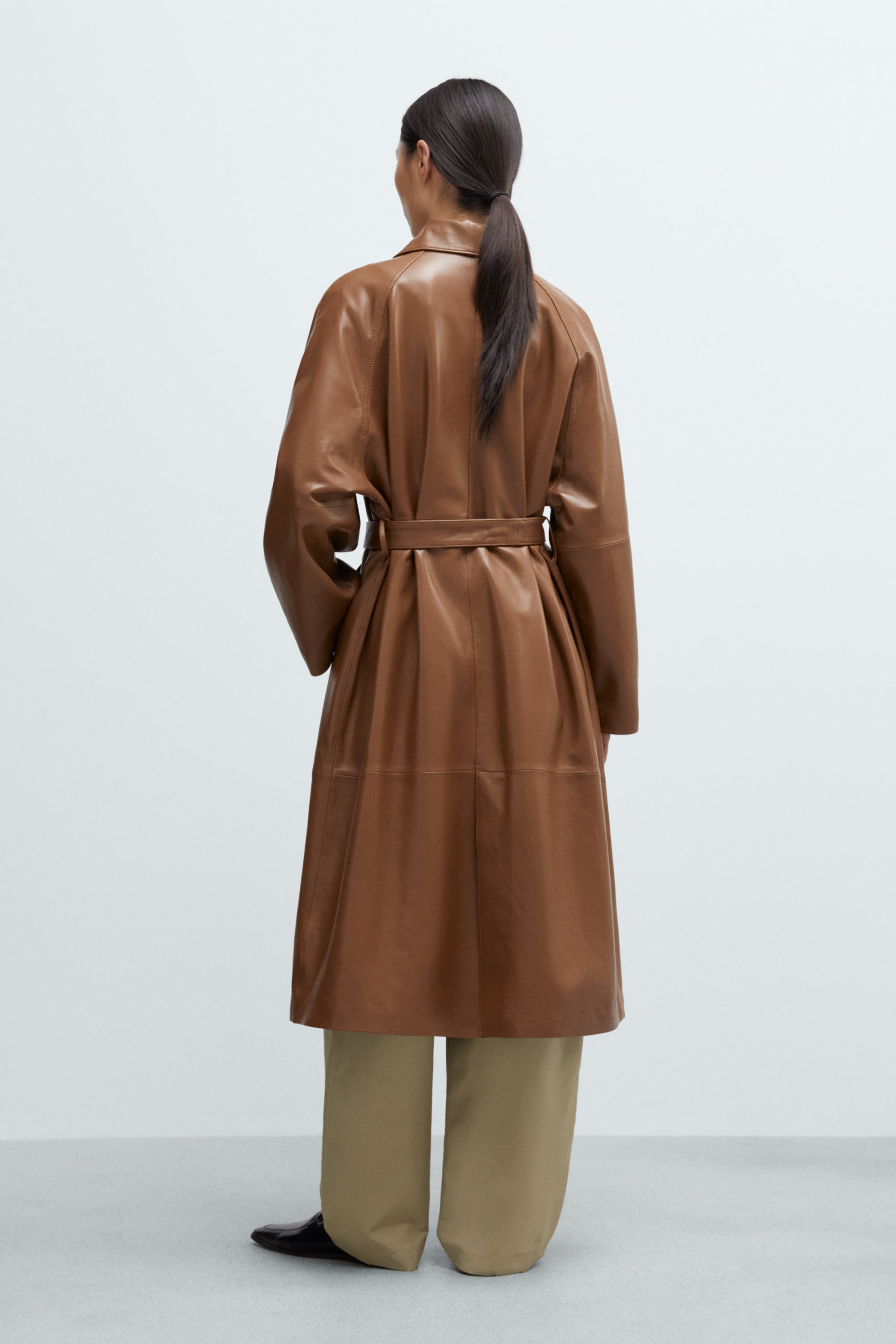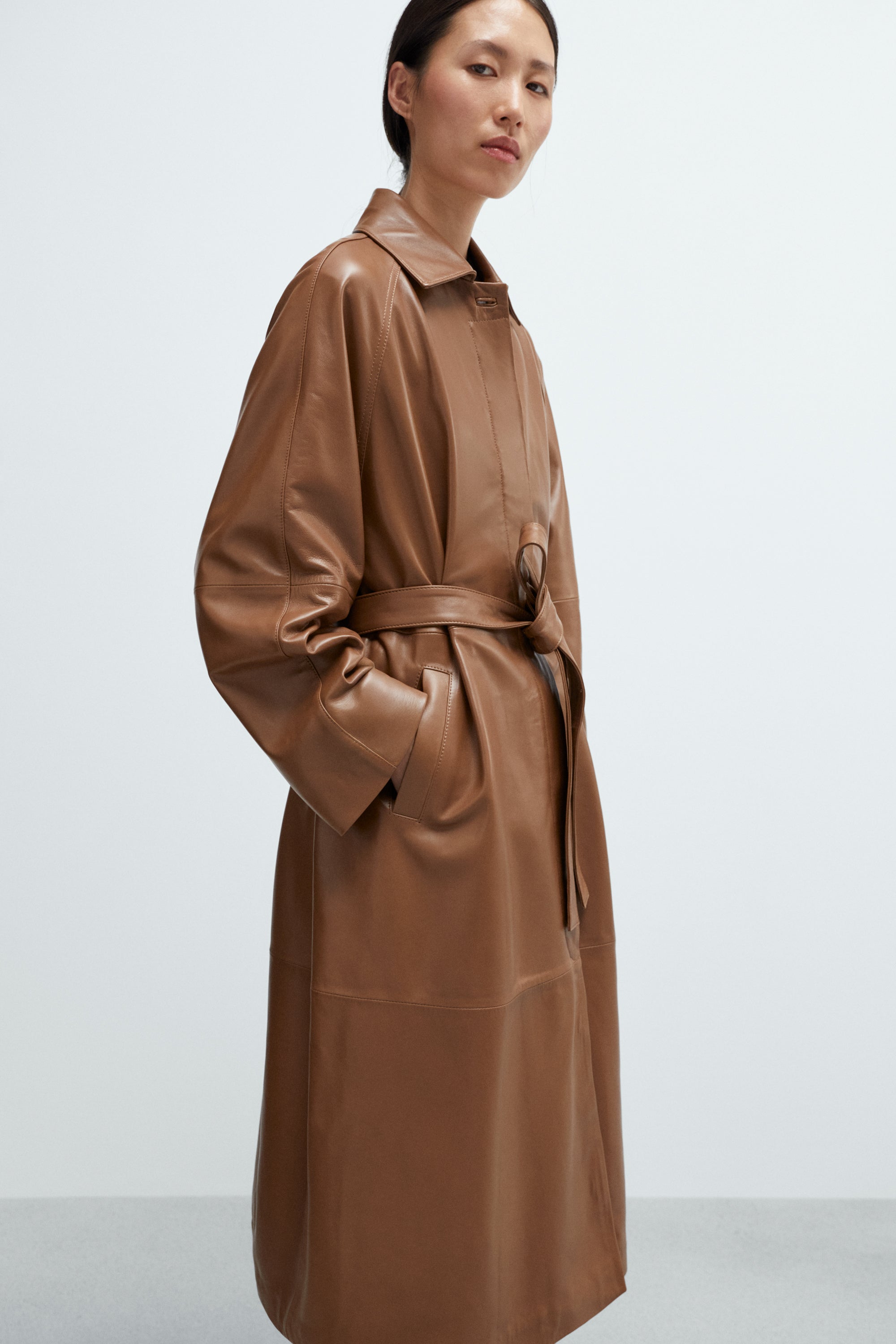 Premium lamb leather shapes this classic long trench coat. It features side pockets, a back vent, and front horn buttons, with only the top button visible. Finished with a matching belt for a refined silhouette. A piece for a lifetime.