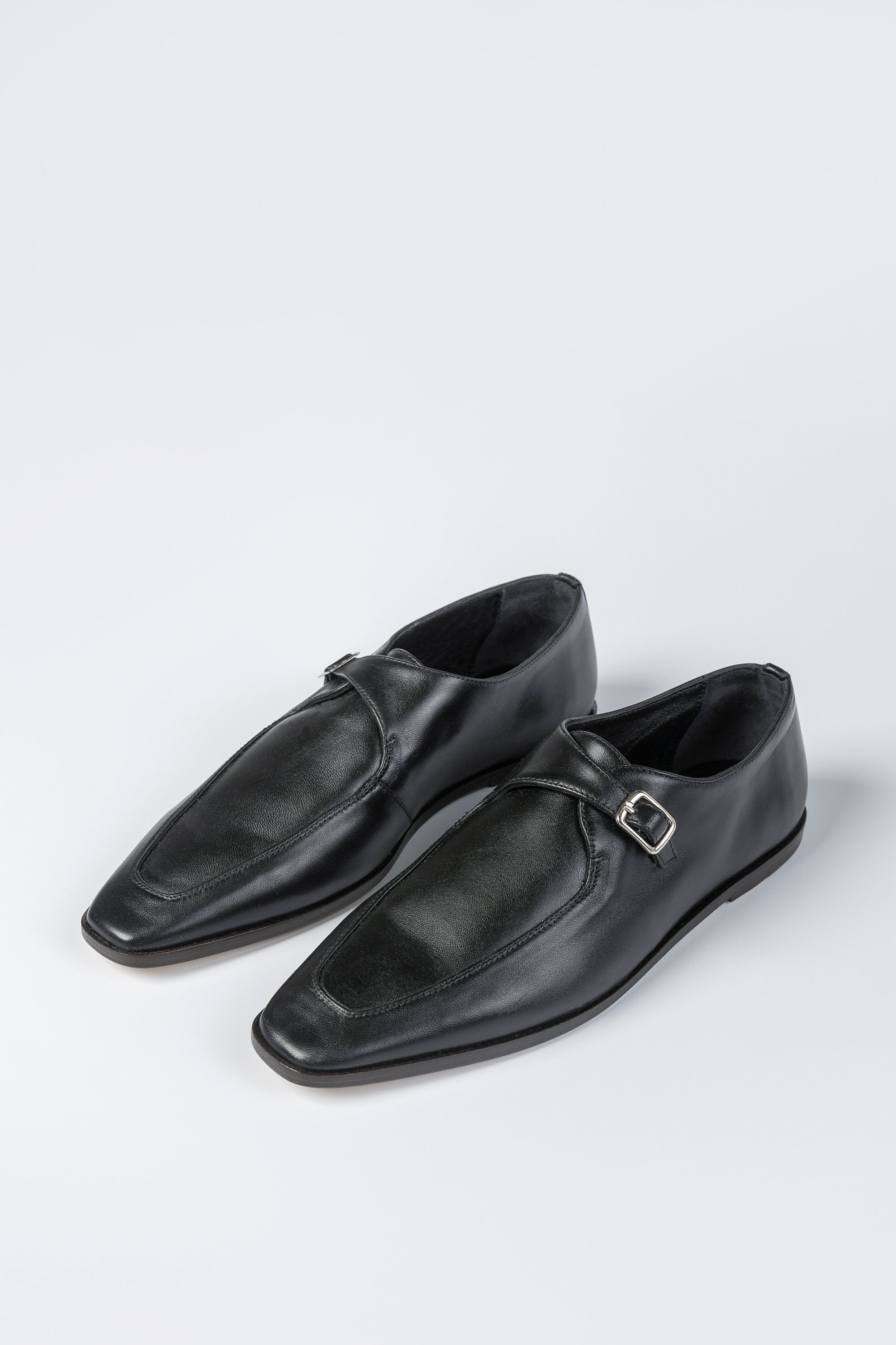 Crafted from high-quality, supple leather, these loafers feature a sharp, elongated silhouette with a square-pointed toe. The design is finished with a sleek buckle closure, adding a refined touch to their masculine, stylized character. A timeless and comfortable statement shoe, perfect for structured or relaxed looks alike.