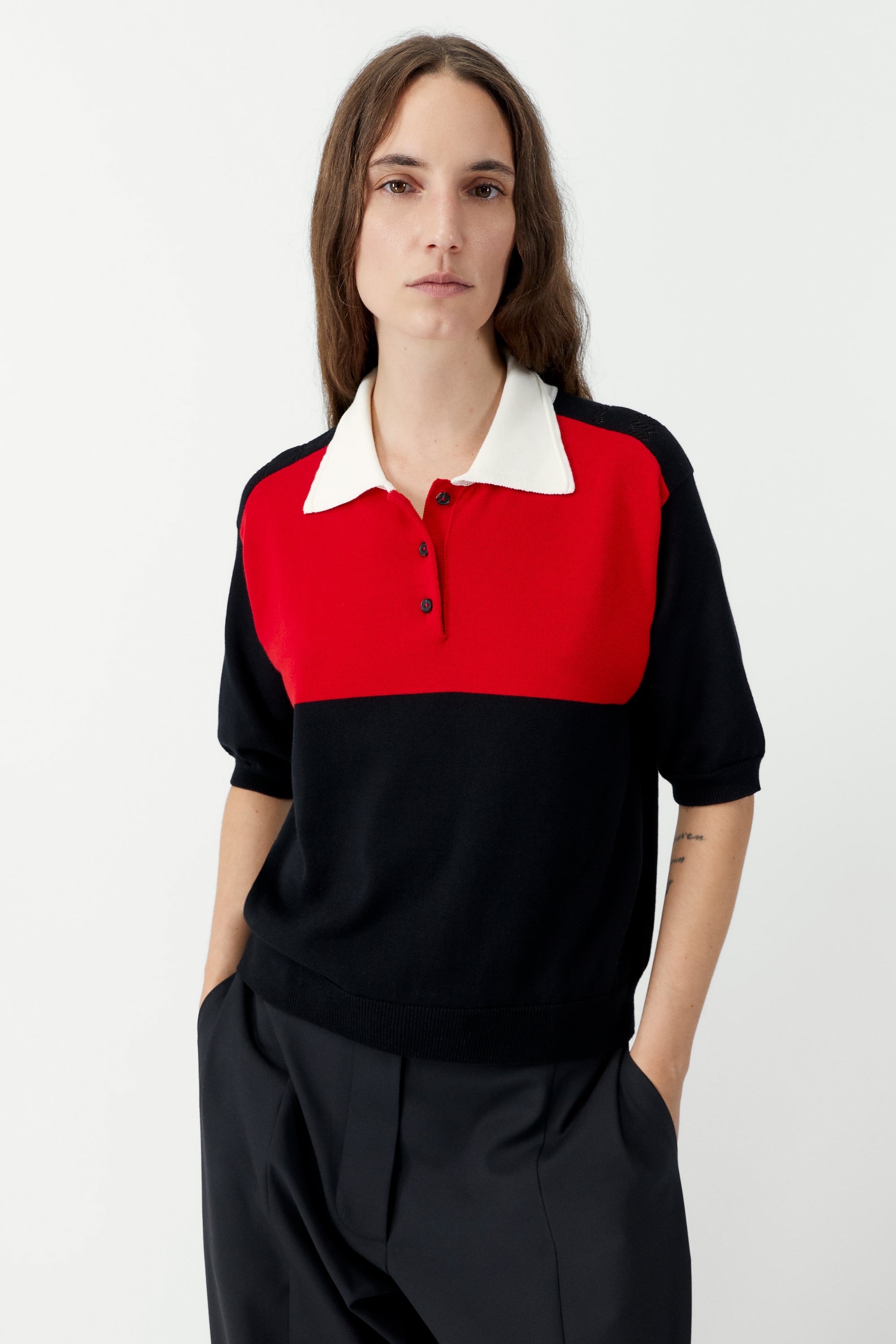 A classic polo silhouette in organic cotton, cut in a slightly oversized yet regular fit. Designed with a textured polo collar and a three-button placket, it stands out with a striking color-block front in black and red. The back contrasts in solid black, enhanced with subtle openwork detailing. A refined balance of structure, lightness, and modern design.
