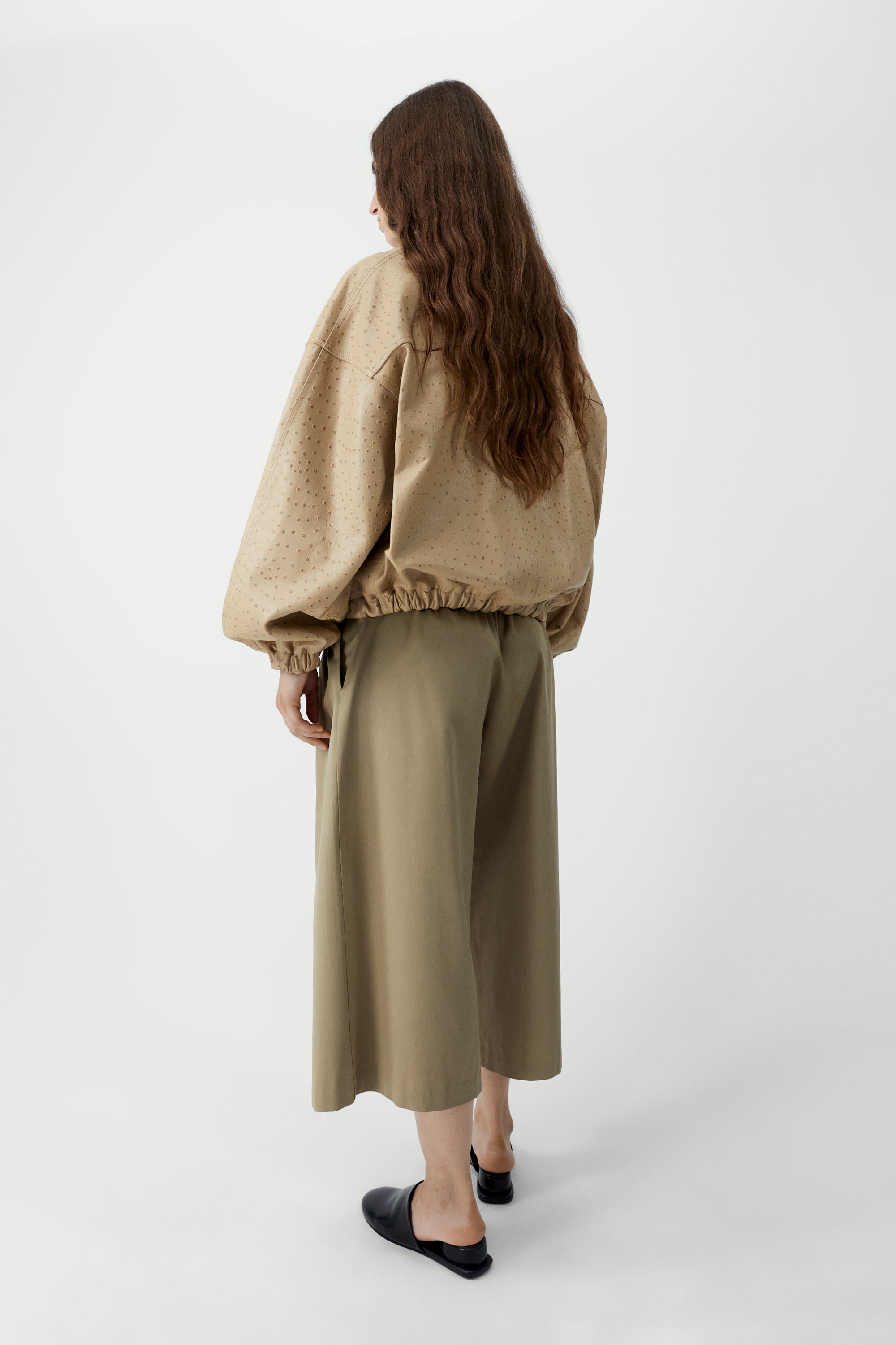 Spanish lamb leather of the highest quality, embossed with an ostrich effect, defines this iconic garment, carefully crafted to last. Designed in a classic bomber shape with an elasticized waistband and cuffs, it features side pockets and a zipper closure concealed beneath a snap-button placket. The lined interior, in viscose and cotton, ensures added comfort. A timeless piece made to endure a lifetime.