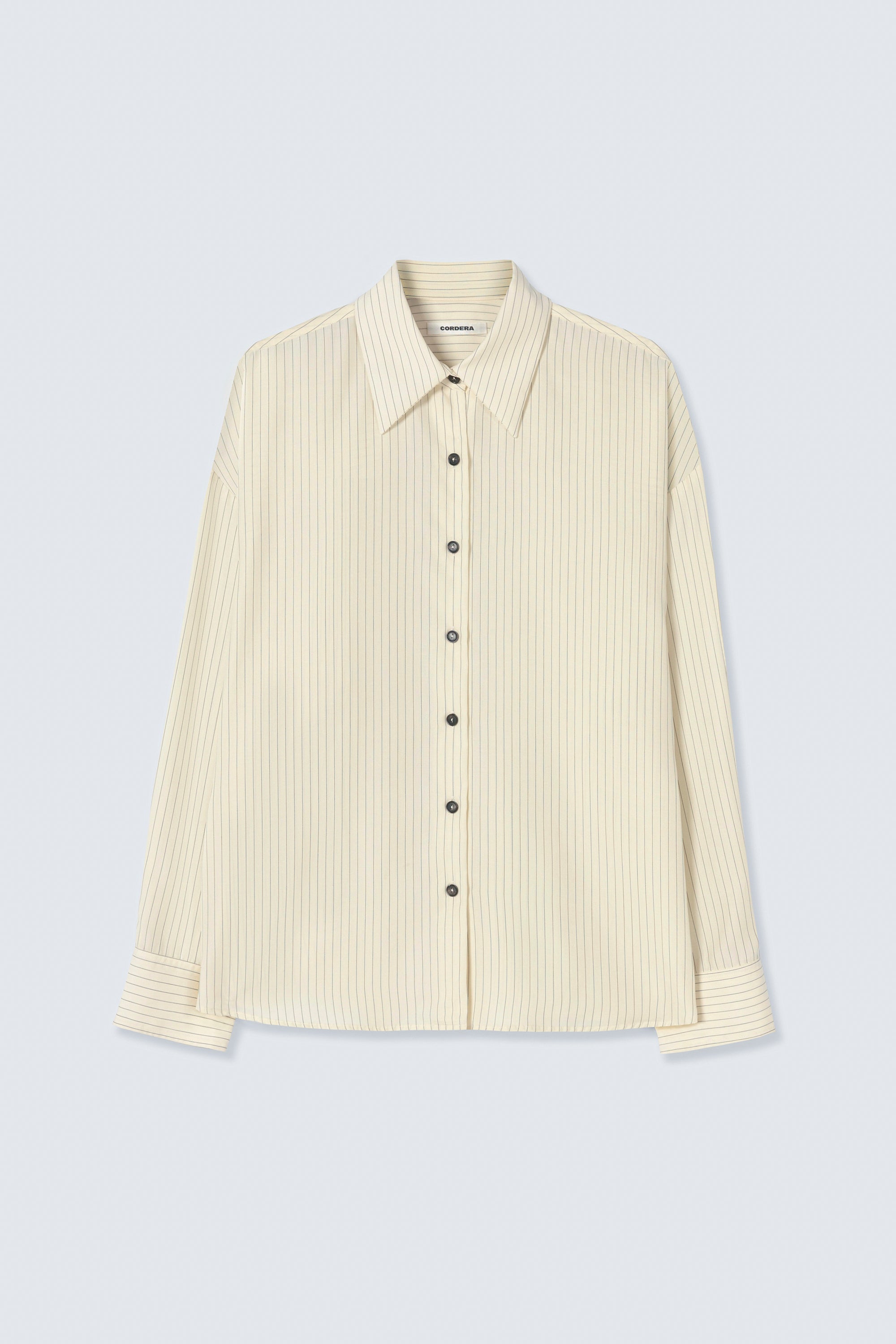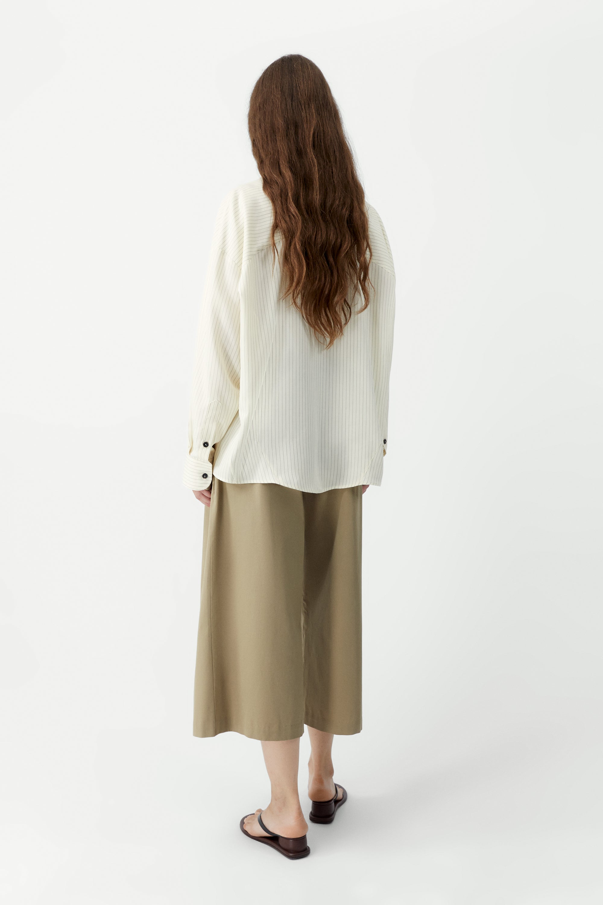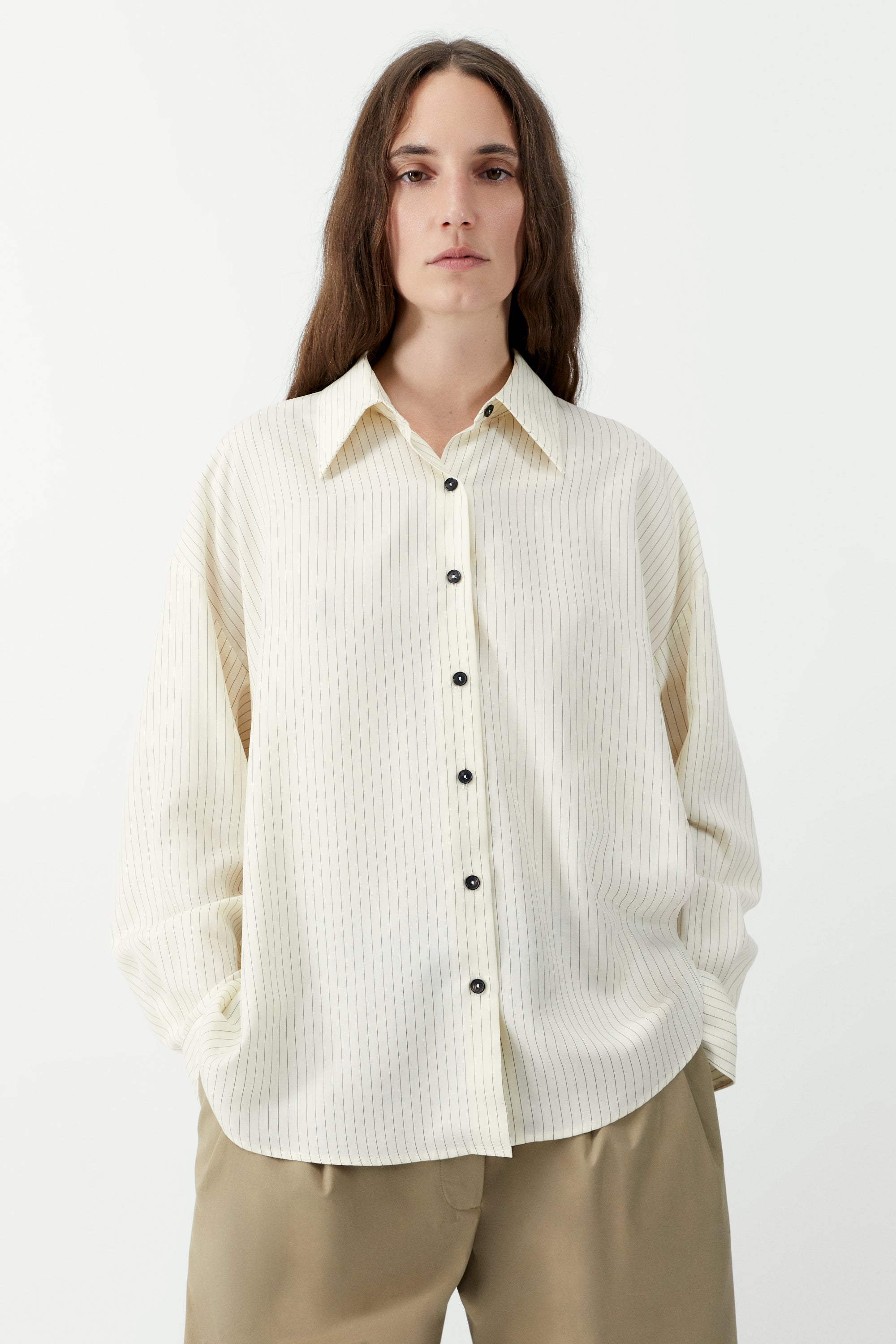 This oversized shirt features a relaxed, flowing silhouette with a soft, slightly structured back. Crafted in a pencil stripe fabric, it’s finished with an Italian collar and a front button closure. A timeless essential that blends ease, simplicity, and everyday elegance.