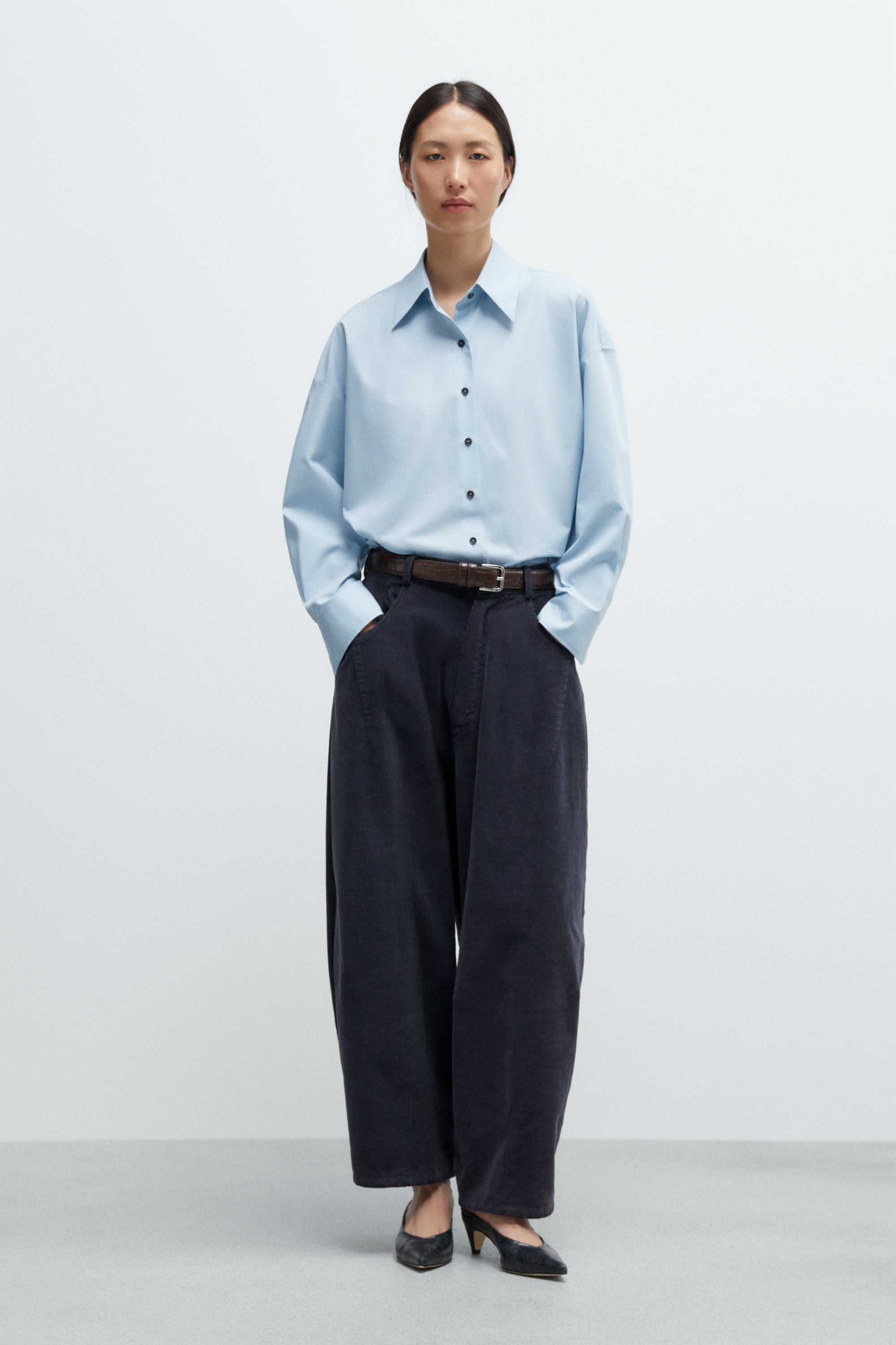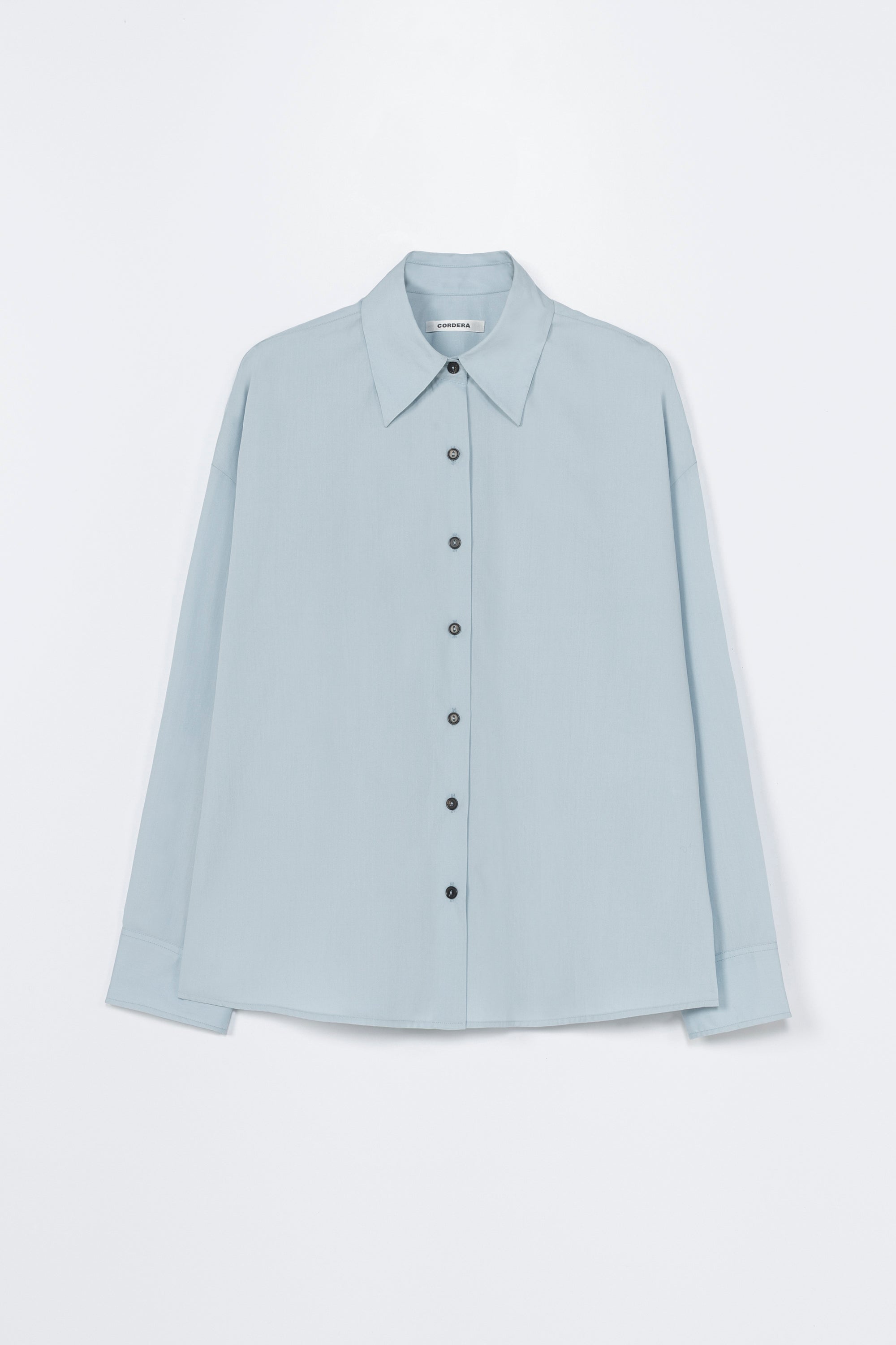 This oversized shirt features a relaxed, flowing silhouette with a soft, slightly structured back. Crafted in a solid, versatile baby blue, it’s finished with an Italian collar and a front button closure. A timeless essential that blends ease, simplicity, and everyday elegance.