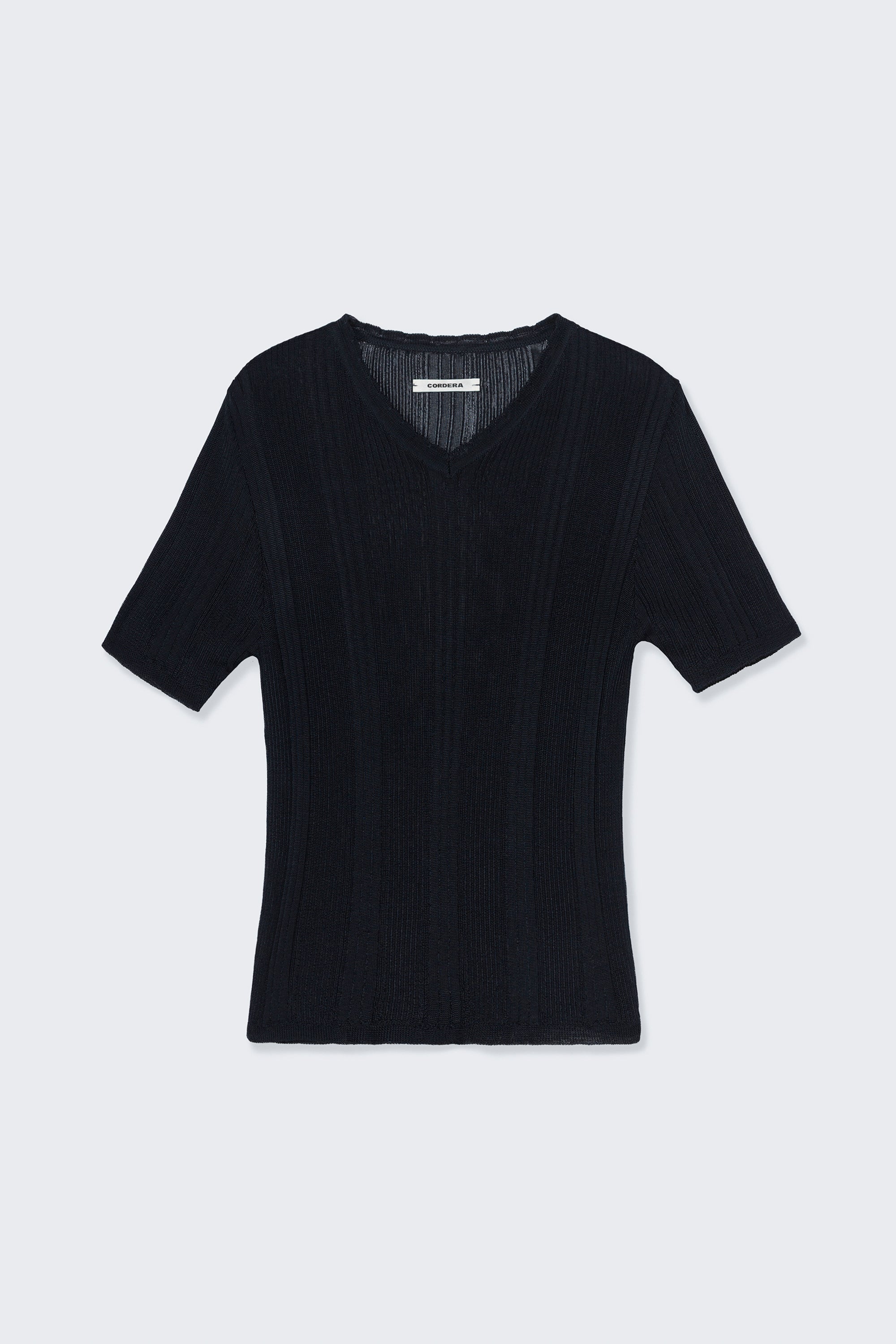 A finely ribbed knit t-shirt in a super-light fabric with natural stretch for a comfortable fit. Cut in a regular silhouette, it features a short sleeve and a refined V-neckline finished with delicate wave detailing. An airy, versatile piece that combines subtle texture with timeless ease.