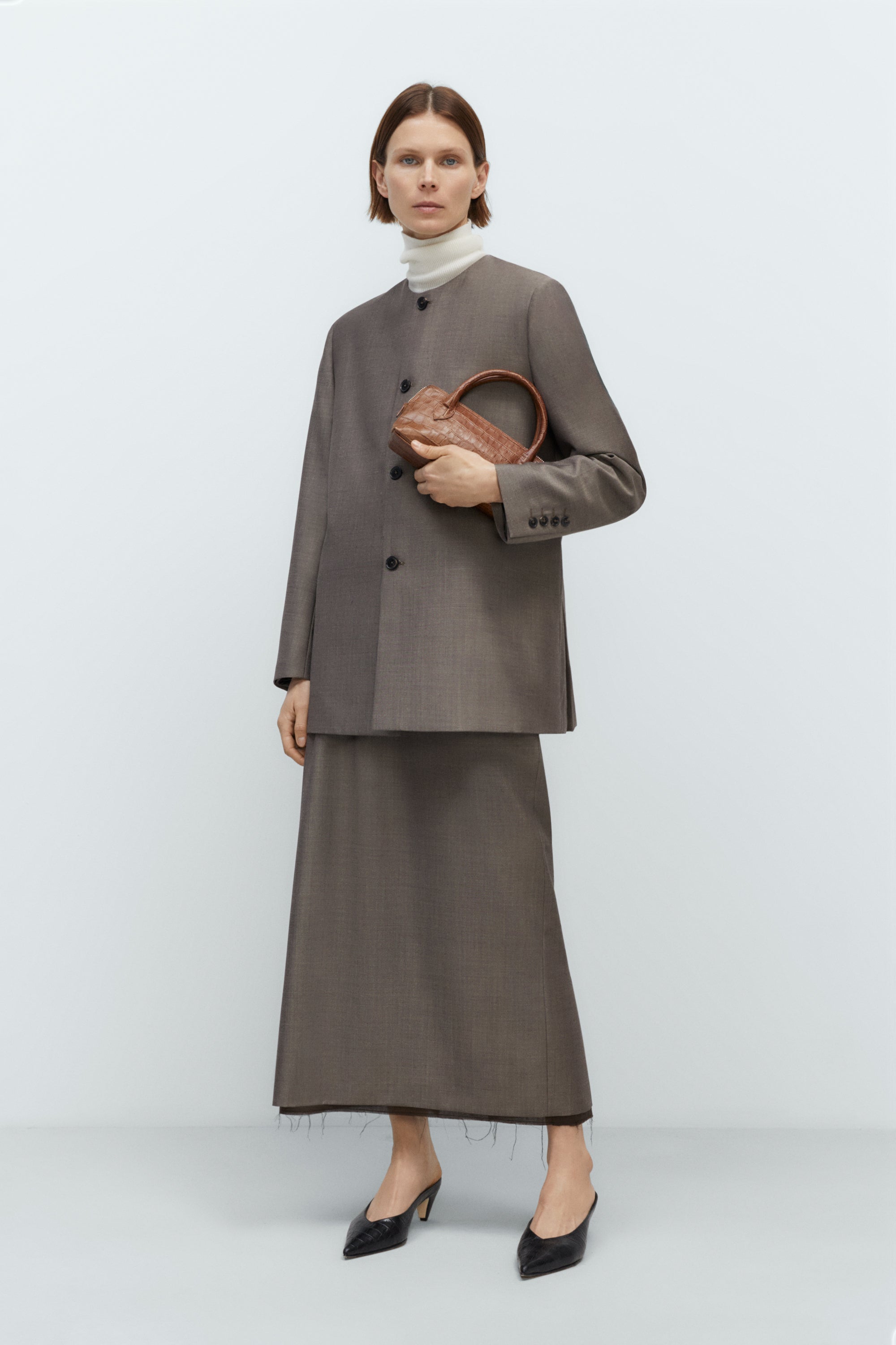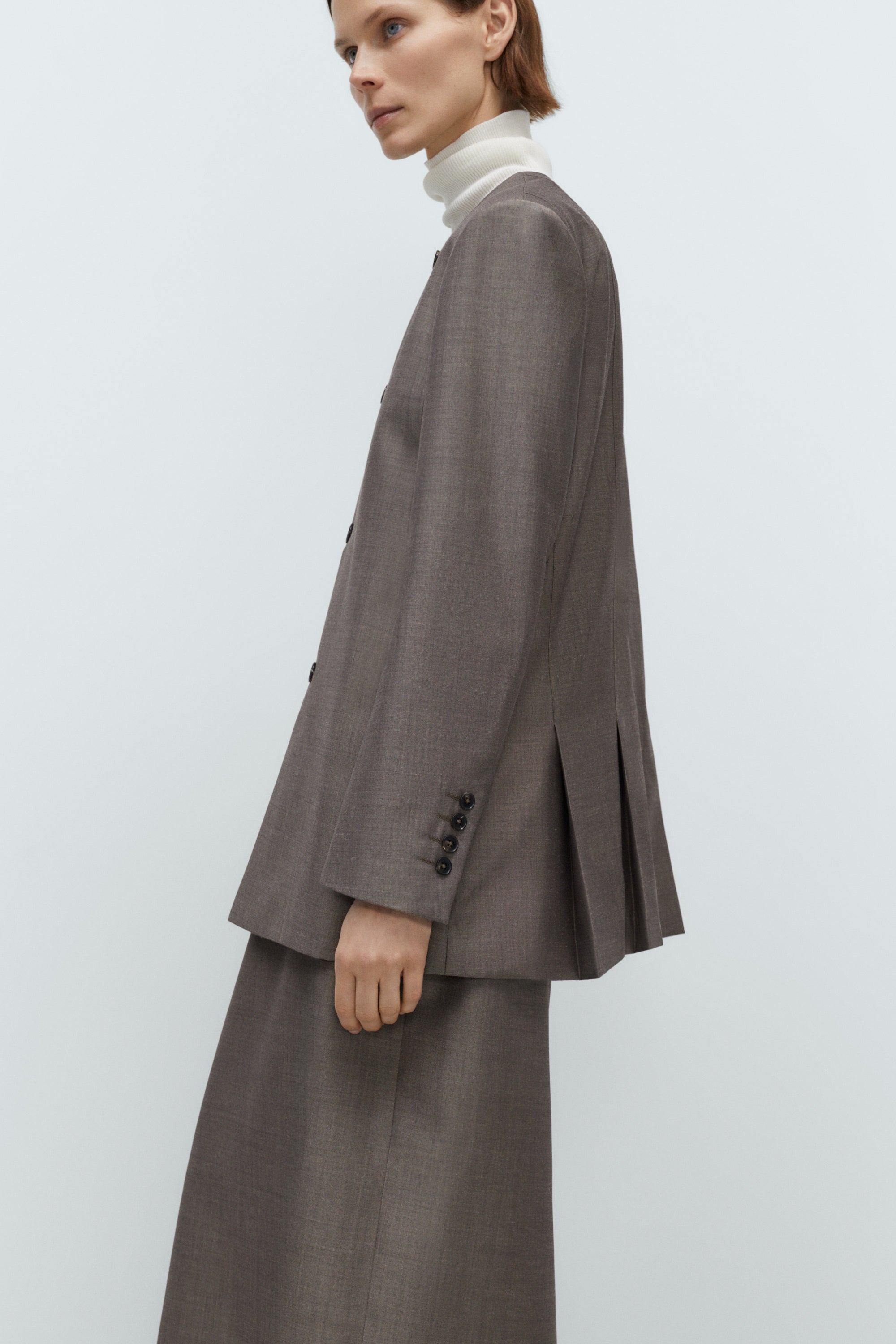 The perfect balance between elegance and versatility. Designed with a regular fit that flatters your silhouette, it features long sleeves and a round neckline for a minimal touch. The front horn button closure adds a refined detail, while the side pockets bring practicality. The pleated accents on the back offer movement and sophistication. Pair it with the New Tailoring Pants in Black for an impeccable look. A must-have addition to your wardrobe.