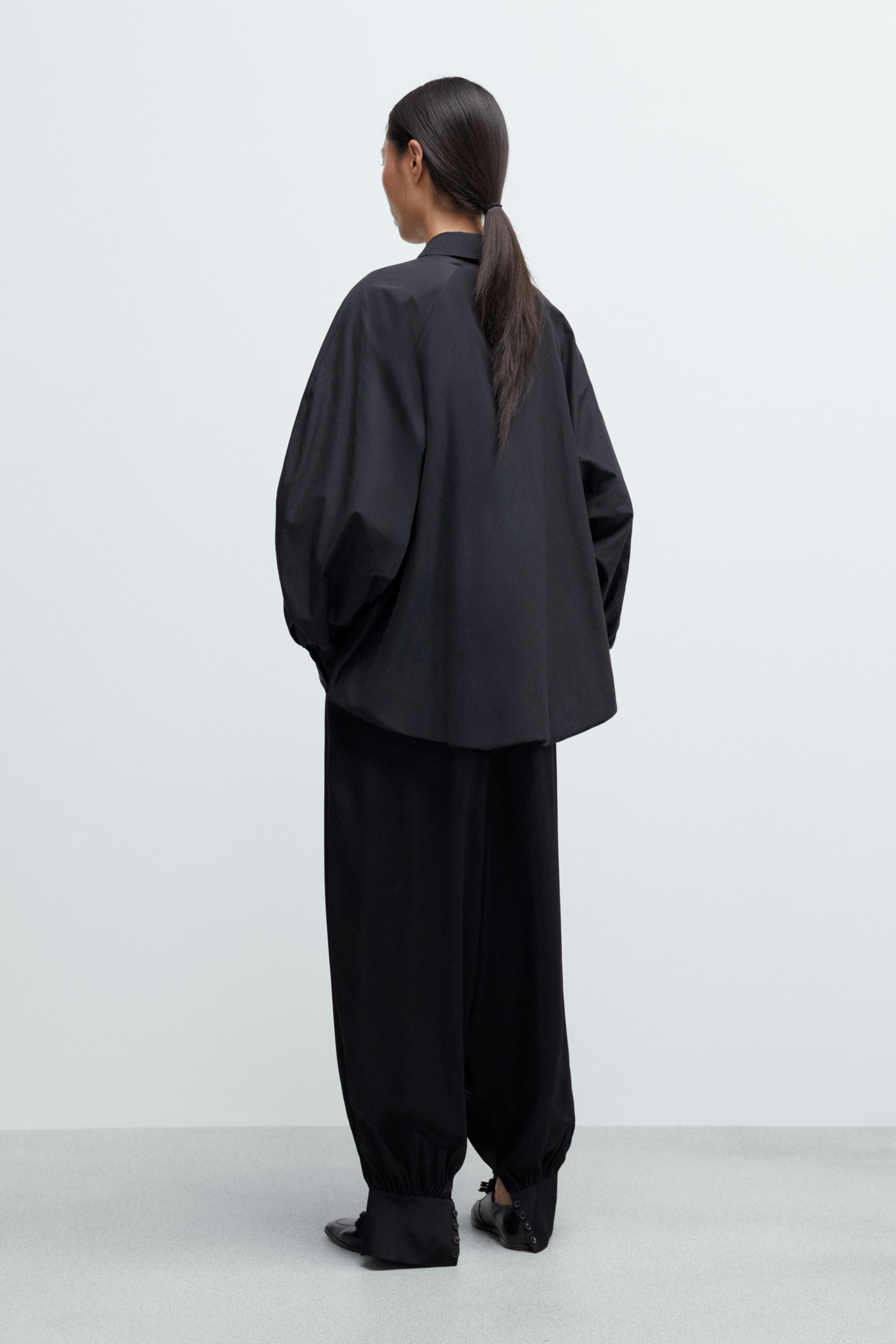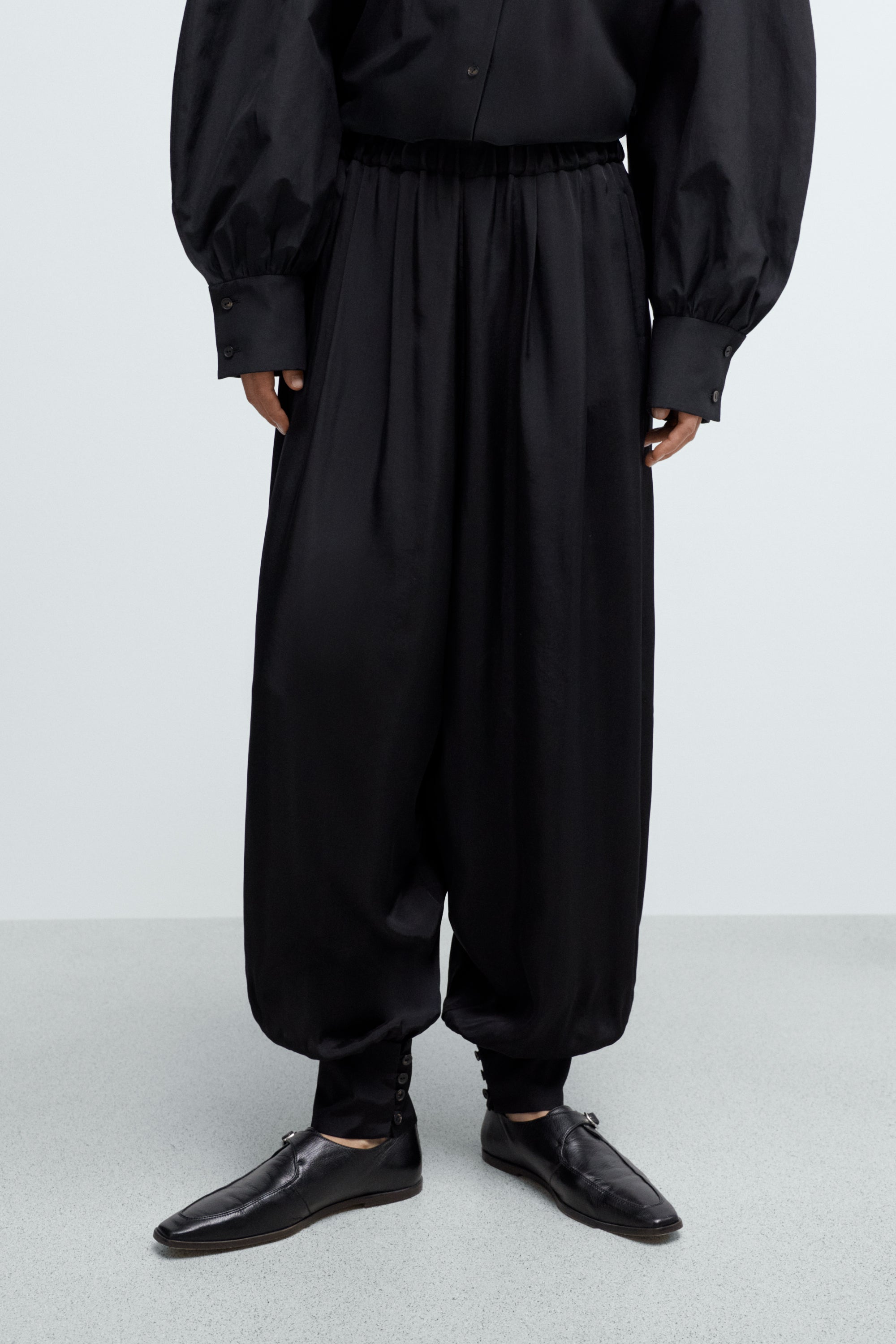 These sarouel trousers are crafted from an ultra-fluid fabric that drapes beautifully with a soft balloon shape. Designed with a low rise and a fully elasticated waistband for effortless comfort, they feature side pockets and cuffed ankles with four small buttons. The relaxed silhouette tapers gently at the ankle, enhancing the unique volume. Wear them on their own or as a set with the Balloon Shirt Black for a sophisticated yet easy look.