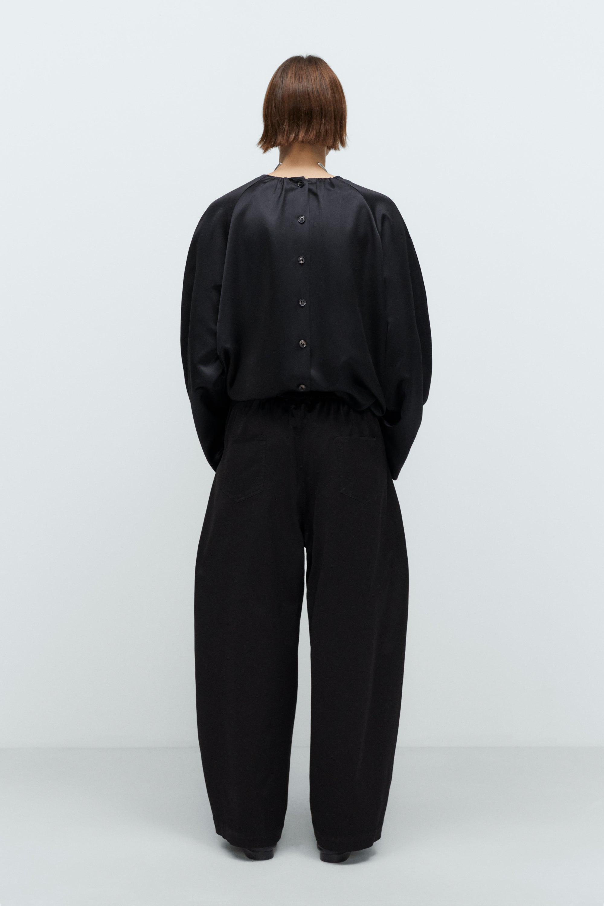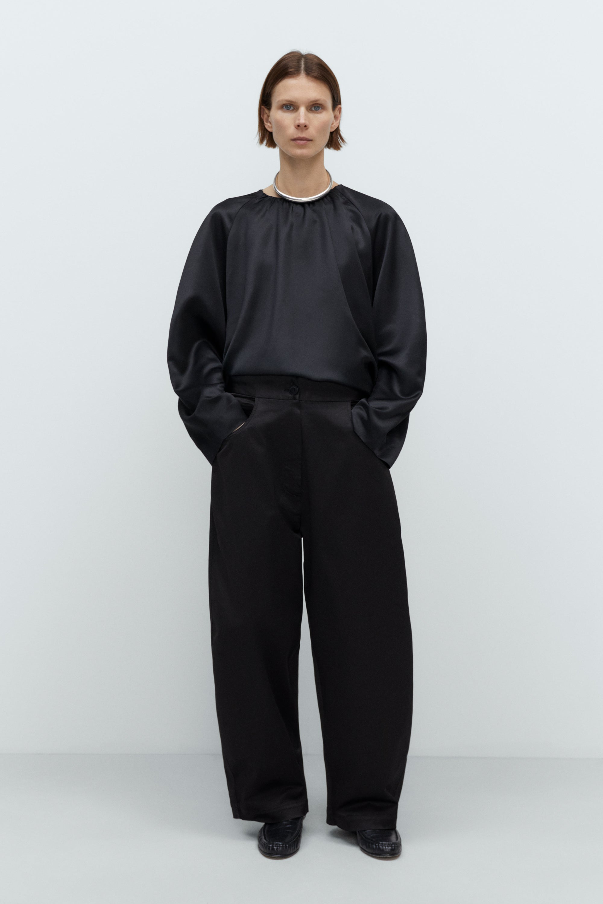 Our iconic curved shape with beautiful and soft satin fabric. Designed with elastic waist back, high rise and curved leg, finished with side and back pockets and zip fastening with metallic button closure. The satin, make this garment unique and combines perfectly with any shirt.