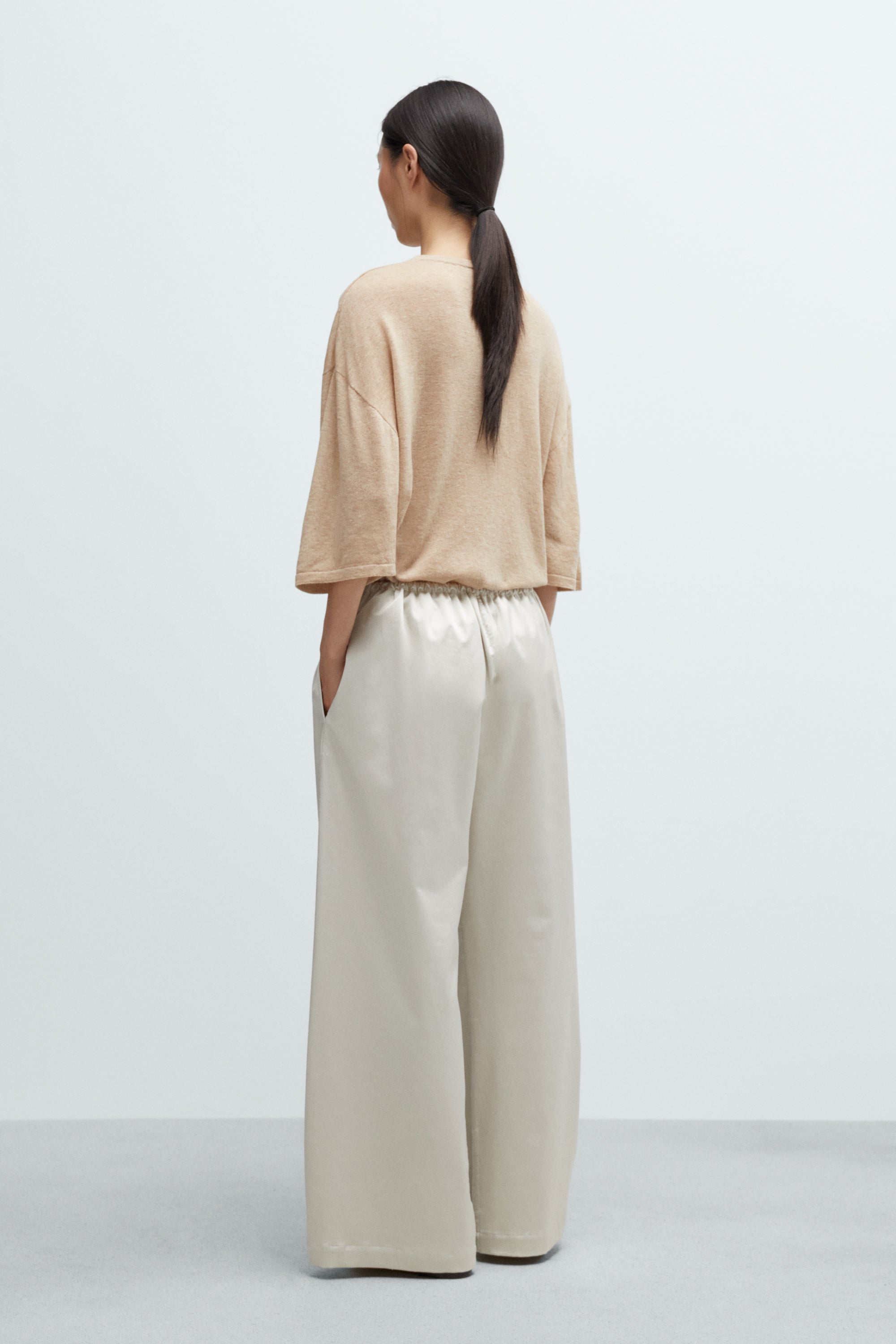 These satin drawstring pants offer an oversized fit and long length, combining effortless elegance with ultimate comfort. Crafted from a high-quality, substantial yet soft fabric, they drape beautifully while maintaining structure. The fully elasticated waistband with adjustable drawstring ensures a personalized fit, complemented by sleek vertical side pockets that enhance the streamlined silhouette. A sophisticated piece that effortlessly elevates casual wear with a refined, modern touch.