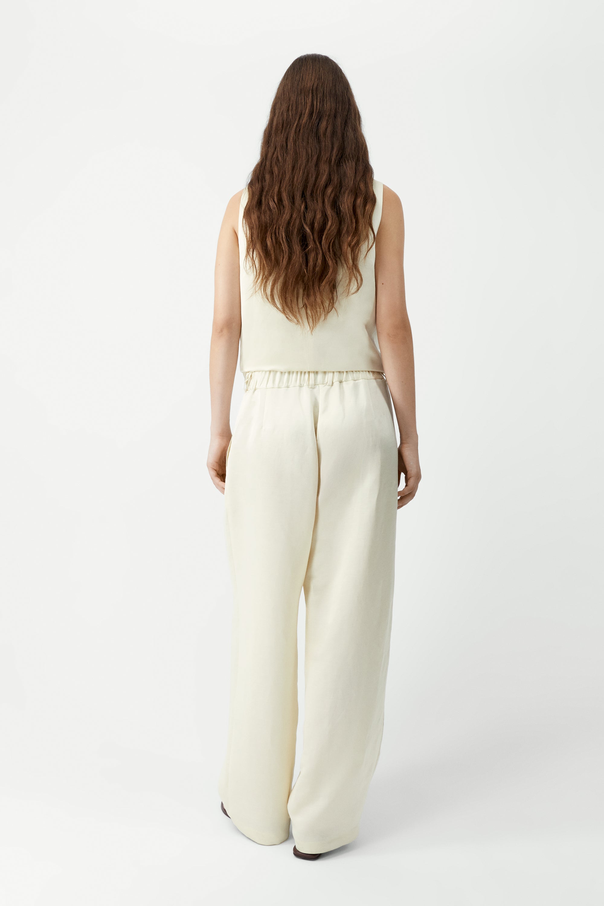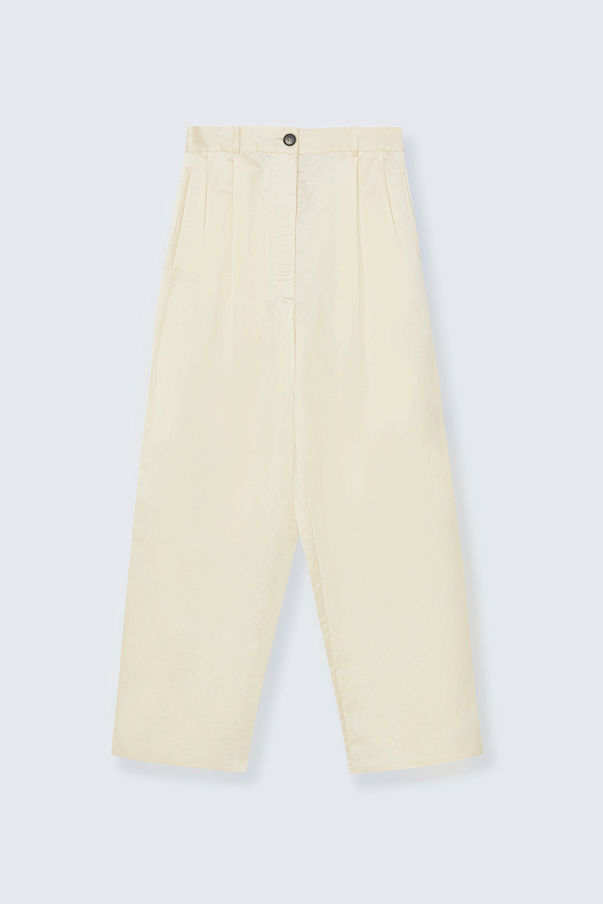 These tailored pants are crafted from a fluid satin fabric with a luxurious handfeel, reinterpreting a timeless silhouette with elevated ease. Designed with a loose, masculine fit, they sit at mid-rise and feature double front pleats for added structure. Details include jetted side pockets, back welt pockets, an elasticated waistband at the back, zip and button closure, and belt loops. A refined piece that combines clean lines with a sophisticated, flowing elegance.