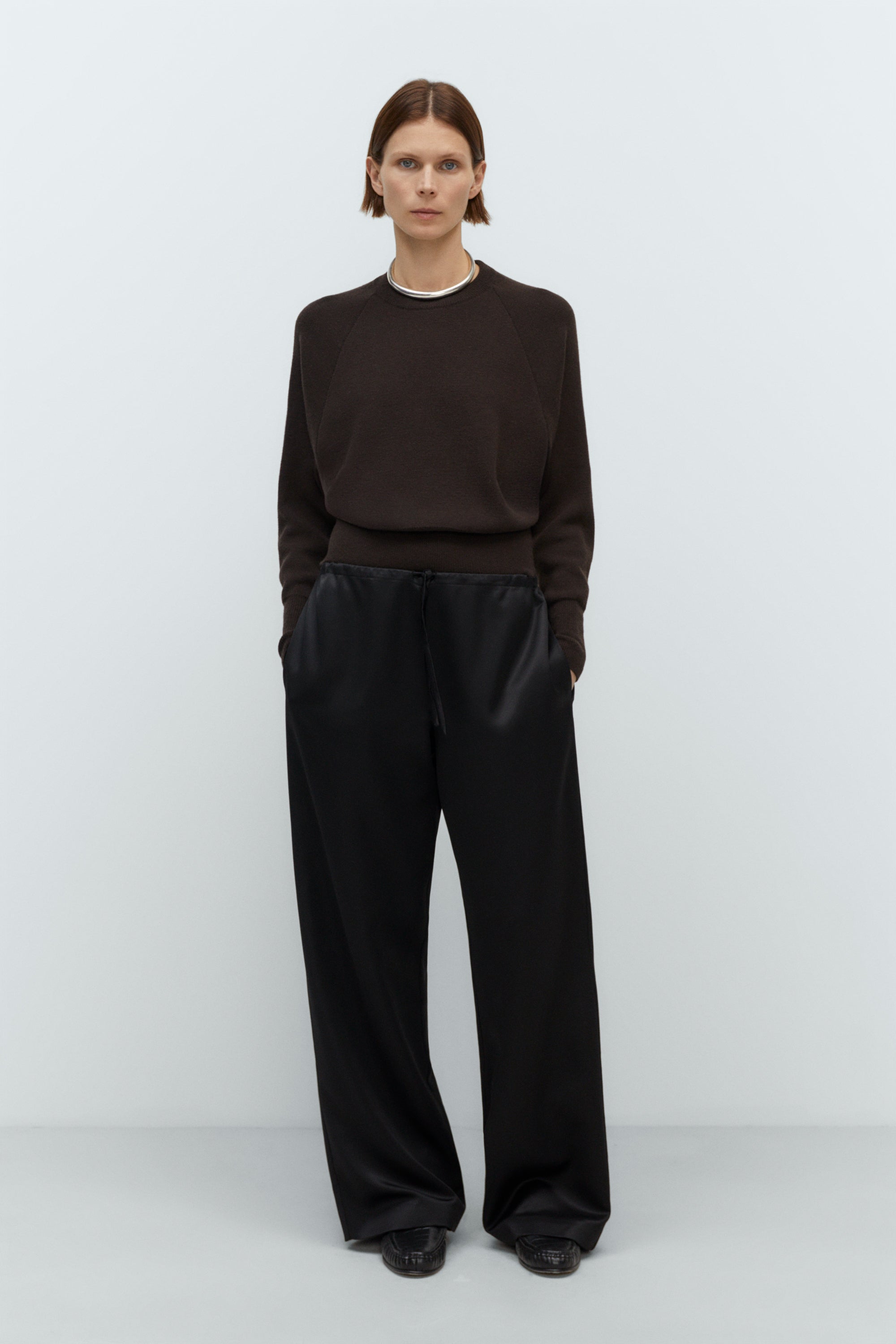 Relaxed, oversized fit pants with an adjustable drawstring waistband for a custom fit. Featuring side pockets and a slightly flared, long silhouette. A chic, comfortable option for laid-back days.