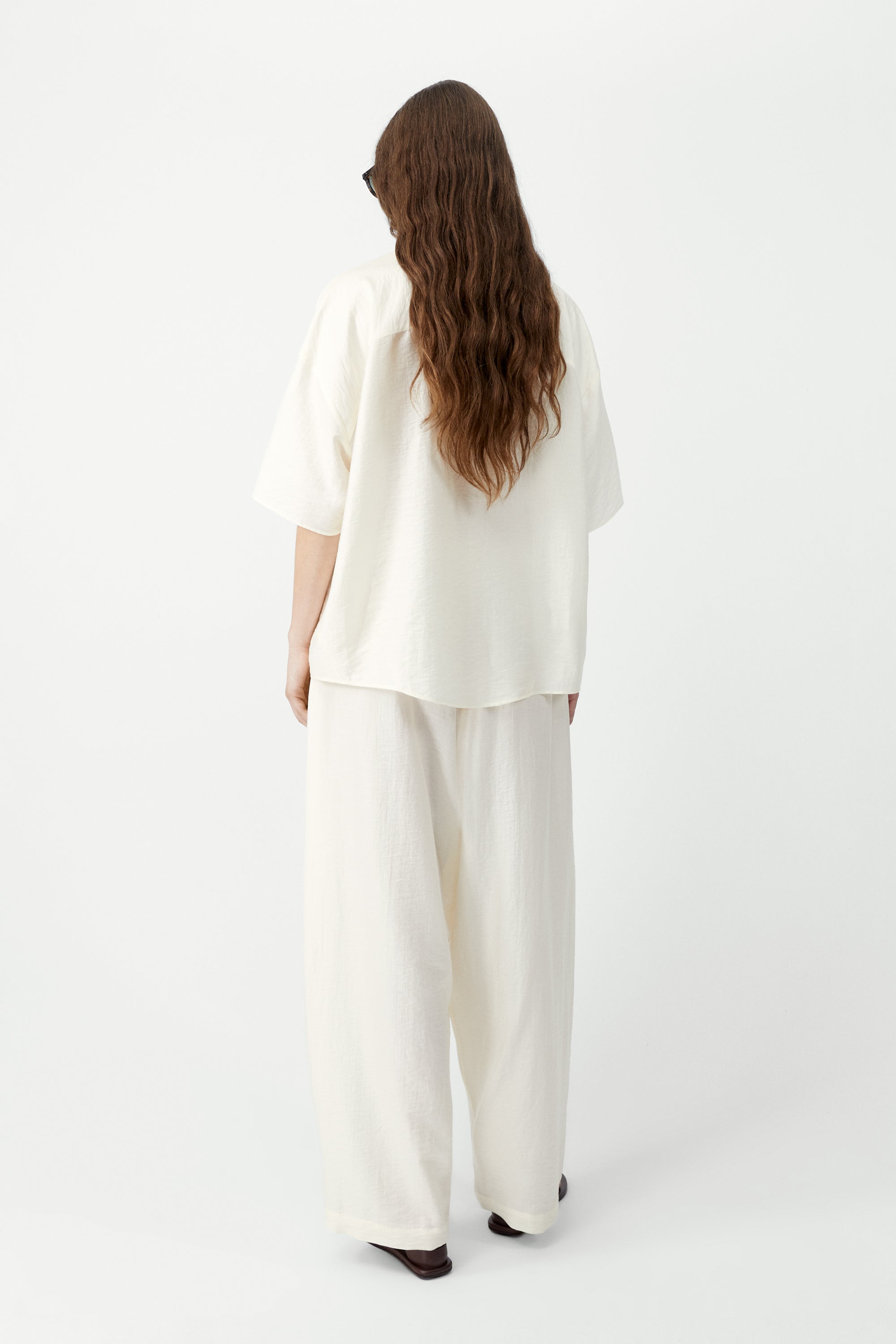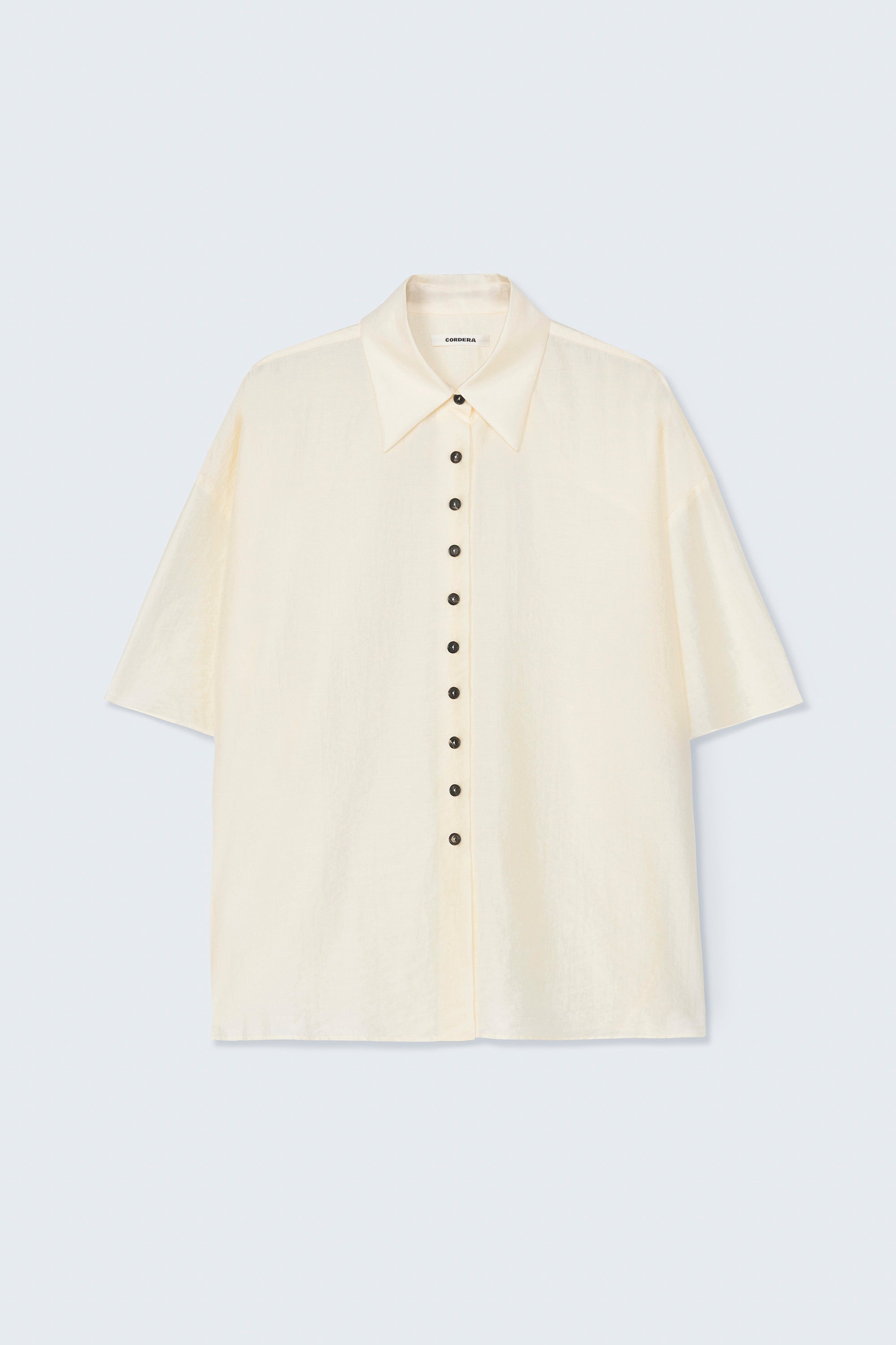 An oversized, cocoon-shaped shirt crafted in super-lightweight fabric for effortless comfort. The roomy short sleeves and relaxed silhouette create a modern, fluid fit, while a pointy collar adds a sharp touch. Small contrasting buttons run down the front, completing this easy, stylish piece that blends comfort and timeless appeal.