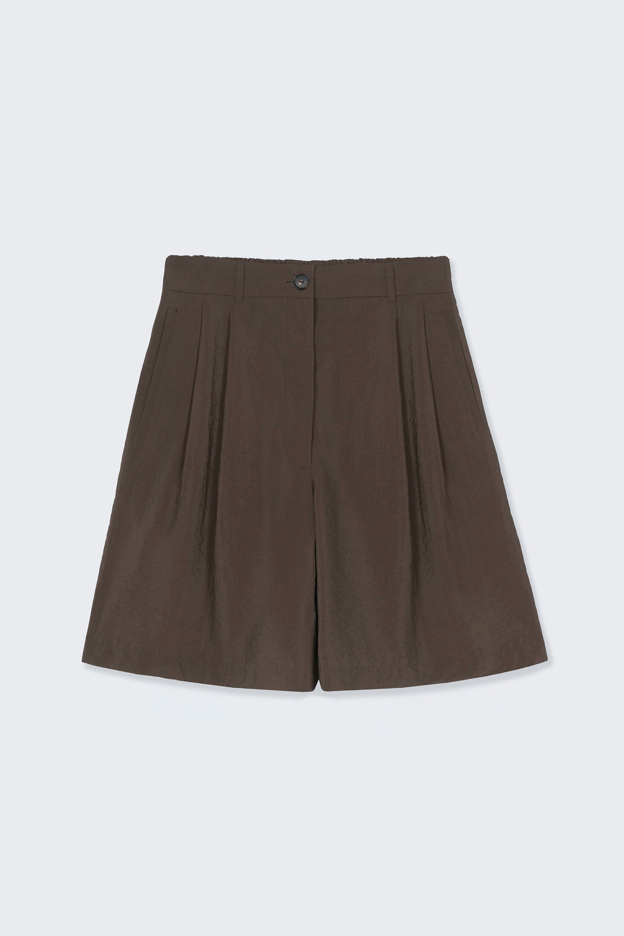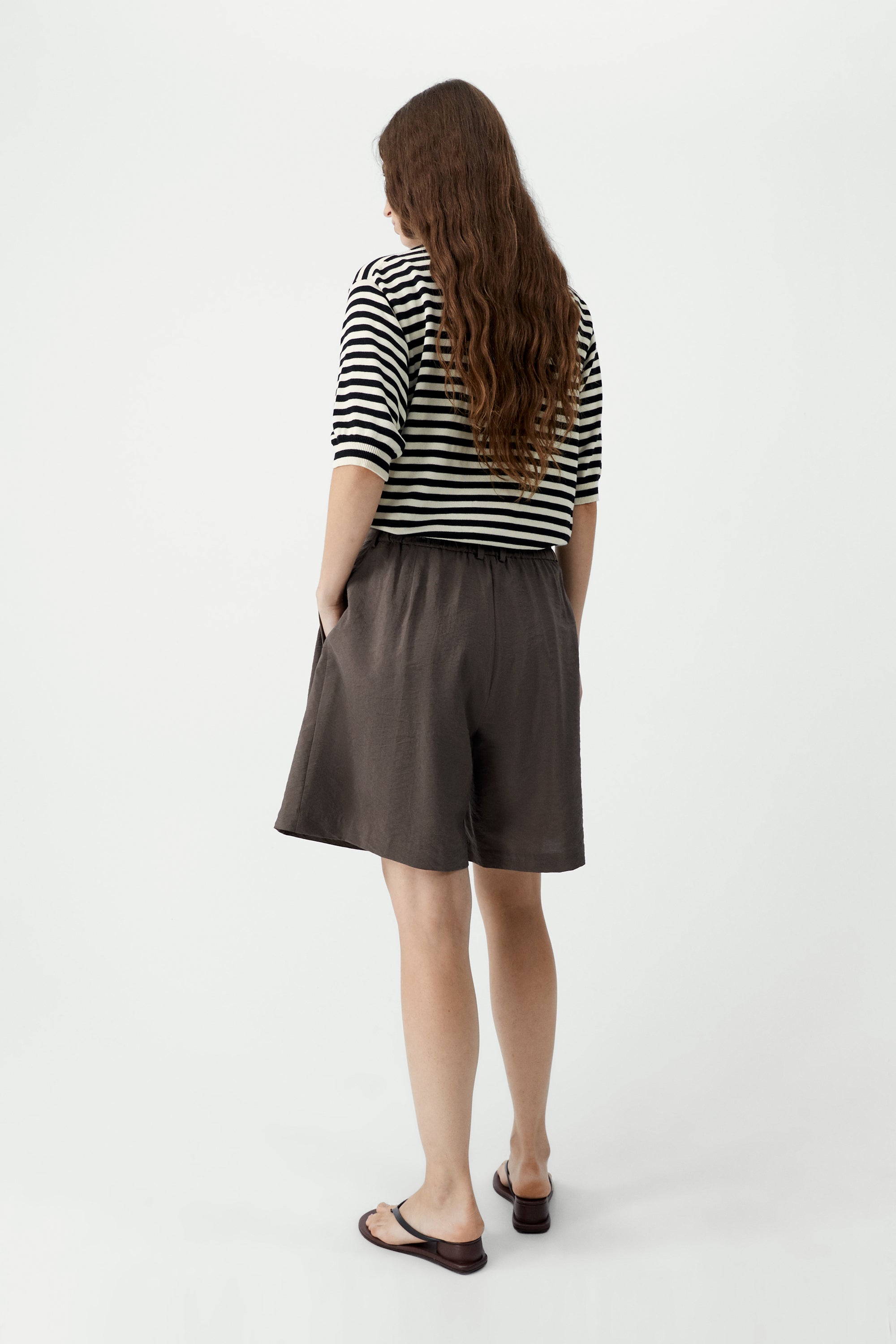 These silk Bermuda shorts feature a classic fit with double front pleats and a length that sits just above the knee. Designed with belt loops and jetted side pockets, they create a clean, streamlined silhouette, with no back pockets for a minimalist touch. An elasticated back waistband ensures all-day comfort, while the front button closure adds a polished finish. Crafted from high-quality, lightweight silk, these shorts are an effortless and sophisticated choice for summer.