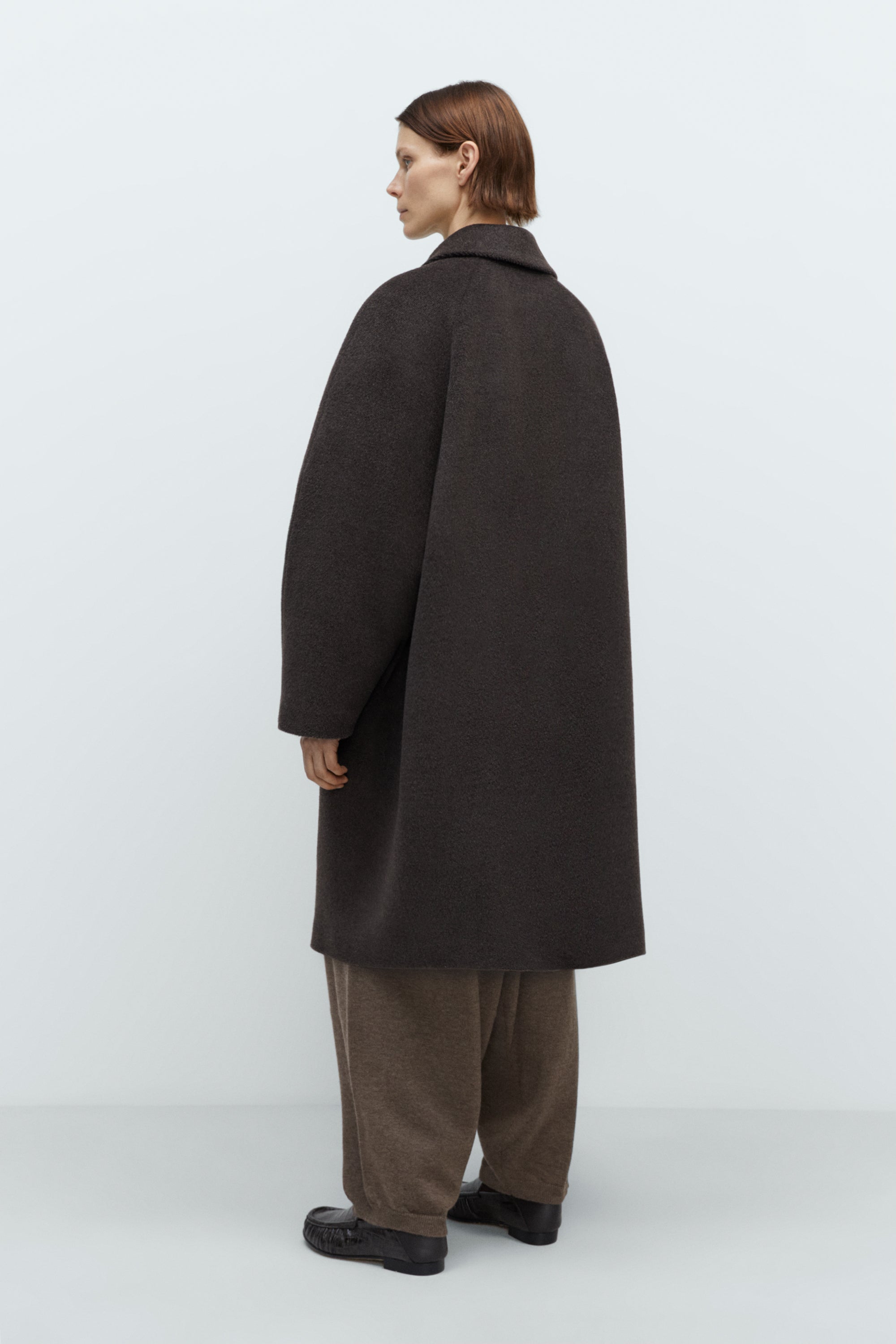 A classic everyday coat with a mid-length cut and an oversized fit, making it a comfortable wardrobe staple. Made from warm and soft, high quality Virgin Wool. Detailed with an Italian collar, front horn buttons, and side pockets. Finished with a fully lined interior in 100% Viscose.