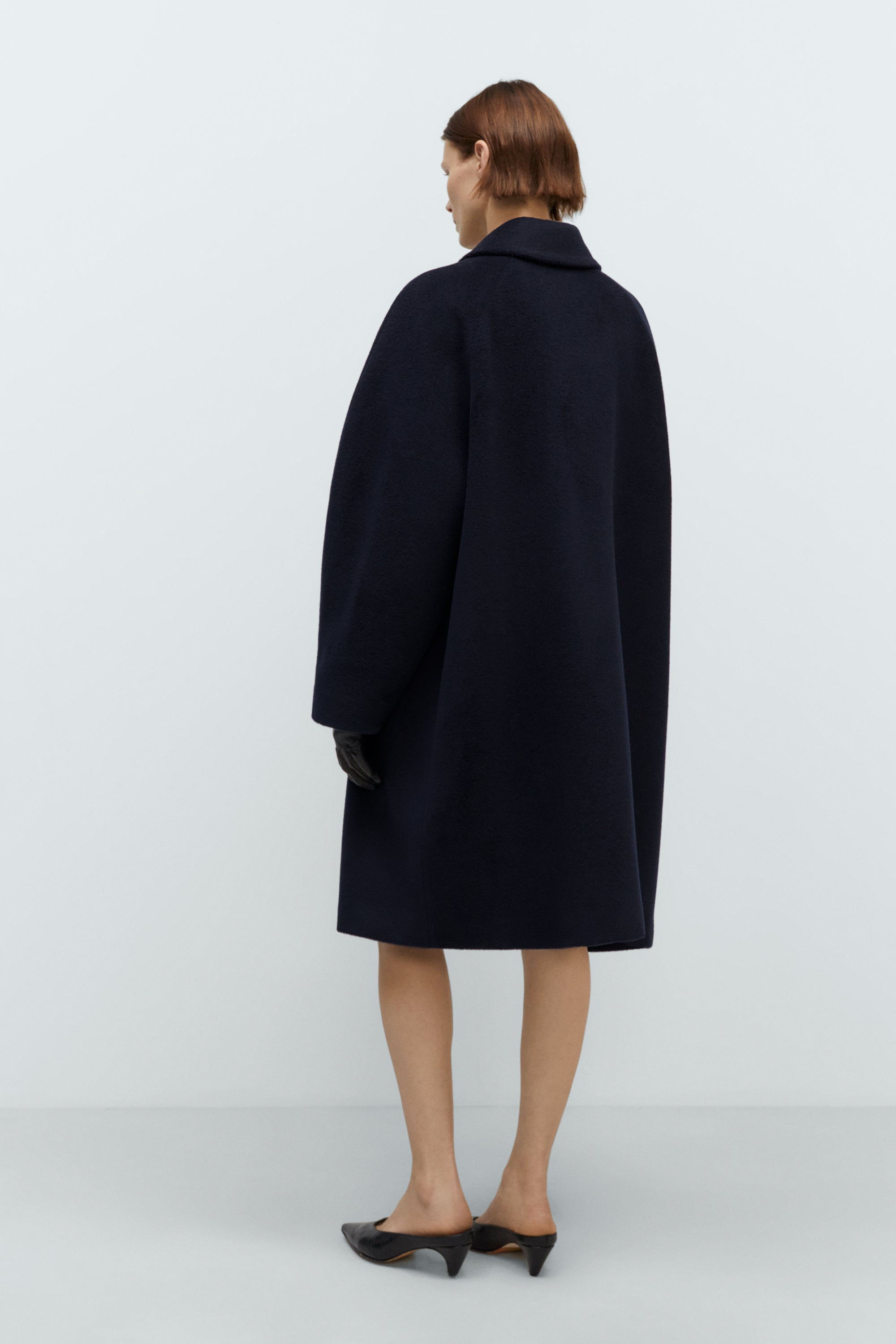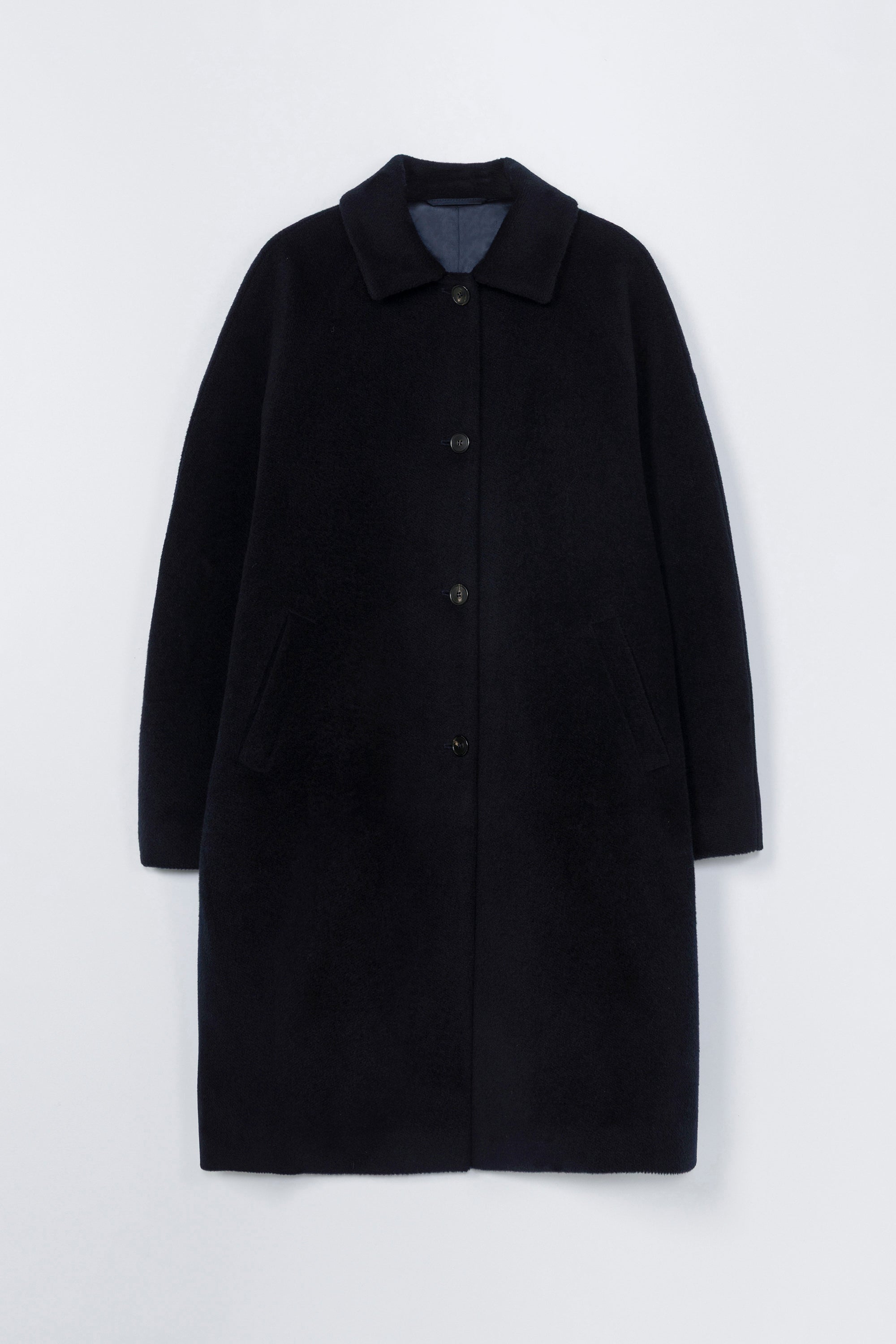 A classic everyday coat with a mid-length cut and an oversized fit, making it a comfortable wardrobe staple. Made from warm and soft, high quality Virgin Wool. Detailed with an Italian collar, front horn buttons, and side pockets. Finished with a fully lined interior in 100% Viscose.