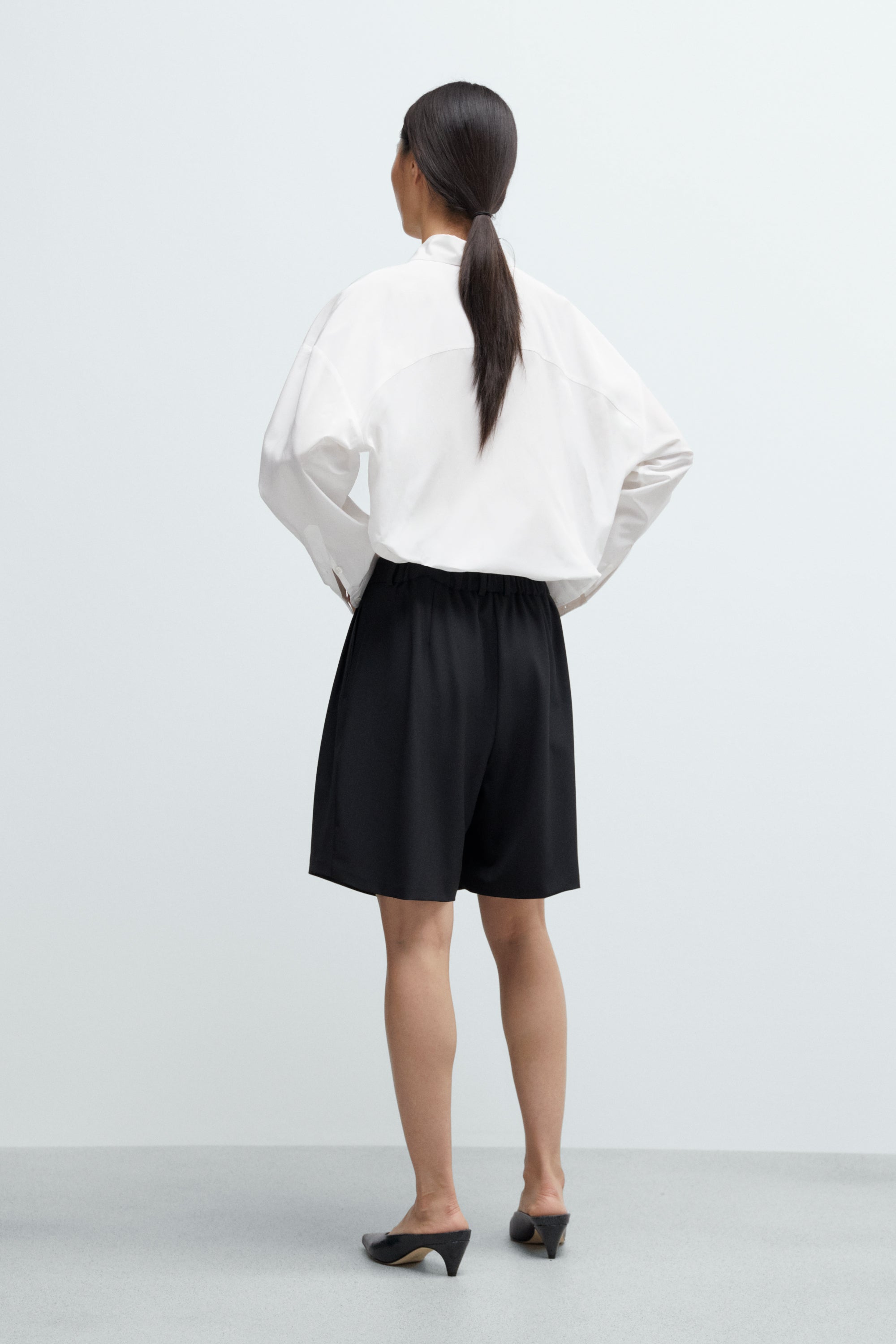 These tailored bermuda shorts feature a classic fit with a double pleat front and a length that sits just above the knee. Designed with belt loops and jetted side pockets, they offer a clean, streamlined look without back pockets. The elasticated waistband at the back ensures comfort, while the front button closure adds a polished finish. A versatile piece that blends modern tailoring with effortless ease.