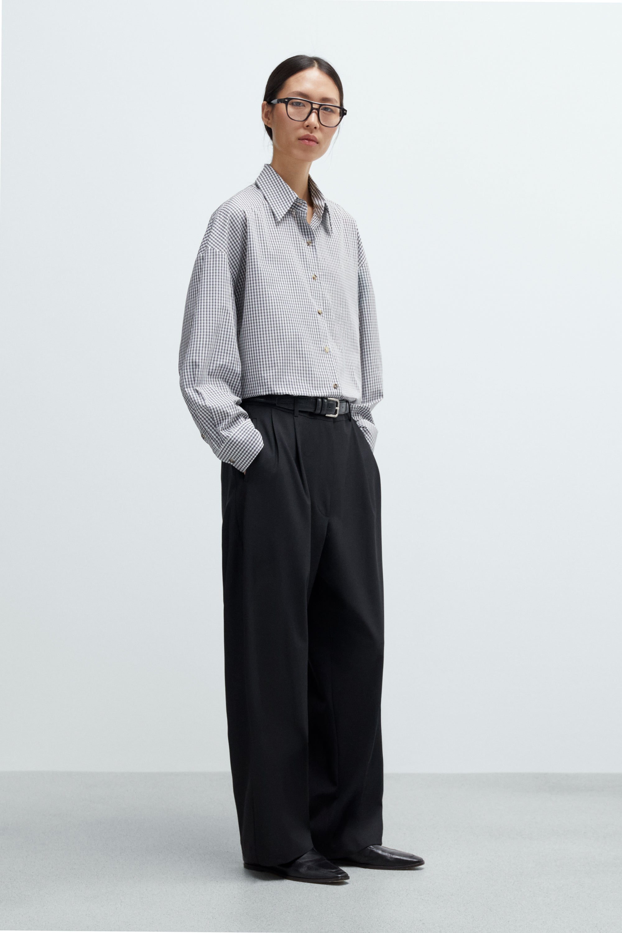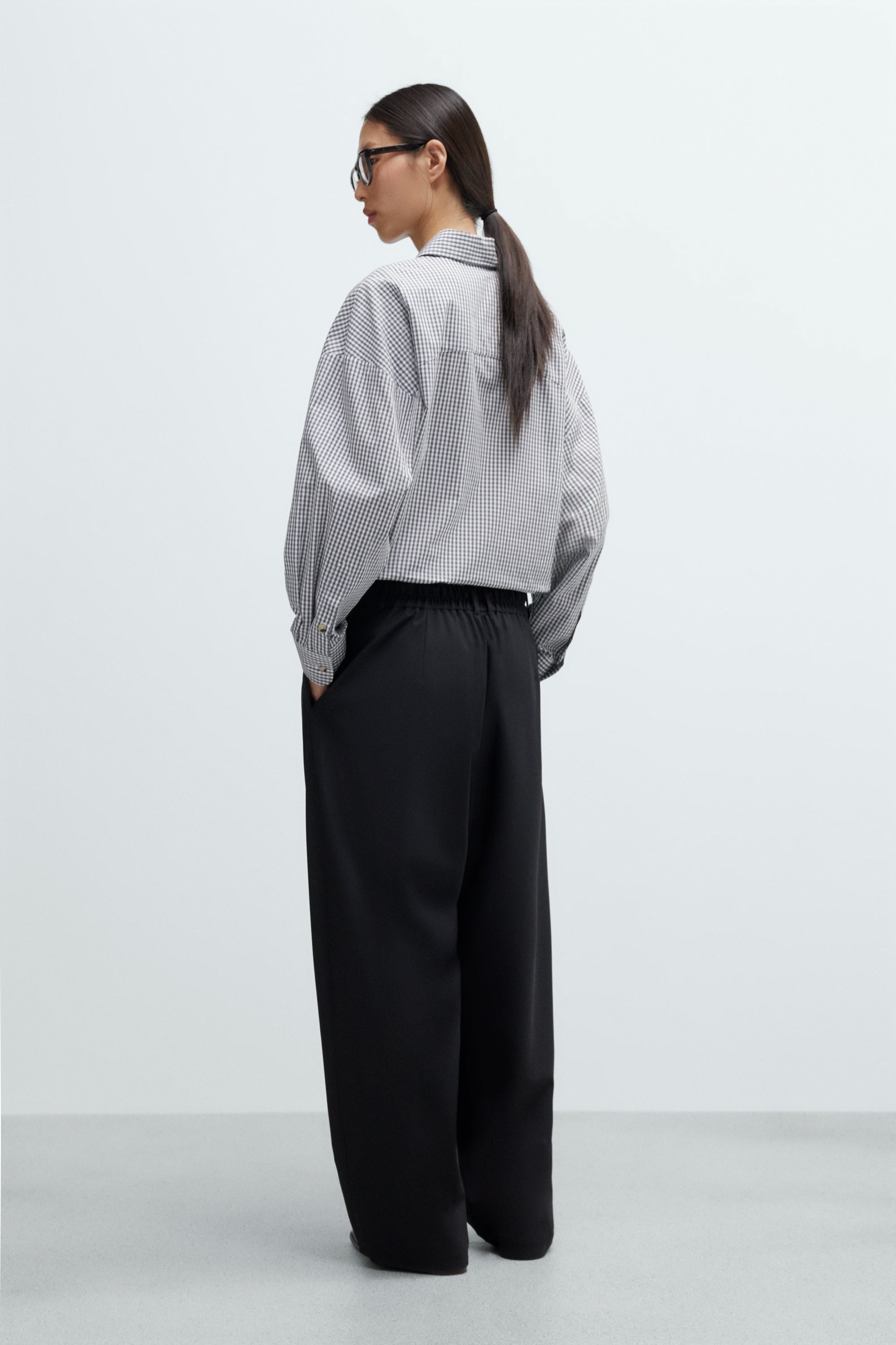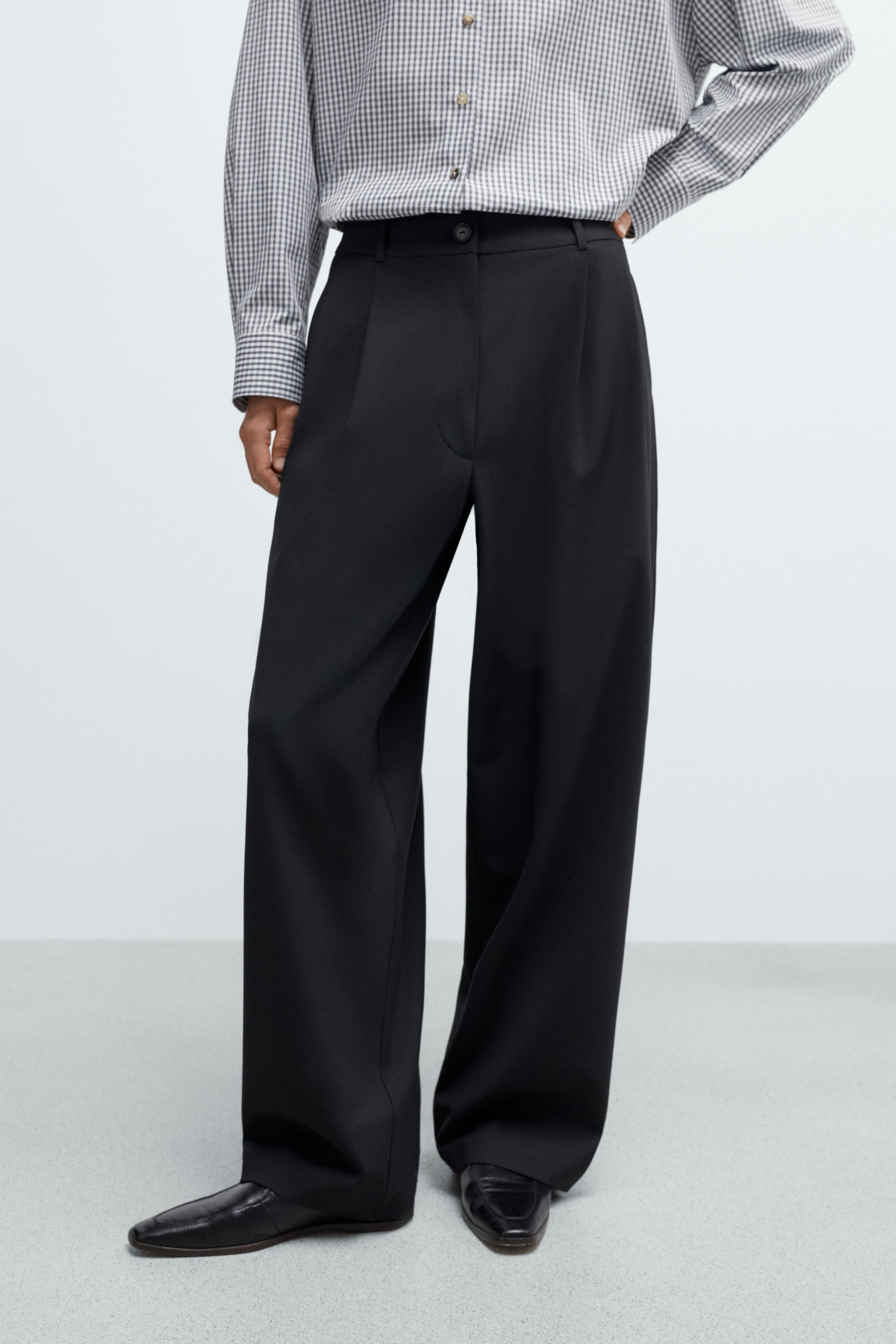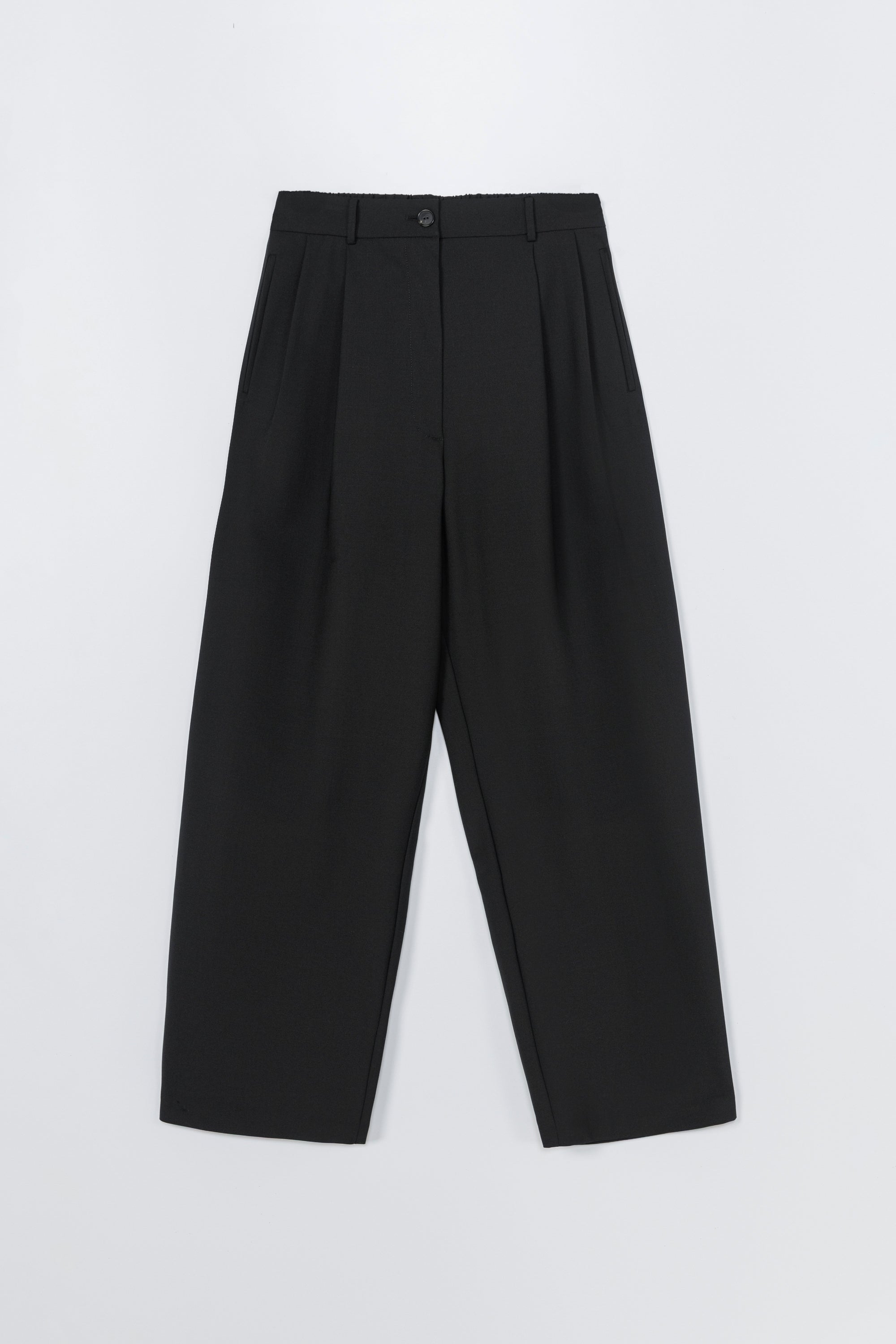 An elevated update of our iconic Tailored Masculine Pants, now featuring a higher waist and refined proportions for an even more flattering silhouette. Crafted from high-quality fabric with a timeless black tone, they maintain their signature loose, masculine fit with a mid-rise and double front pleats for added structure. Details include jetted side pockets, back welt pockets, an elasticated waistband at the back, zip and button closure, and belt loops. A year-round essential designed for effortless, modern dressing.