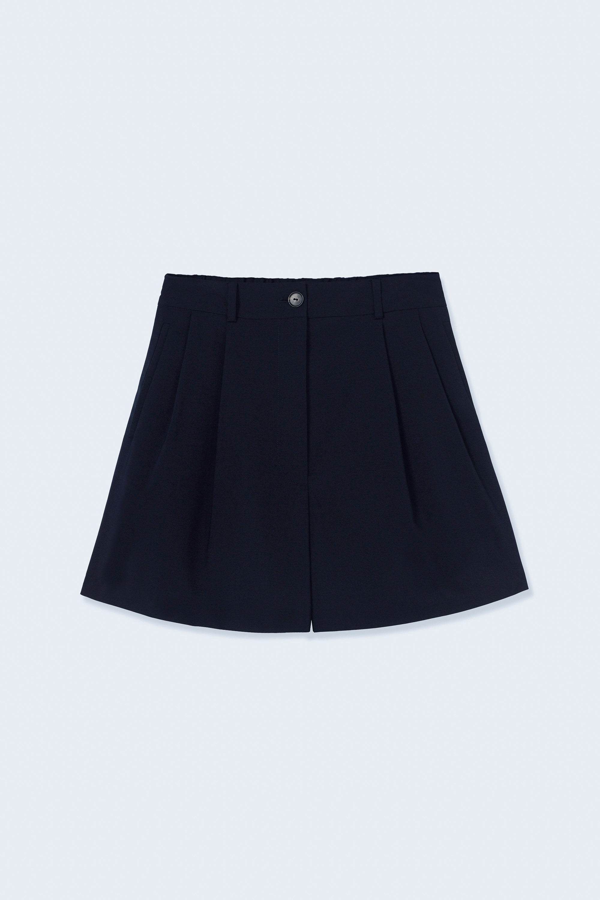 These tailored bermuda shorts feature a classic fit with a double pleat front and a length that sits just above the knee. Designed with belt loops and jetted side pockets, they offer a clean, streamlined look without back pockets. The elasticated waistband at the back ensures comfort, while the front button closure adds a polished finish. A versatile piece that blends modern tailoring with effortless ease.