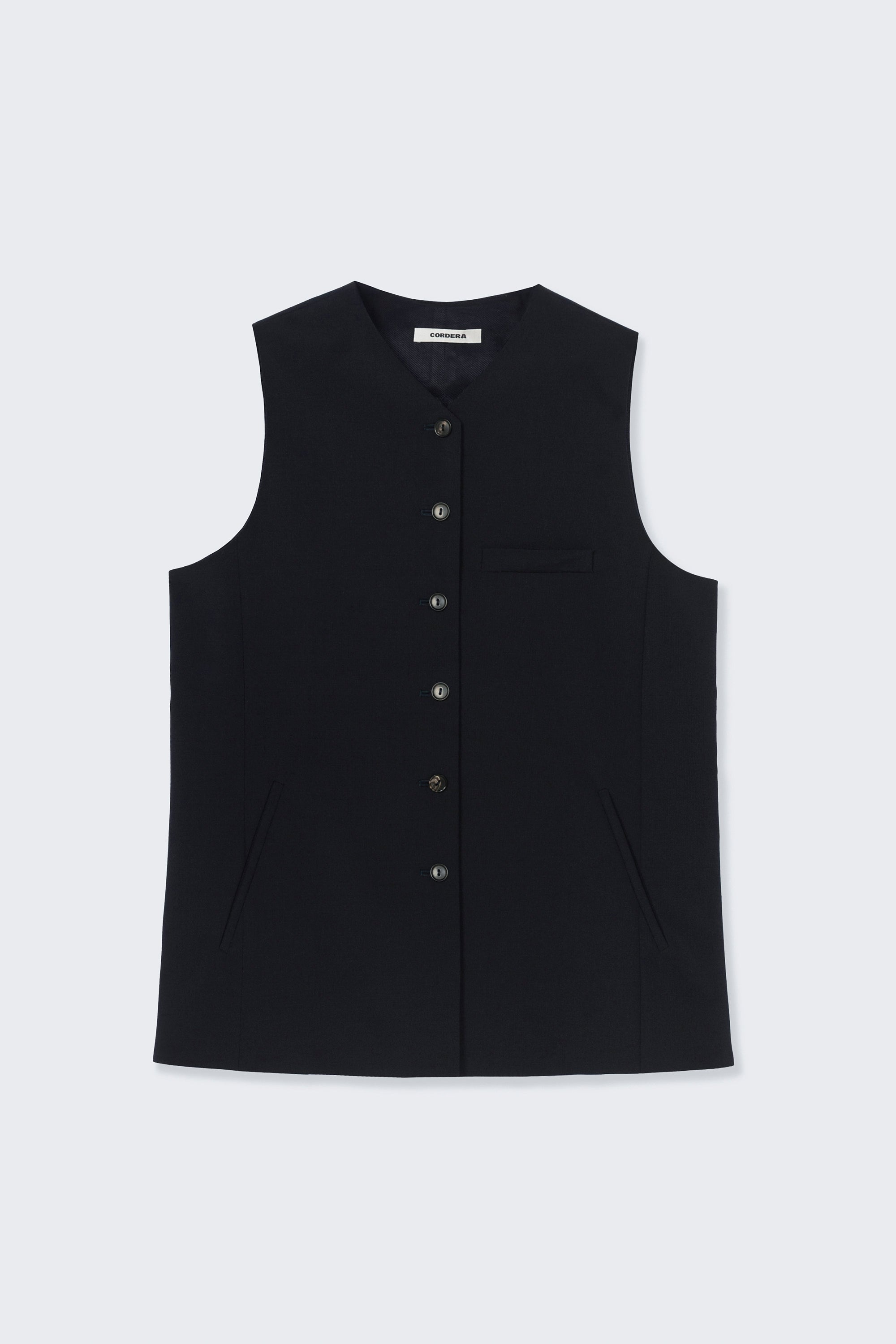 A classic tailored vest in a regular fit, featuring a front button closure and a sharp V-neck collar. Designed with a decorative false pocket and two sleek jetted side pockets, this versatile piece combines refined detailing with effortless style, perfect to wear with the pants as a set.