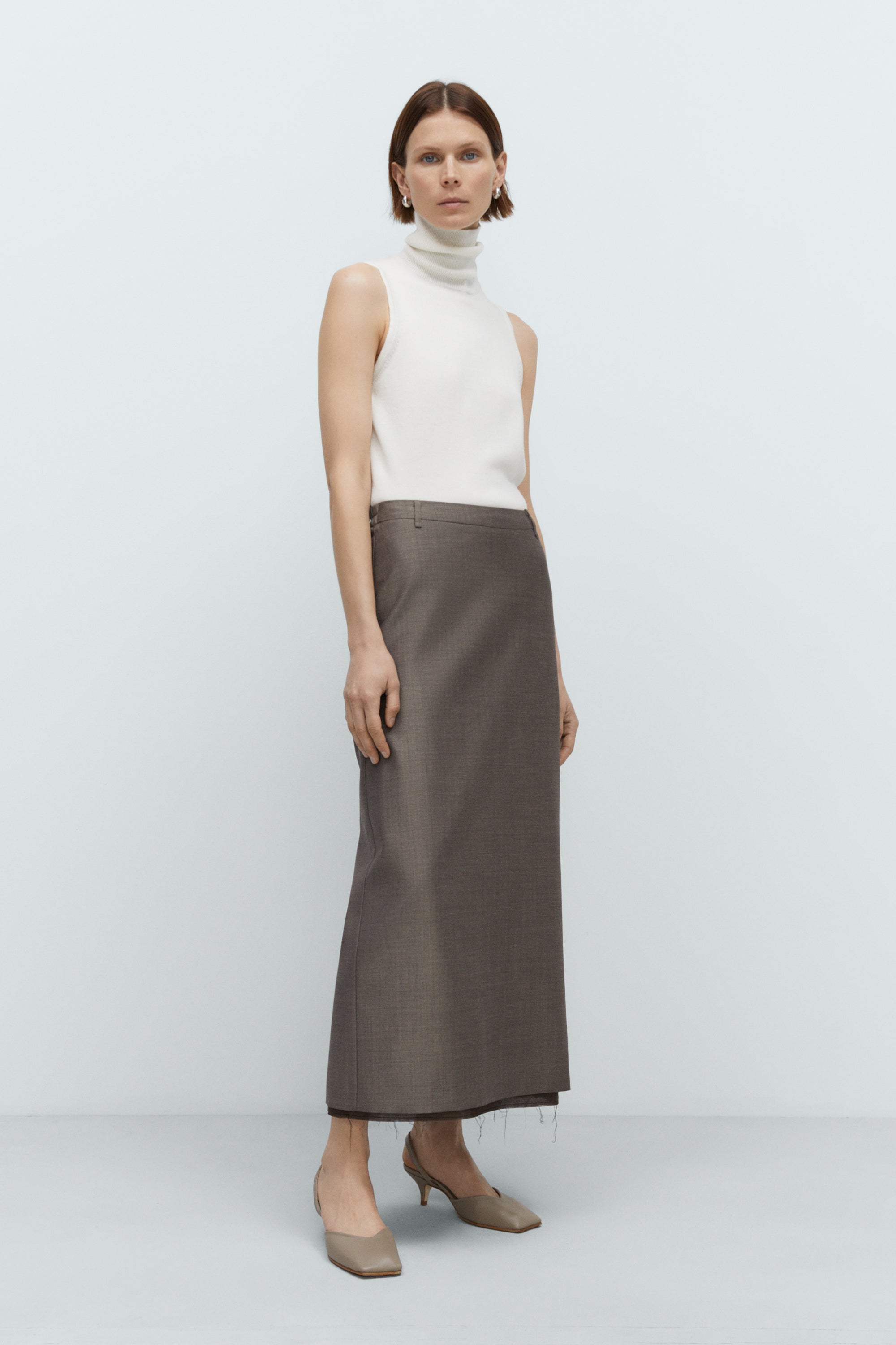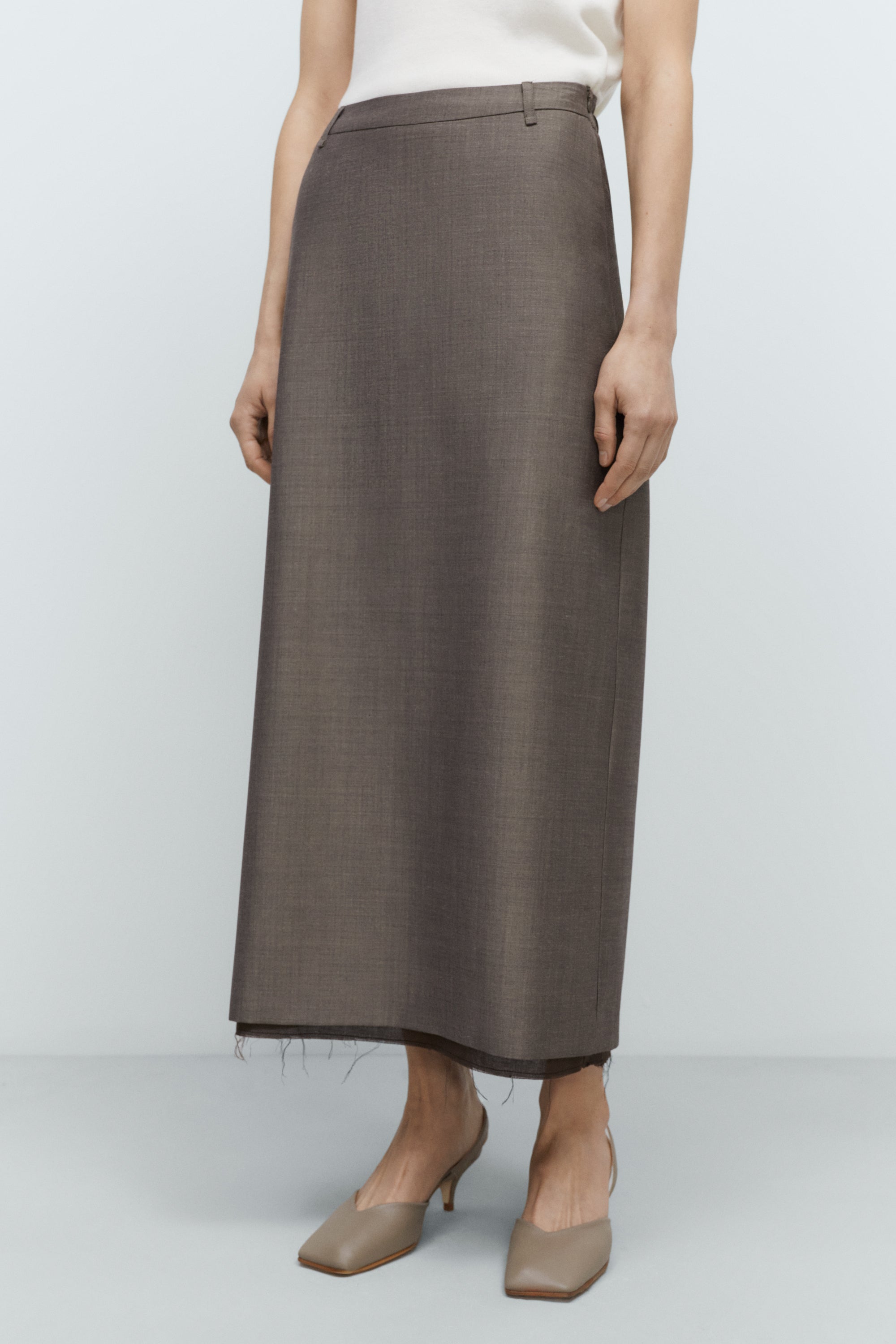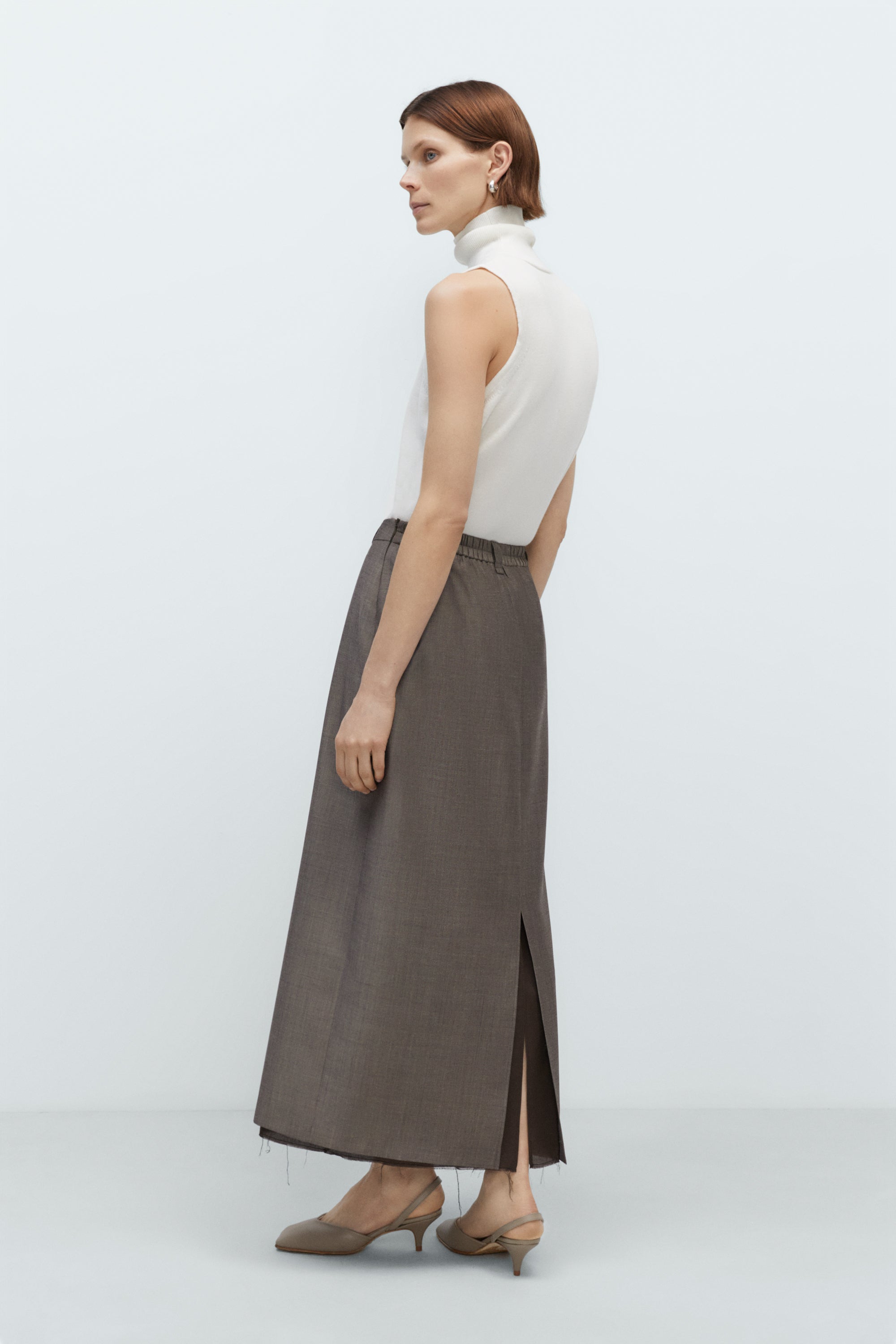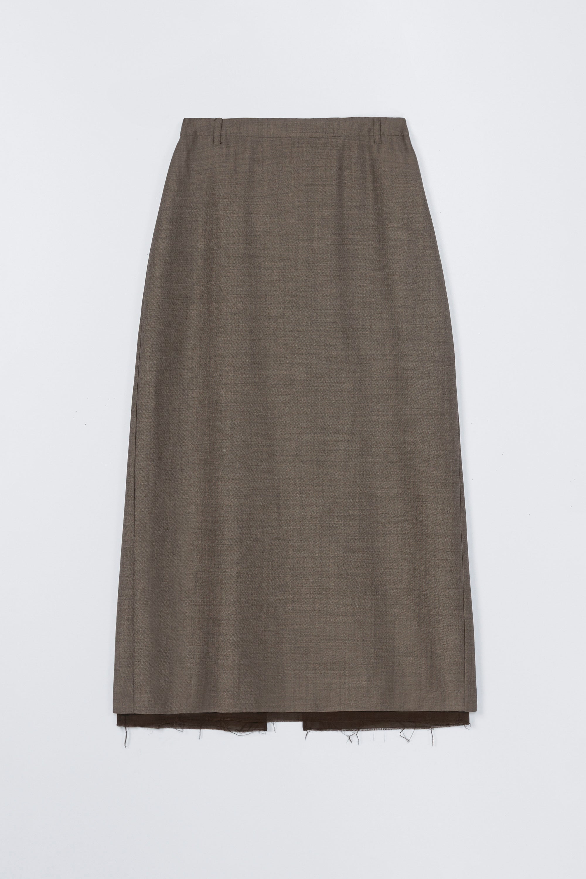A long skirt in anthracite tailoring fabric, lined with a brown lining intentionally "unfinished" and visible at the hem and the back slit. Detailed with belt loops, an elasticized waistband at the back, and a side zipper closure.